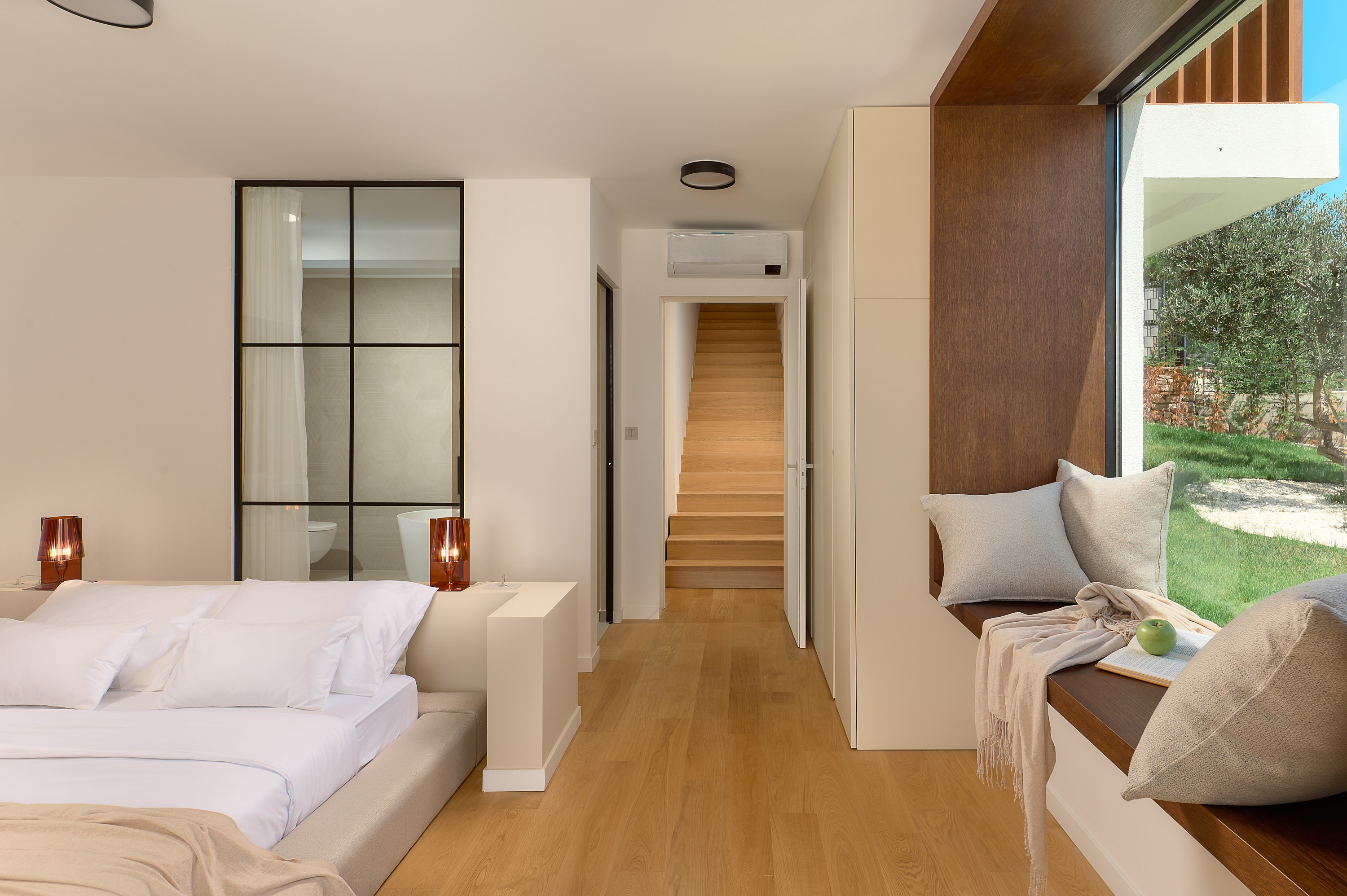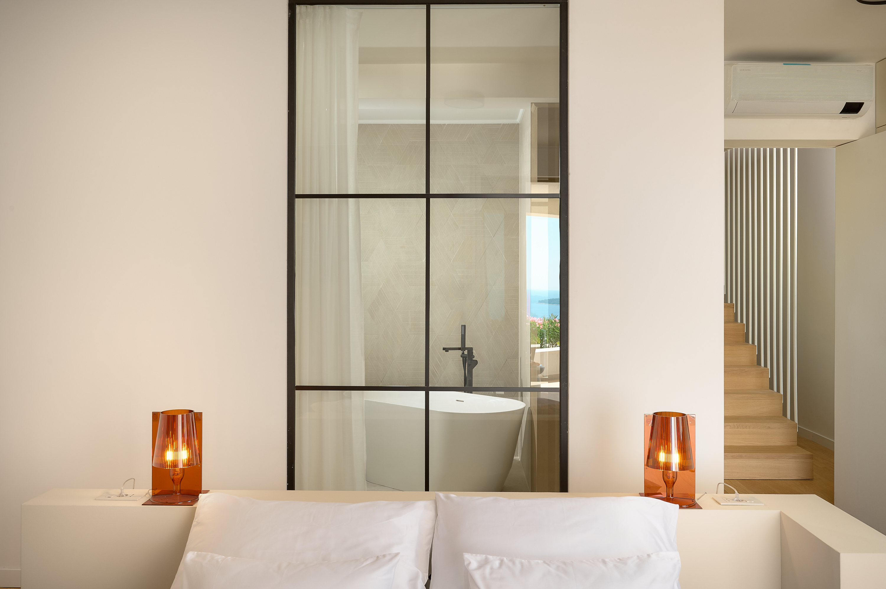 Der Innenbereich der Villa Five K wurde mit starkem Fokus auf moderne Eleganz, Komfort und offene Räume gestaltet. Der Hauptwohnraum verfügt über ein helles, offenes Konzept, in dem die voll ausgestattete Küche, der stilvolle Essbereich und das großzügige Wohnzimmer nahtlos zu einem harmonischen Ambiente verschmelzen. Große Glasfronten rahmen den spektakulären Meerblick ein und fluten die Villa mit Tageslicht, wodurch eine luftige und luxuriöse Atmosphäre entsteht. Hochwertige Möbel, ein Smart-TV und eine edle Innengestaltung sorgen für ein erstklassiges Wohnerlebnis. Die Villa Five K bietet sechs wunderschön gestaltete Schlafzimmer, die jeweils mit hochwertigen Betten, Smart-TVs und Klimaanlage ausgestattet sind. Moderne Materialien, Walk-In-Duschen und klare architektonische Linien verleihen jedem Badezimmer einen anspruchsvollen und eleganten Charakter. Ein eigener Entertainment-Raum, ausgestattet mit einer PlayStation-Konsole, einem Billardtisch und Tischfußball, sorgt für zusätzliche Unterhaltung und Entspannung für Familien und Gruppen — und macht den Innenbereich ideal für Gäste jeden Alters.