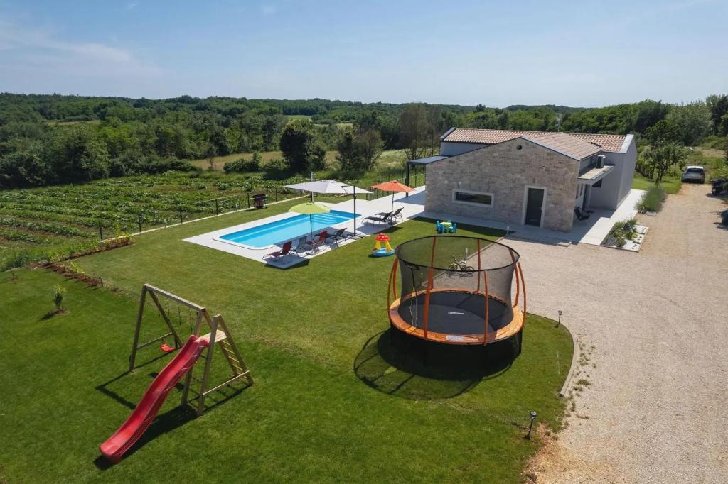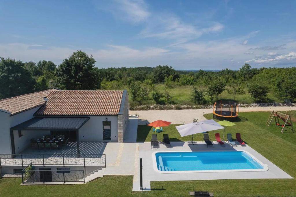 Das weitläufige Grundstück von 5000 m2 dieser Villa in Istrien wird Sie ebenso begeistern wie der Panoramablick auf die wunderschöne Natur in der Umgebung. Der Hof wird von einem 34 m² großen Swimmingpool dominiert und auf der Terrasse können Sie sich auf einer der Sonnenliegen sonnen oder im Schatten unter einem Sonnenschirm entspannen. Eine Außendusche ist ebenfalls vorhanden. Daneben befindet sich das Esszimmer im Freien, das mit dem Außengrill eine ideale Kombination für ein Essen an der frischen Luft mit Blick in die Natur darstellt. Für Kinder stehen Schaukeln, ein Trampolin und Fußballtore zur Verfügung. Ein Fahrrad steht den Gästen ebenfalls zur Verfügung. Die großen Rasenflächen rund um die Villa Levak sind ein idealer Ort für verschiedene sportliche Aktivitäten für die gesamte Gruppe.