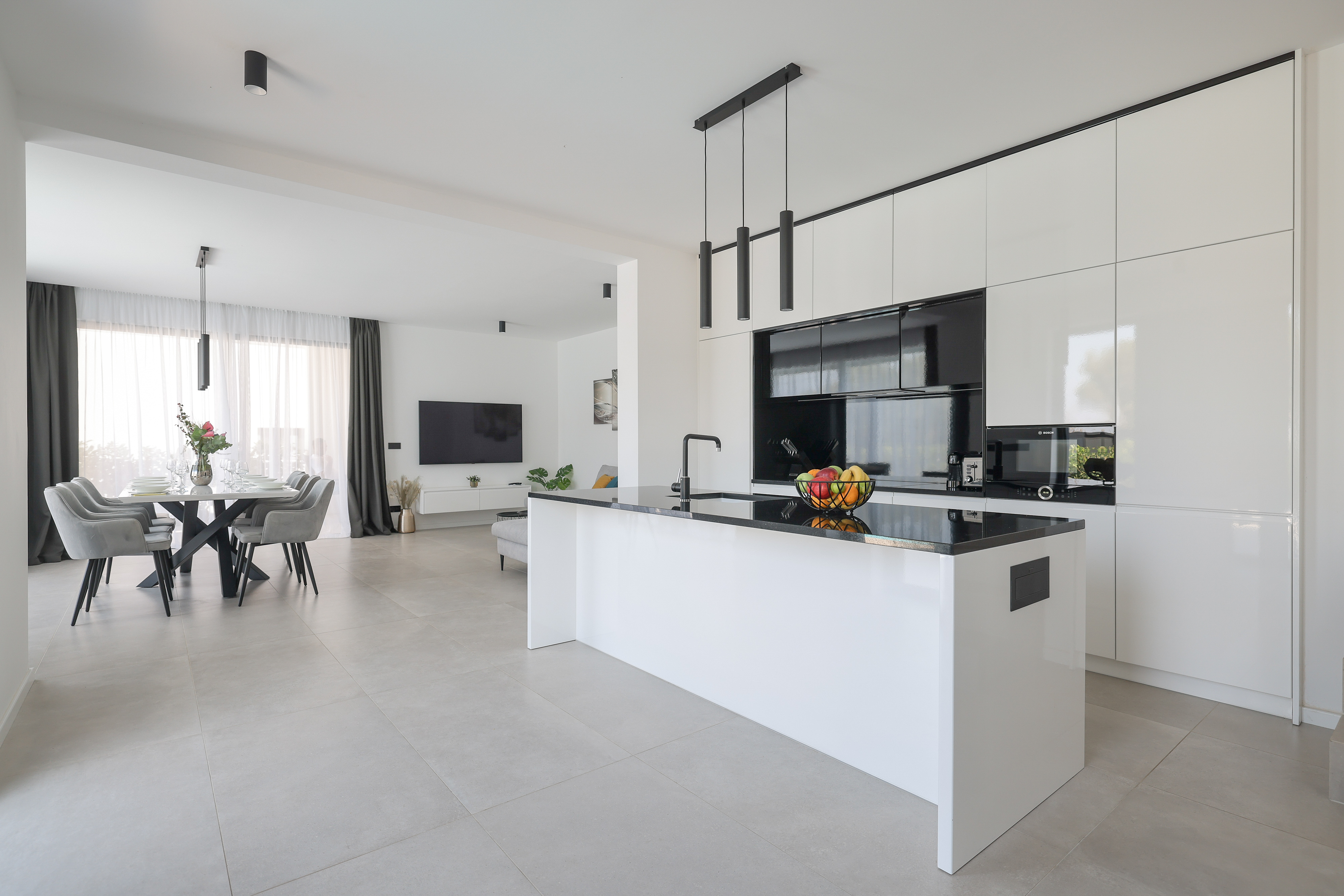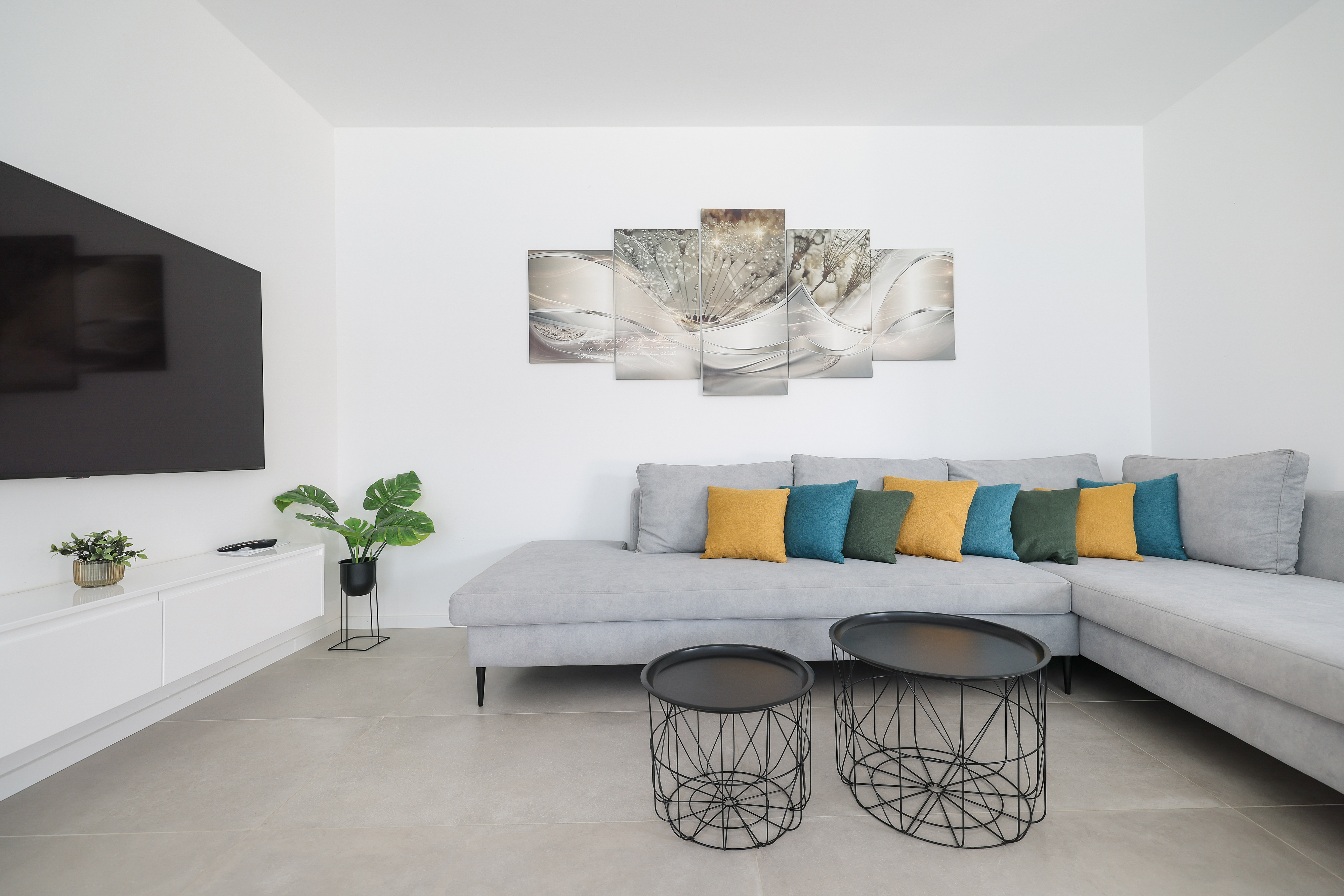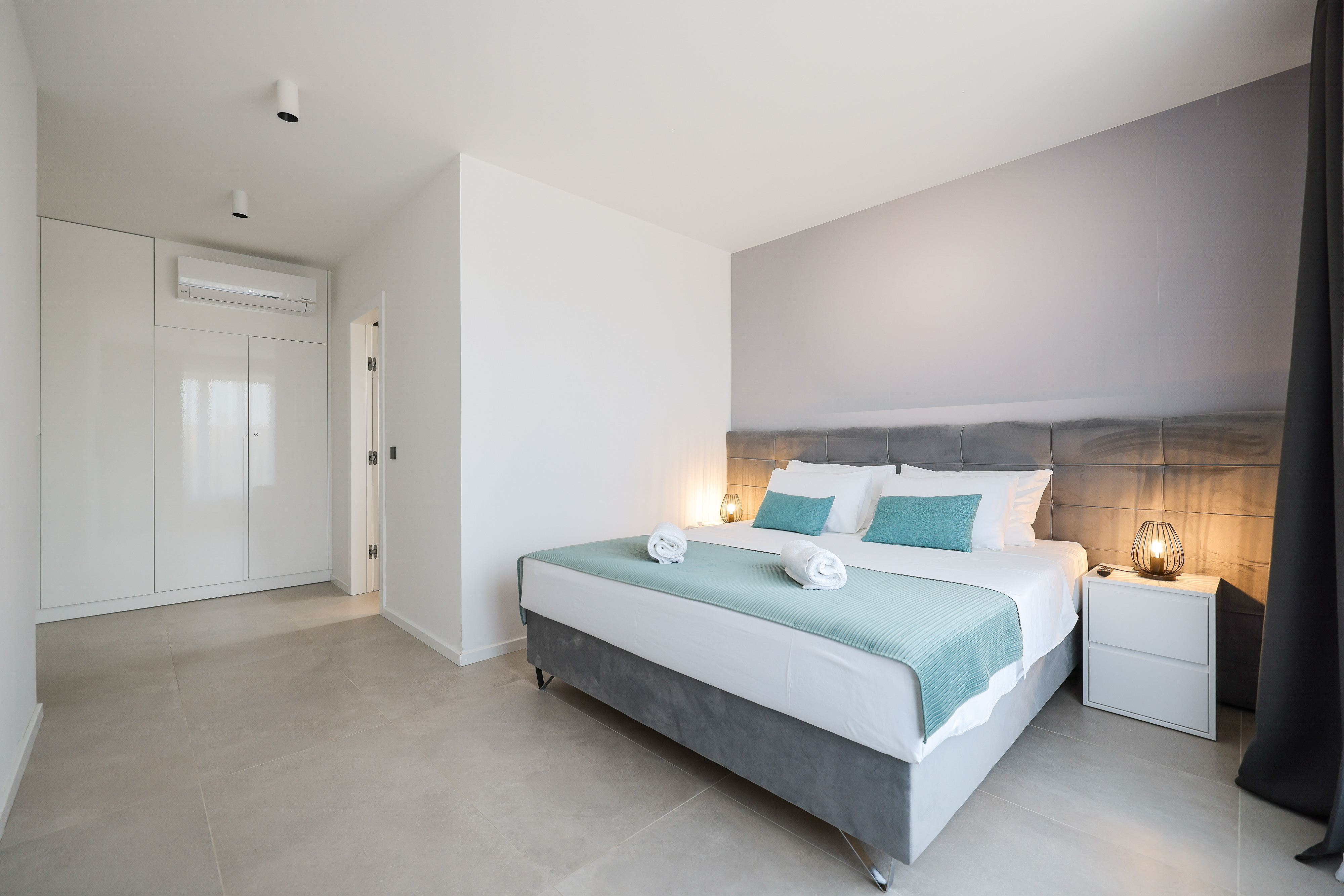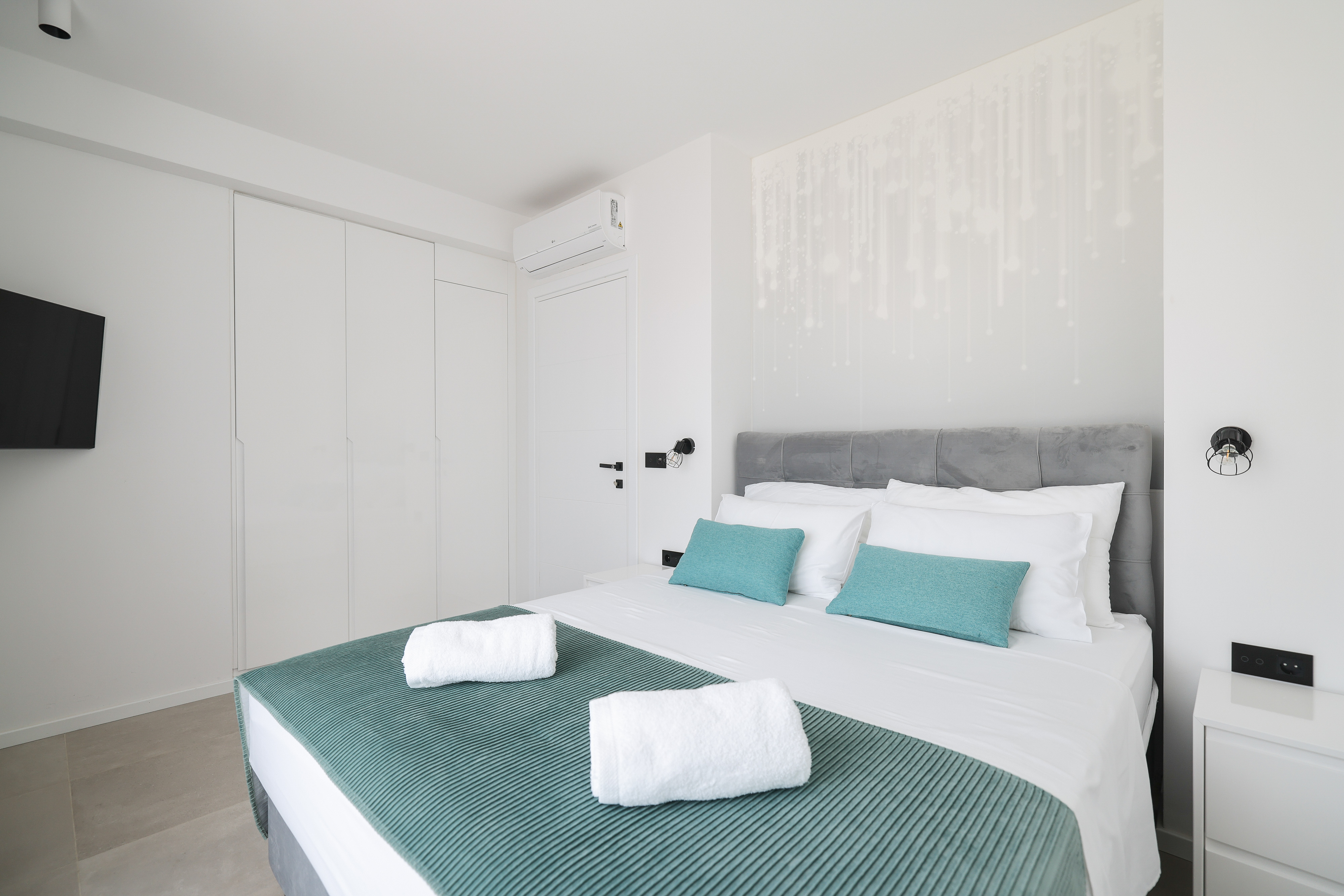 Das Innere der Villa strahlt modernen Stil und Komfort aus. Das geräumige Wohnzimmer mit Smart-TV öffnet sich direkt zur Poolterrasse und ist mit einer voll ausgestatteten Küche und einem Essbereich verbunden. Die Küche verfügt über einen Geschirrspüler, eine Mikrowelle, einen Wasserkocher, einen Toaster, einen Mixer, einen Blender und eine Kaffeemaschine. Den Gästen stehen außerdem eine Waschmaschine, ein Trockner, ein Bügeleisen und ein Bügelbrett zur Verfügung. Alle vier Schlafzimmer sind mit Doppelbetten (drei 180x200 cm und eines 160x200 cm), Smart-TVs und Klimaanlagen ausgestattet, und jedes verfügt über ein eigenes Badezimmer. Handtücher, Bettwäsche und Haartrockner sind vorhanden. Familien mit kleinen Kindern finden ein Babybett und einen Hochstuhl vor.