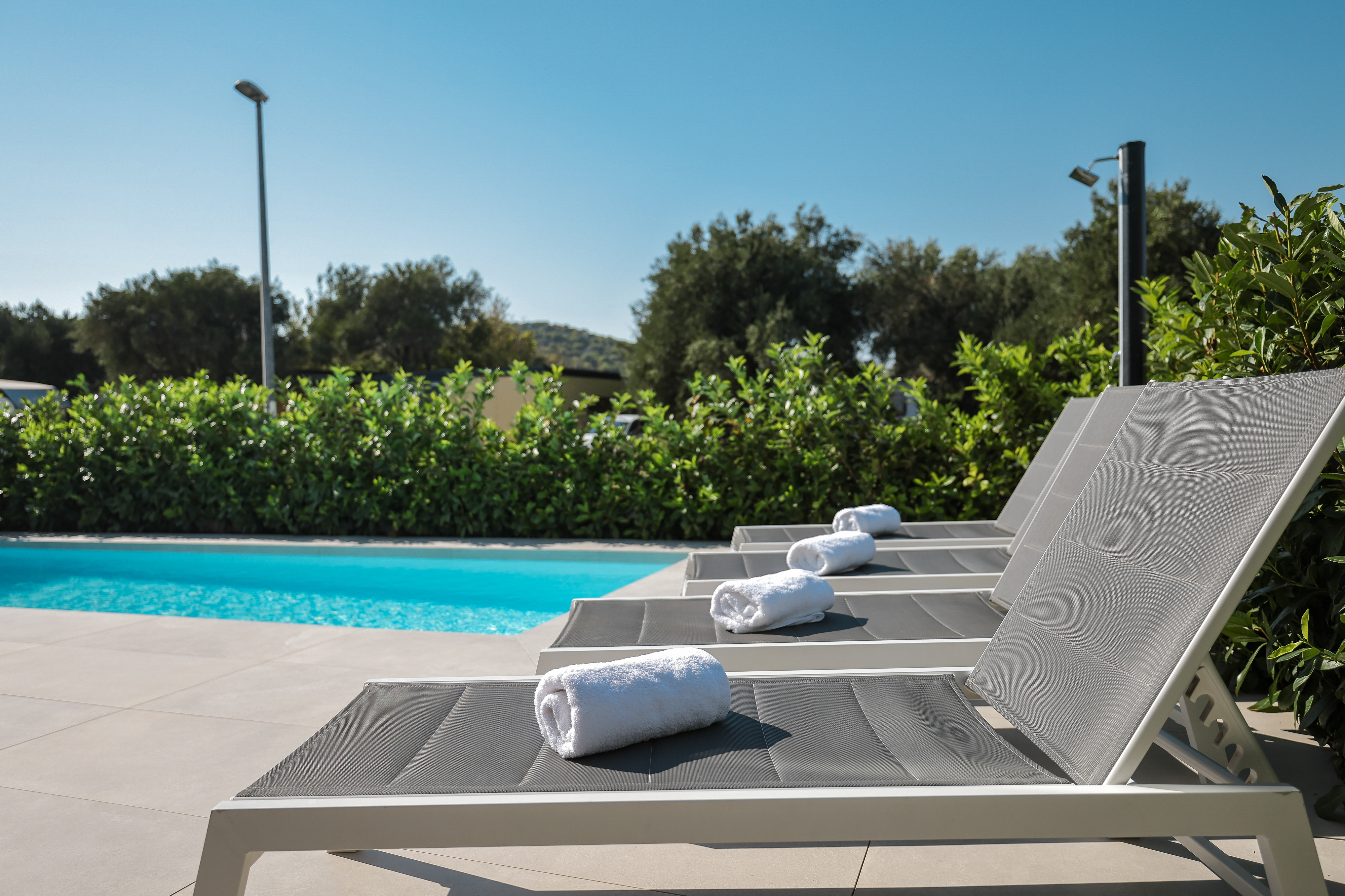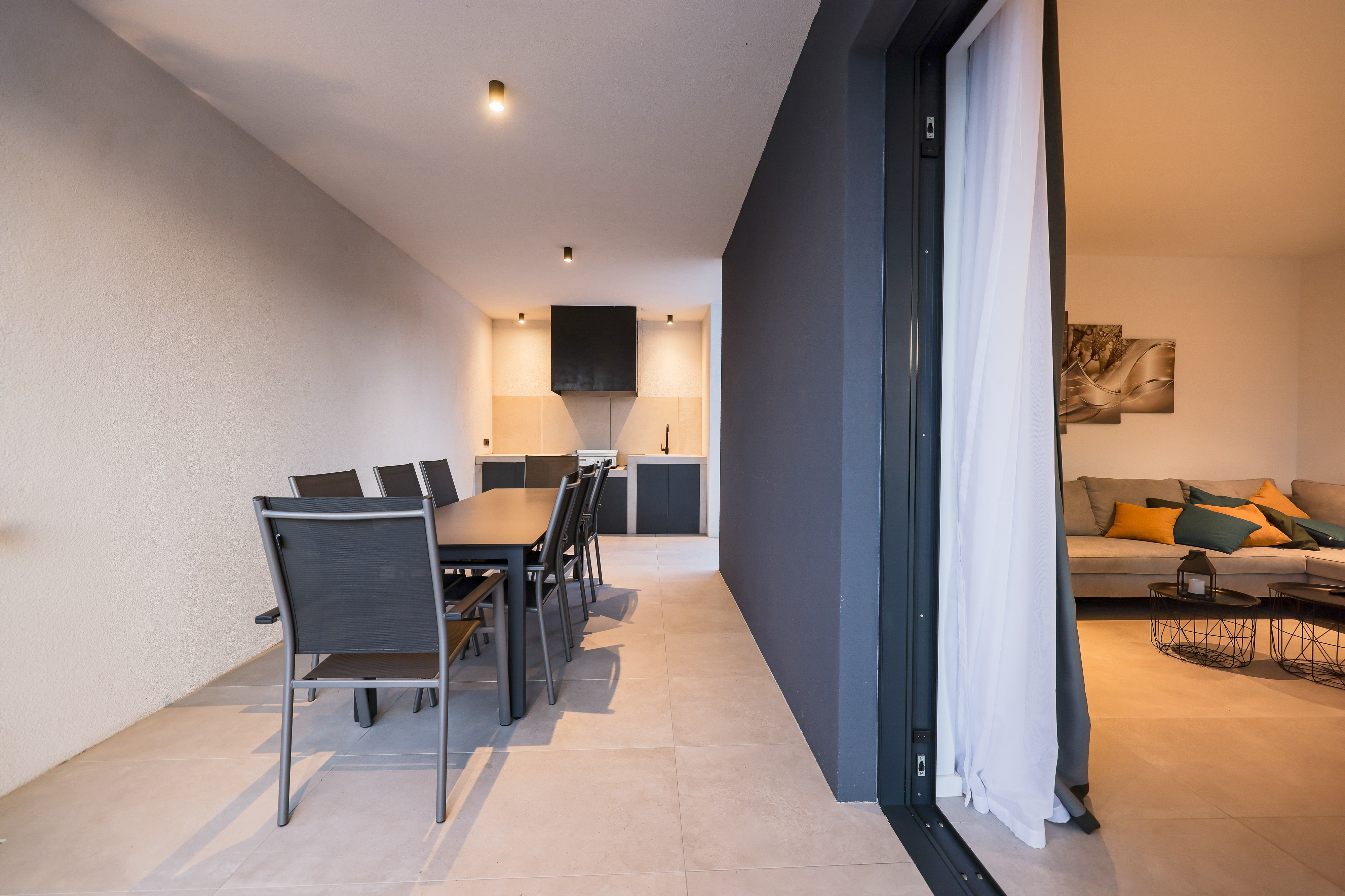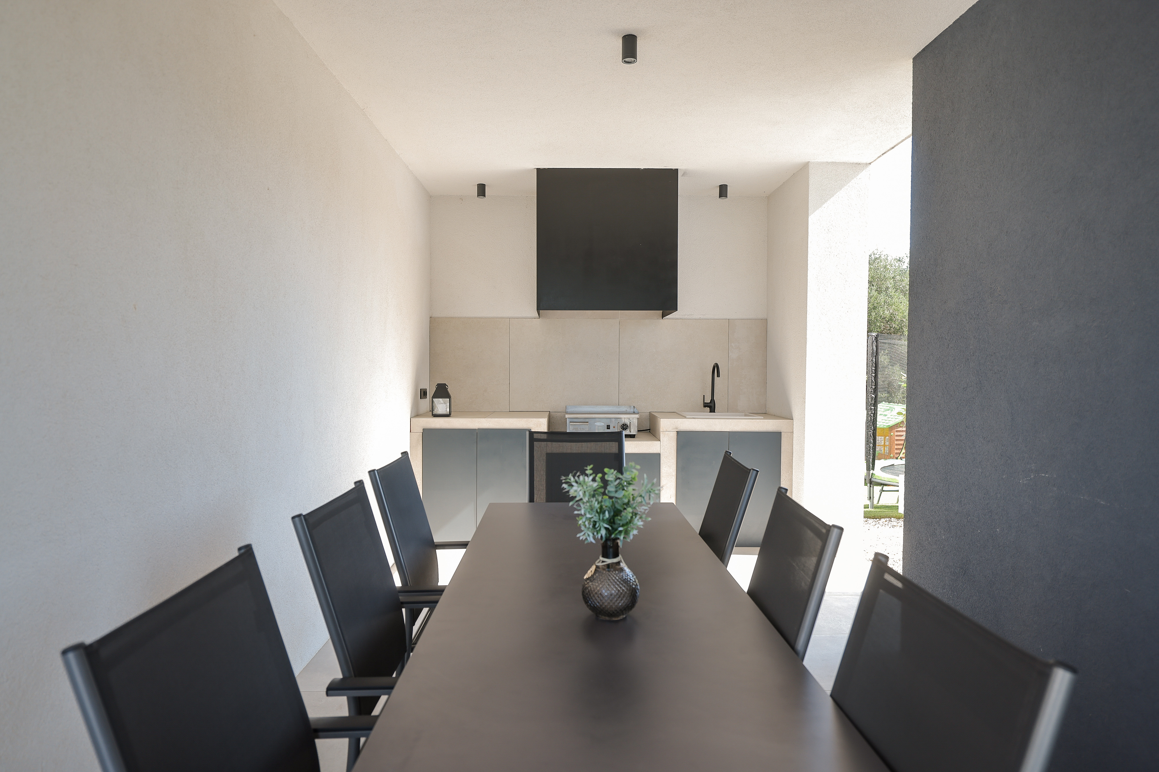 Der Außenbereich der Villa Magic Sky 1 ist für ultimative Entspannung und Genuss gestaltet. Ein privater, beheizter Pool, umgeben von bequemen Sonnenliegen, lädt zum Entspannen unter der mediterranen Sonne ein. Die Gäste können köstliche Mahlzeiten in der Sommerküche mit Grill zubereiten und im schattigen Essbereich im Freien genießen. Der eingezäunte Garten verfügt über eine Rasenfläche, eine Außendusche sowie Zugang zu einem Kinderspielplatz und einem Badmintonbereich, die gemeinsam mit der Nachbarvilla Magic Sky 2 genutzt werden. Da das Meer nur 50 Meter entfernt ist, können die Gäste problemlos zwischen einem Bad im Pool und dem Entspannen am nahegelegenen Strand wechseln.