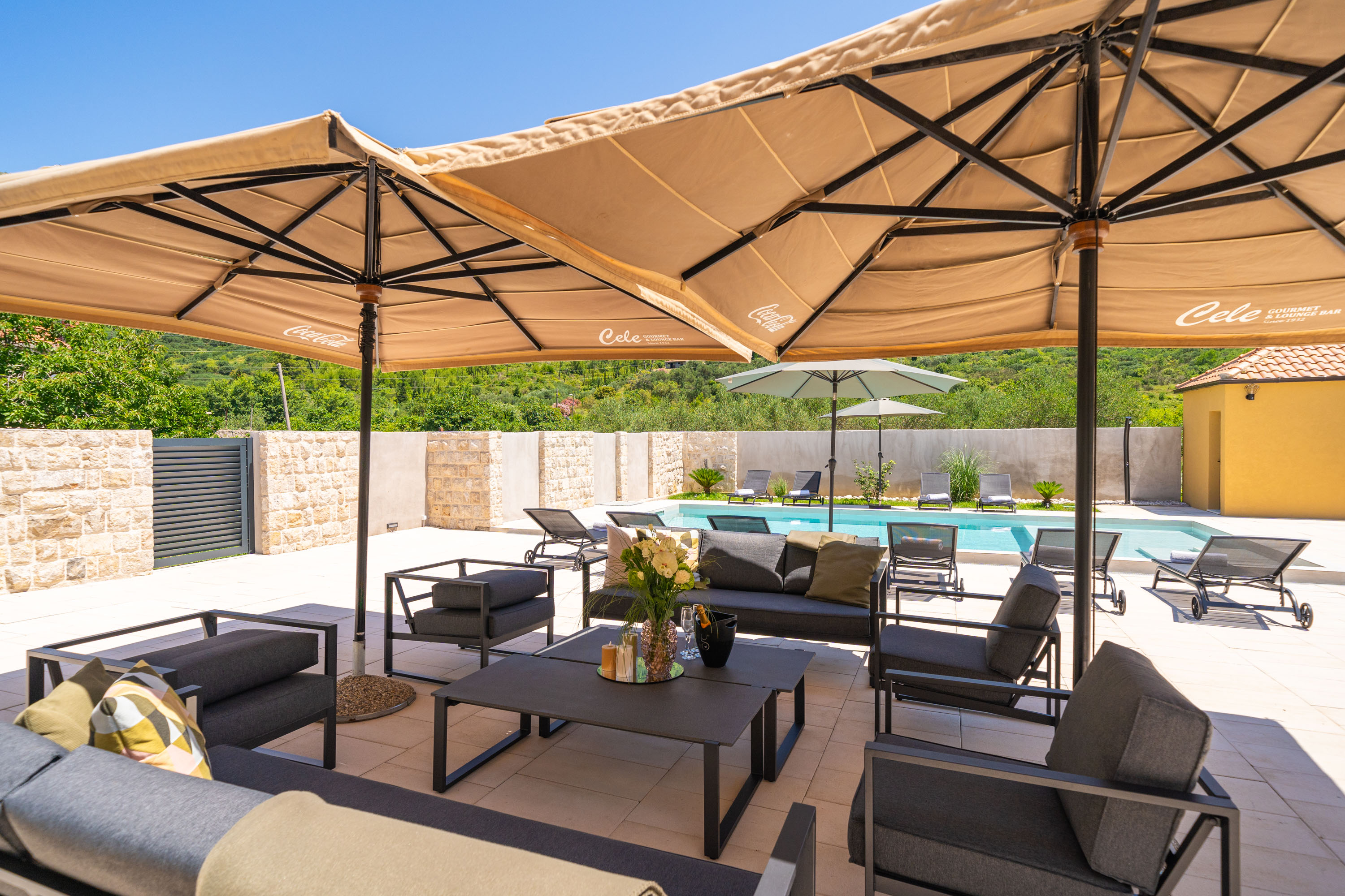 Der großzügige Außen- und Innenraum ist groß genug für eine Gruppe von bis zu 12 Gästen. Der große Garten wird von einem 50 m² großen Swimmingpool dominiert und die Poolterrasse bietet ausreichend Platz zum Ausruhen und für verschiedene Outdoor-Aktivitäten. Am Pool stehen Liegestühle bereit, und wenn Sie sich lieber im Schatten ausruhen möchten, können Sie unter einem Sonnenschirm sitzen. Eine Außendusche ist ebenfalls vorhanden. Die Sommerküche ist reichhaltig mit allen Geräten ausgestattet und es gibt auch einen Kamin mit Grill. Der Essbereich im Freien befindet sich direkt neben der Küche. Der Bereich der Sommerküche und des Esszimmers ist überdacht, was diesen Ort zu einem idealen Ort für die Zubereitung aller Gerichte macht und ein Essen im Schatten an der frischen Luft ermöglicht. Auf der Terrasse stehen außerdem Gartenmöbel, ein idealer Ort, um den ersten Morgenkaffee mit Blick auf die grünen Hügel in der Ferne zu trinken. Auf den Rasenflächen können Sie sich beim Basketballspielen oder anderen sportlichen Aktivitäten vergnügen.