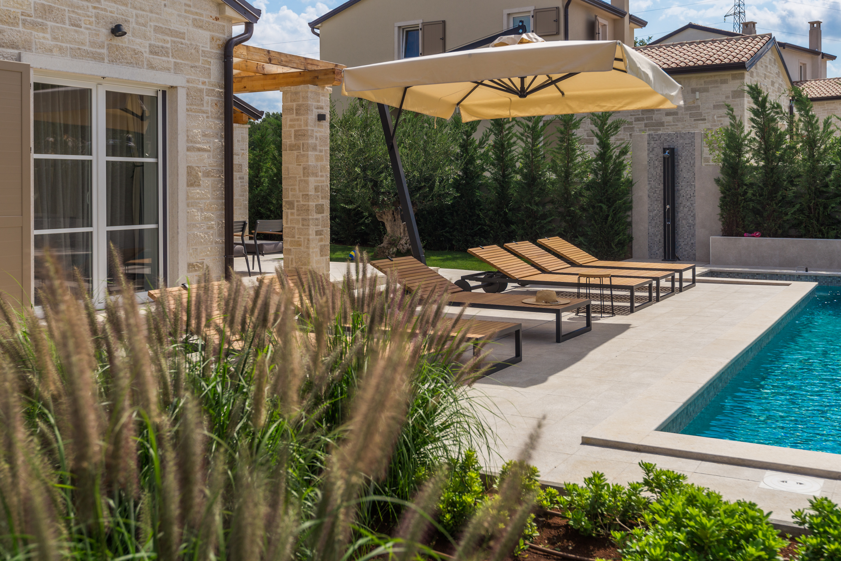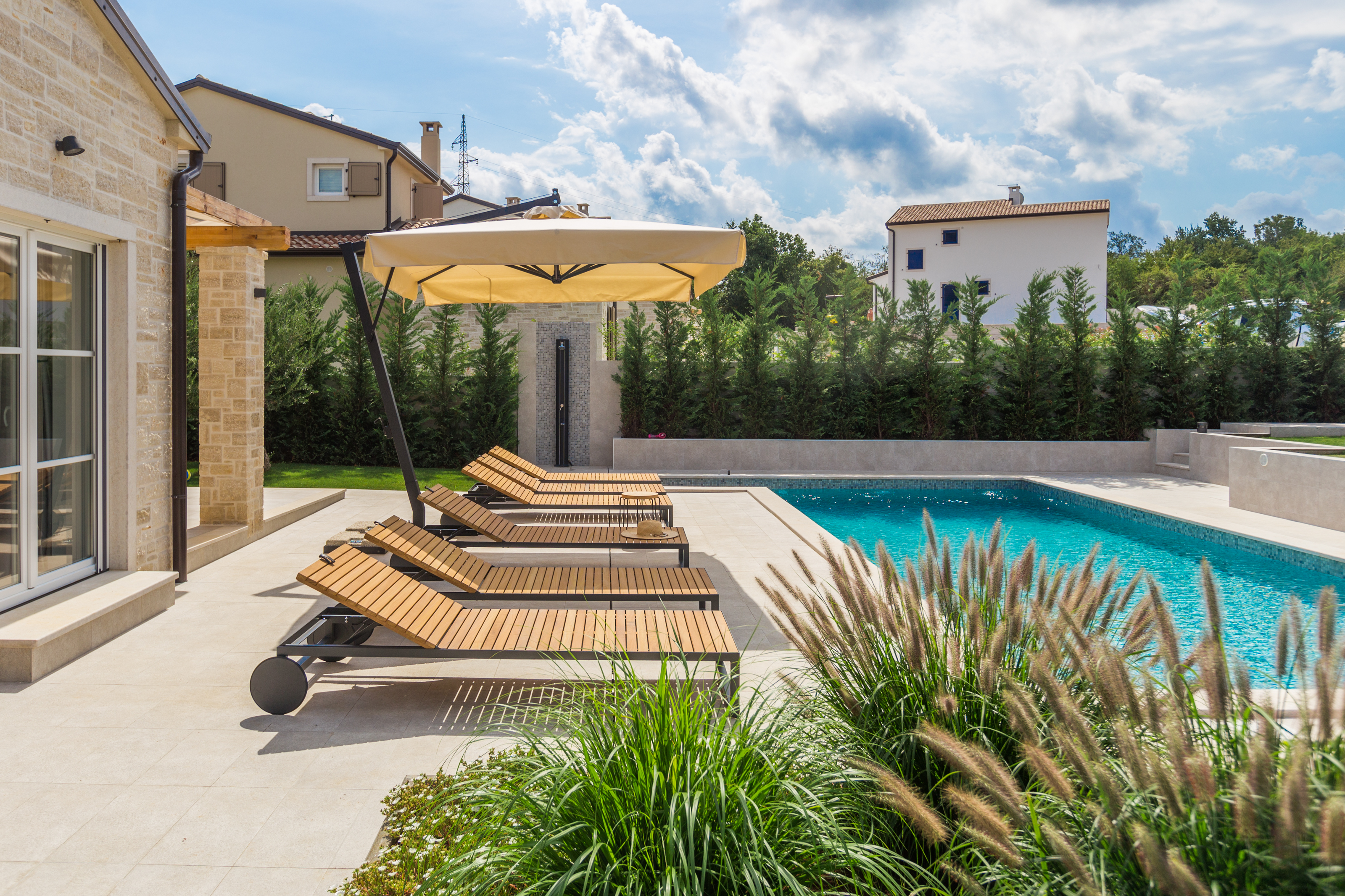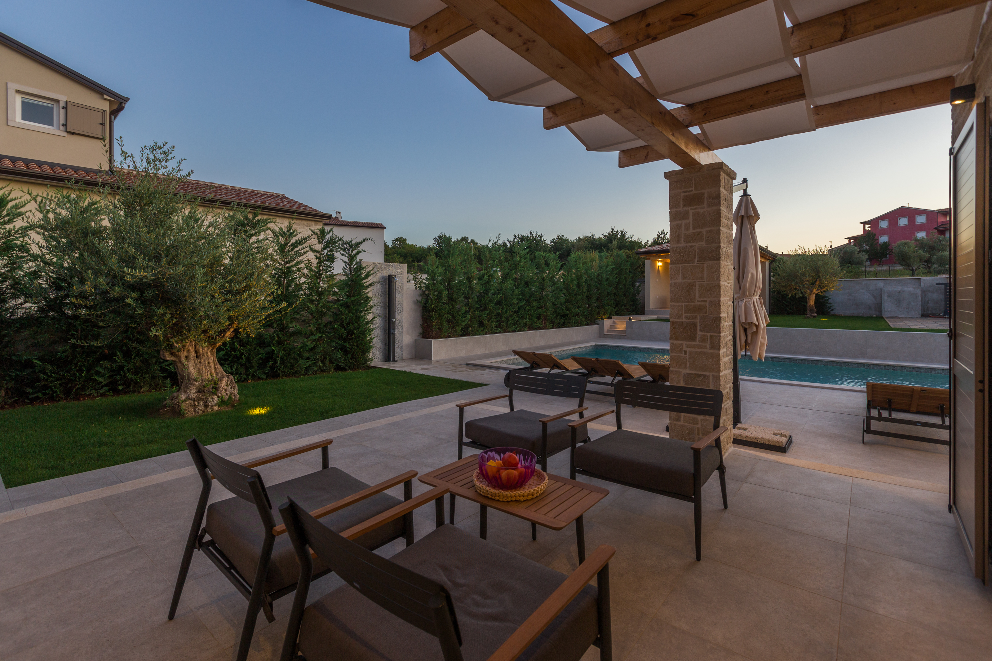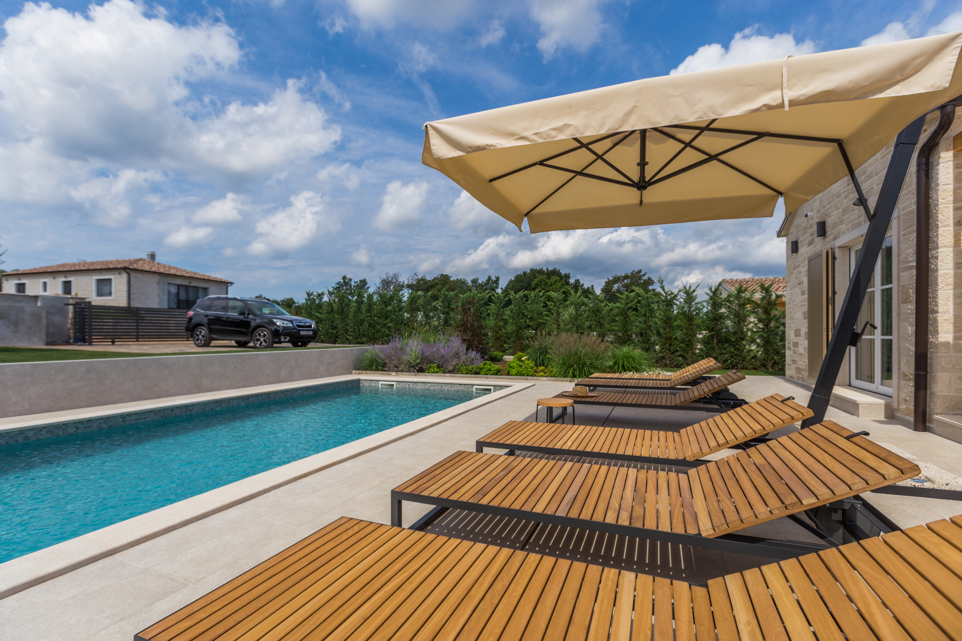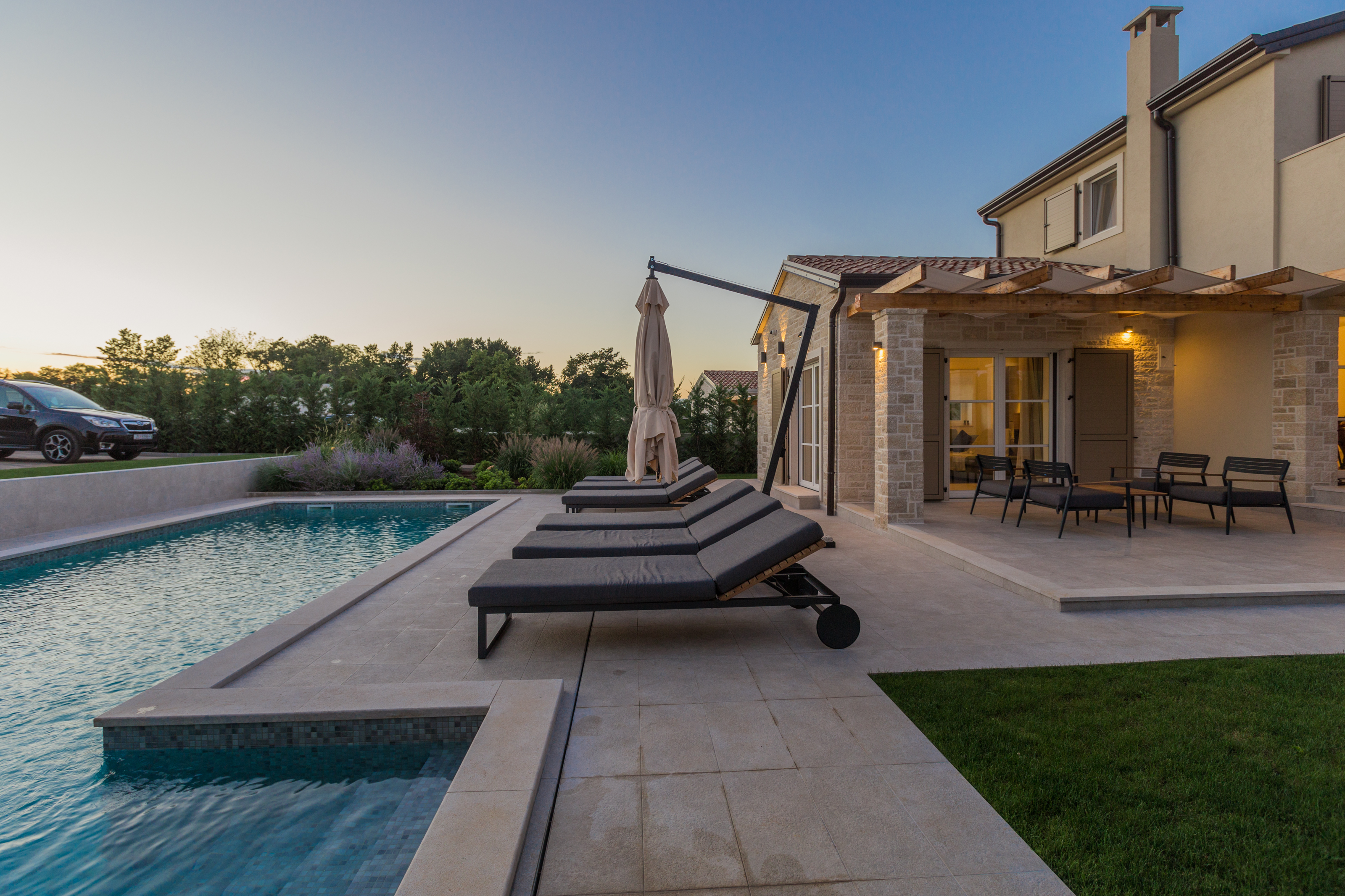 Der Außenbereich der Villa No.18 ist für völlige Entspannung und Genuss gestaltet. Der 40 m² große, beheizte Pool mit Hydromassagedüsen lädt die Gäste ein, sich unter der istrischen Sonne zu erholen und zu erfrischen. Rund um den Pool können die Gäste auf sechs Sonnenliegen entspannen oder ein Getränk im schattigen Loungebereich genießen. Der überdachte Essbereich im Freien mit einem großen Esstisch sowie einer separaten Sommerküche mit Holzkohlegrill, Spüle und Beleuchtung ist ideal, um gemeinsam Mahlzeiten zuzubereiten und zu genießen. Das gesamte Grundstück ist eingezäunt (1,7 m hoch) und von gepflegtem Grün mit automatischer Bewässerung umgeben, was Privatsphäre und eine ruhige Umgebung für die Gäste bietet.