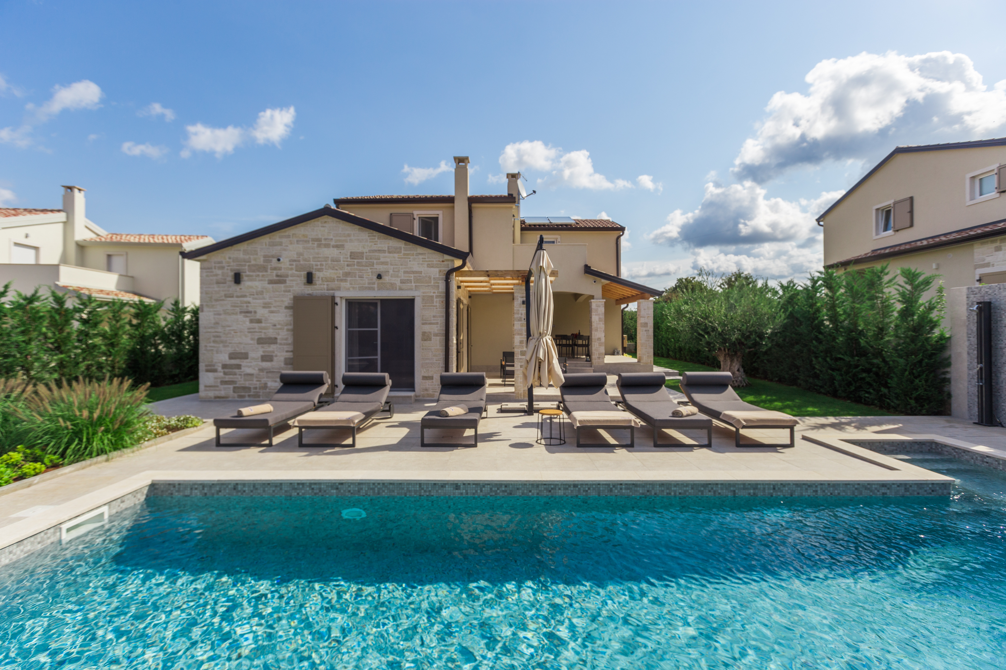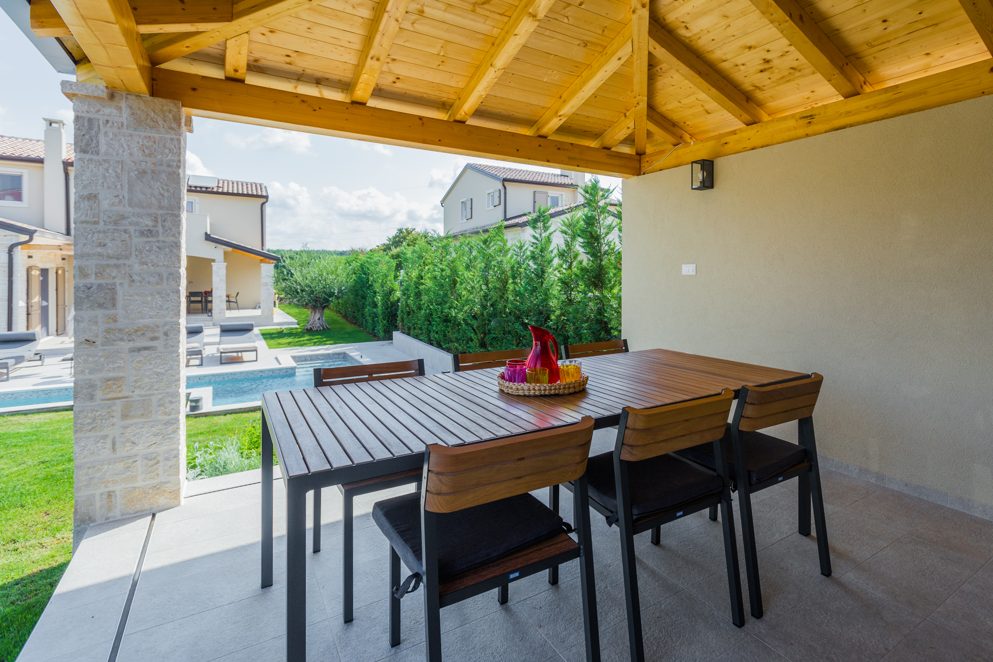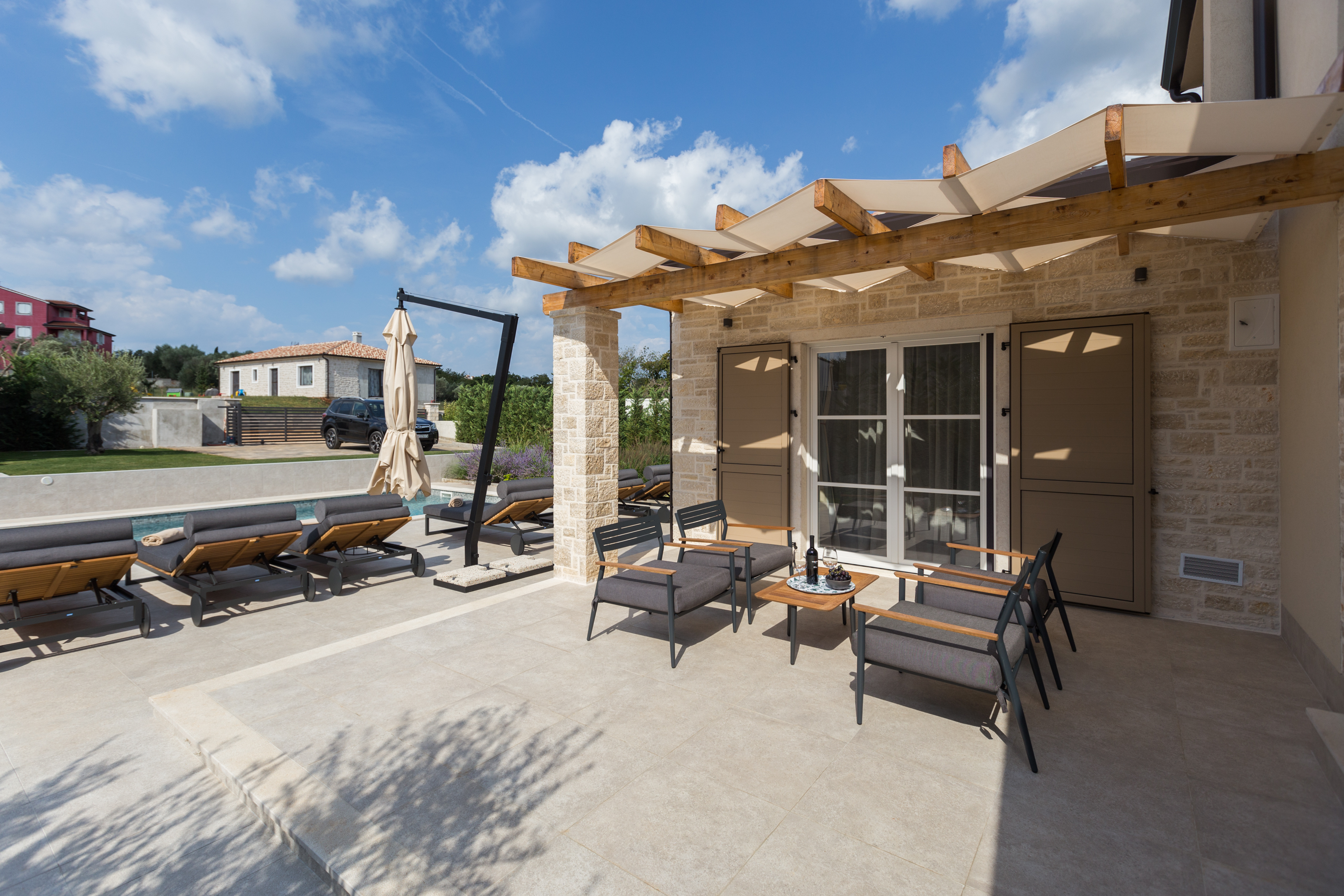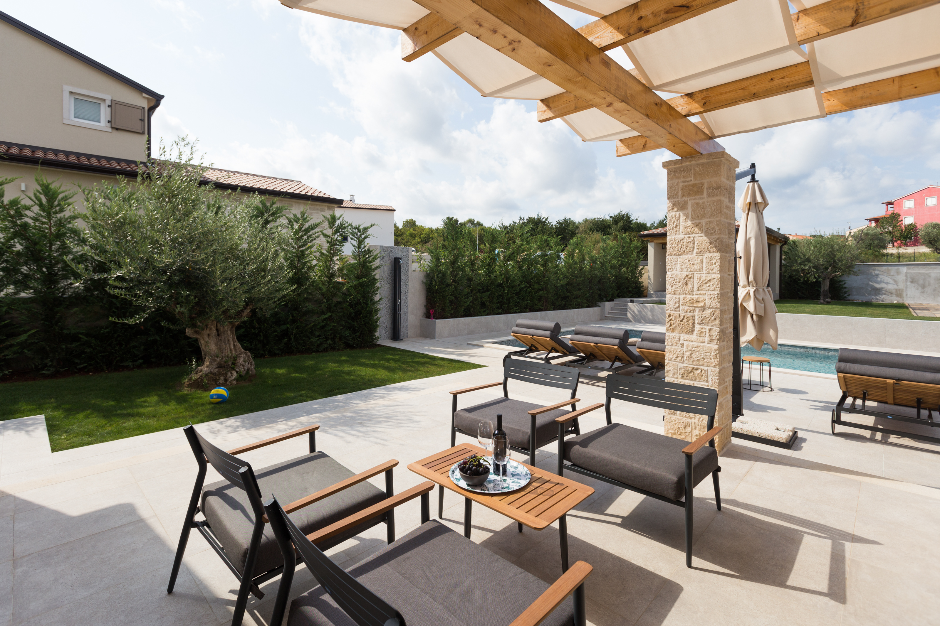 Der Außenbereich der Villa No.18 ist für völlige Entspannung und Genuss gestaltet. Der 40 m² große, beheizte Pool mit Hydromassagedüsen lädt die Gäste ein, sich unter der istrischen Sonne zu erholen und zu erfrischen. Rund um den Pool können die Gäste auf sechs Sonnenliegen entspannen oder ein Getränk im schattigen Loungebereich genießen. Der überdachte Essbereich im Freien mit einem großen Esstisch sowie einer separaten Sommerküche mit Holzkohlegrill, Spüle und Beleuchtung ist ideal, um gemeinsam Mahlzeiten zuzubereiten und zu genießen. Das gesamte Grundstück ist eingezäunt (1,7 m hoch) und von gepflegtem Grün mit automatischer Bewässerung umgeben, was Privatsphäre und eine ruhige Umgebung für die Gäste bietet.