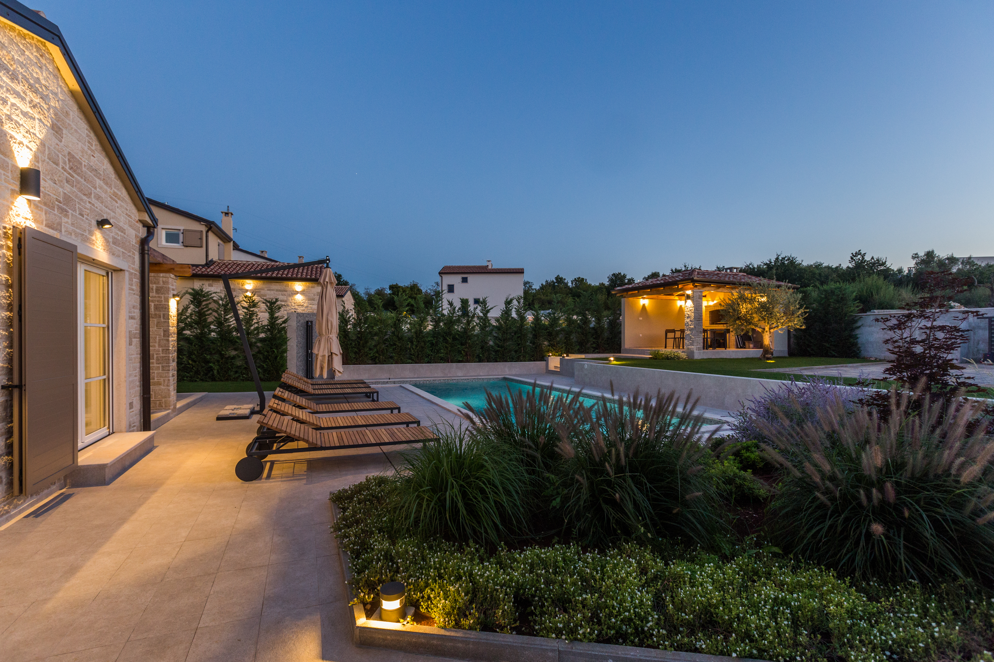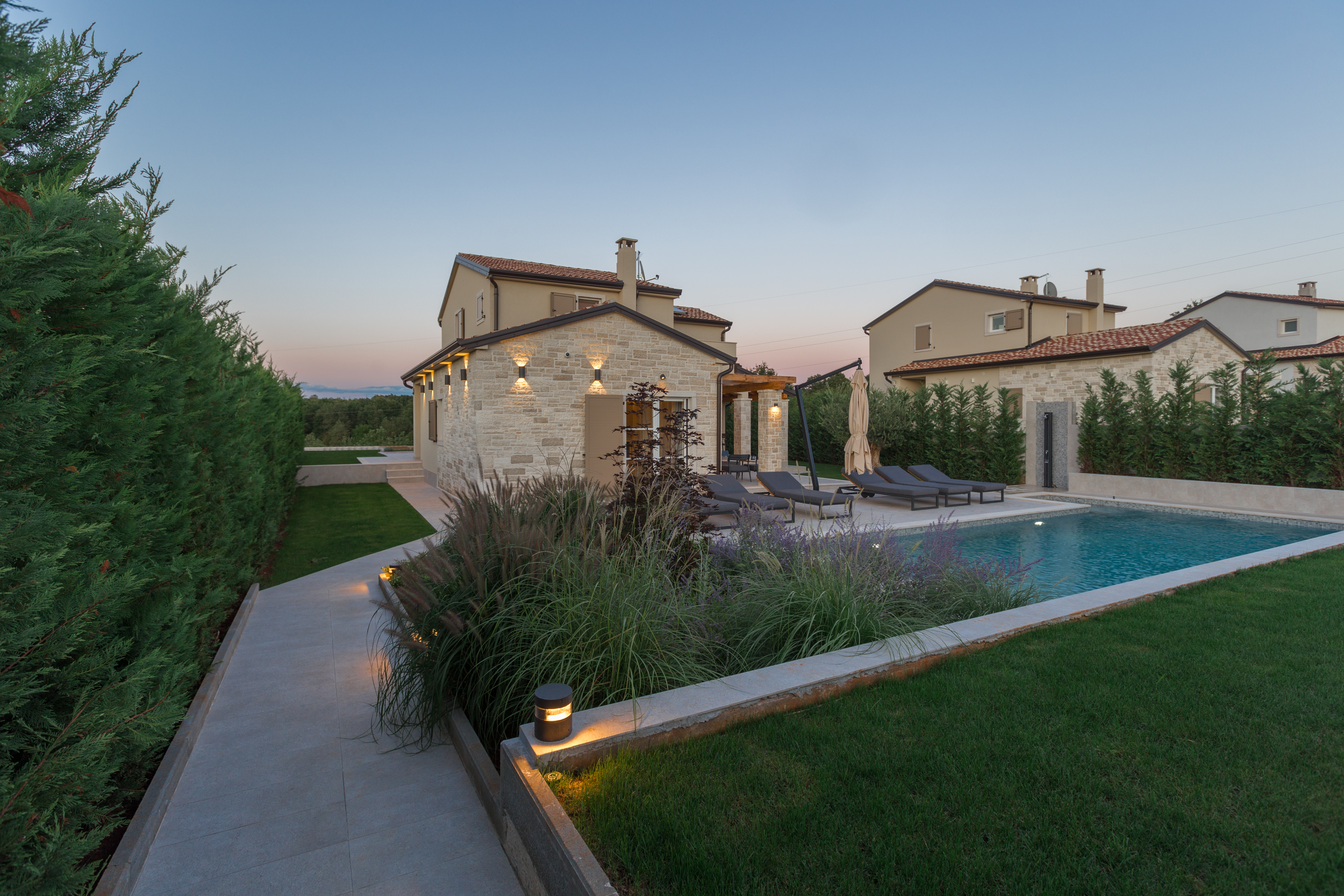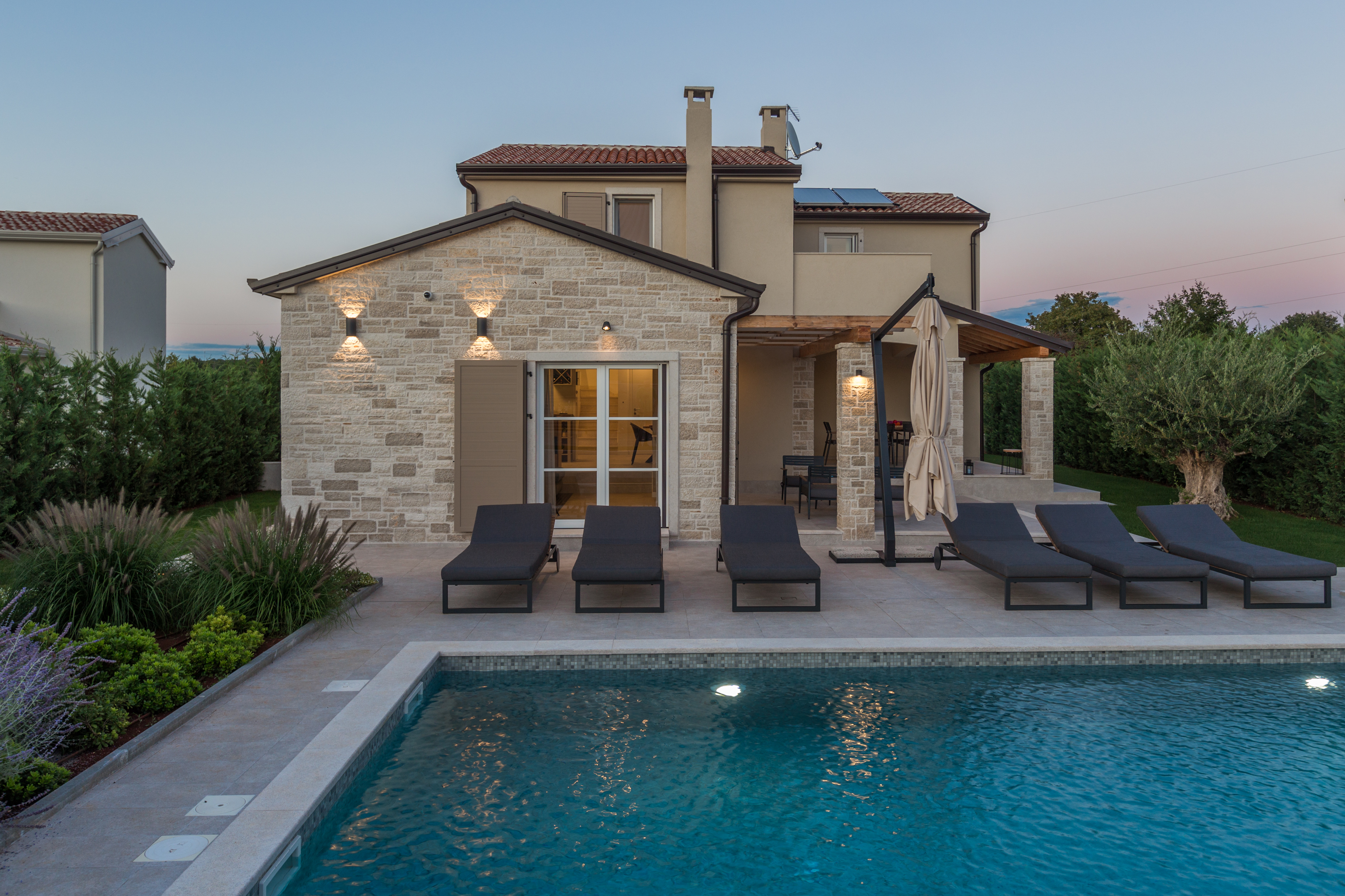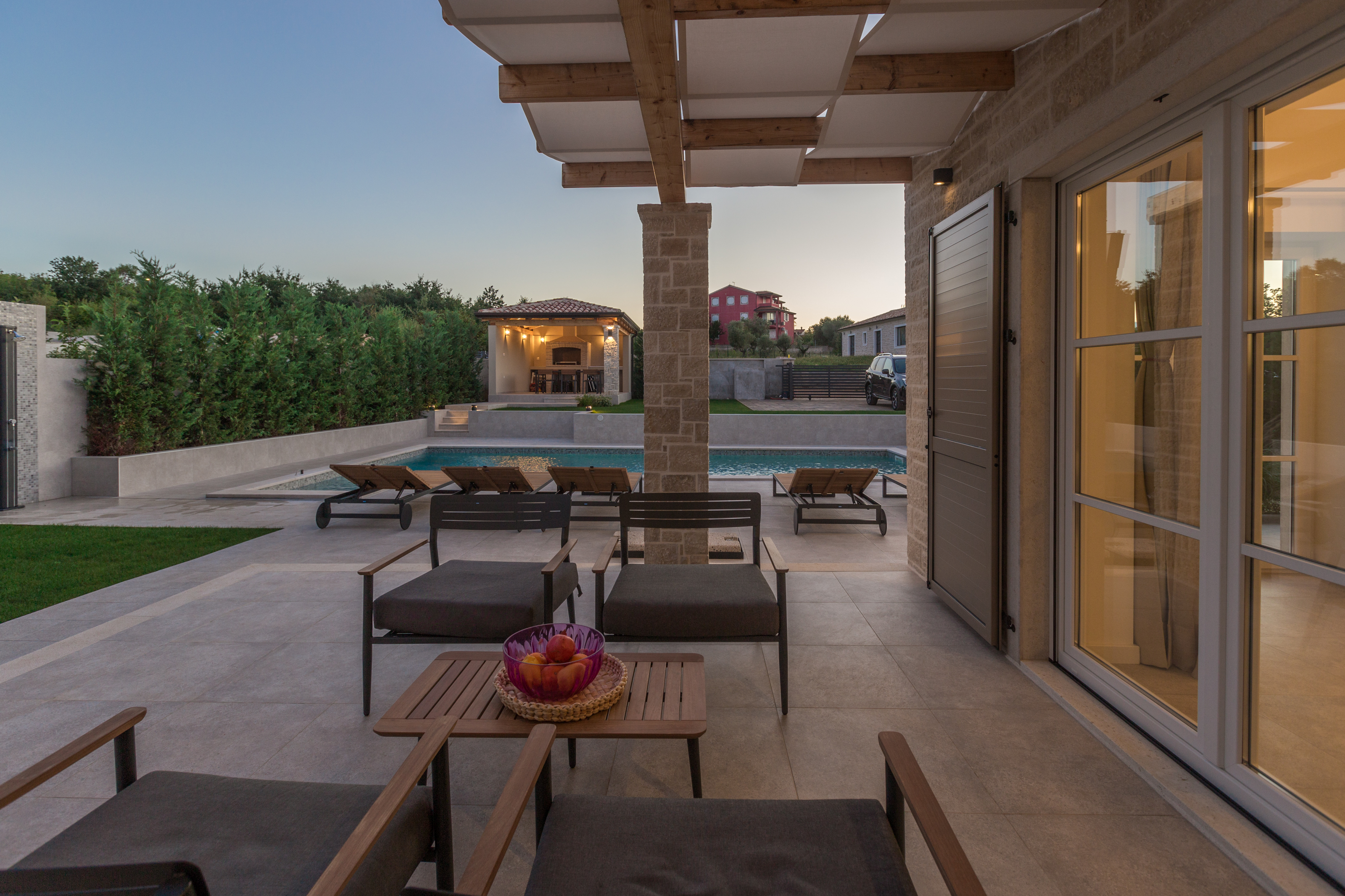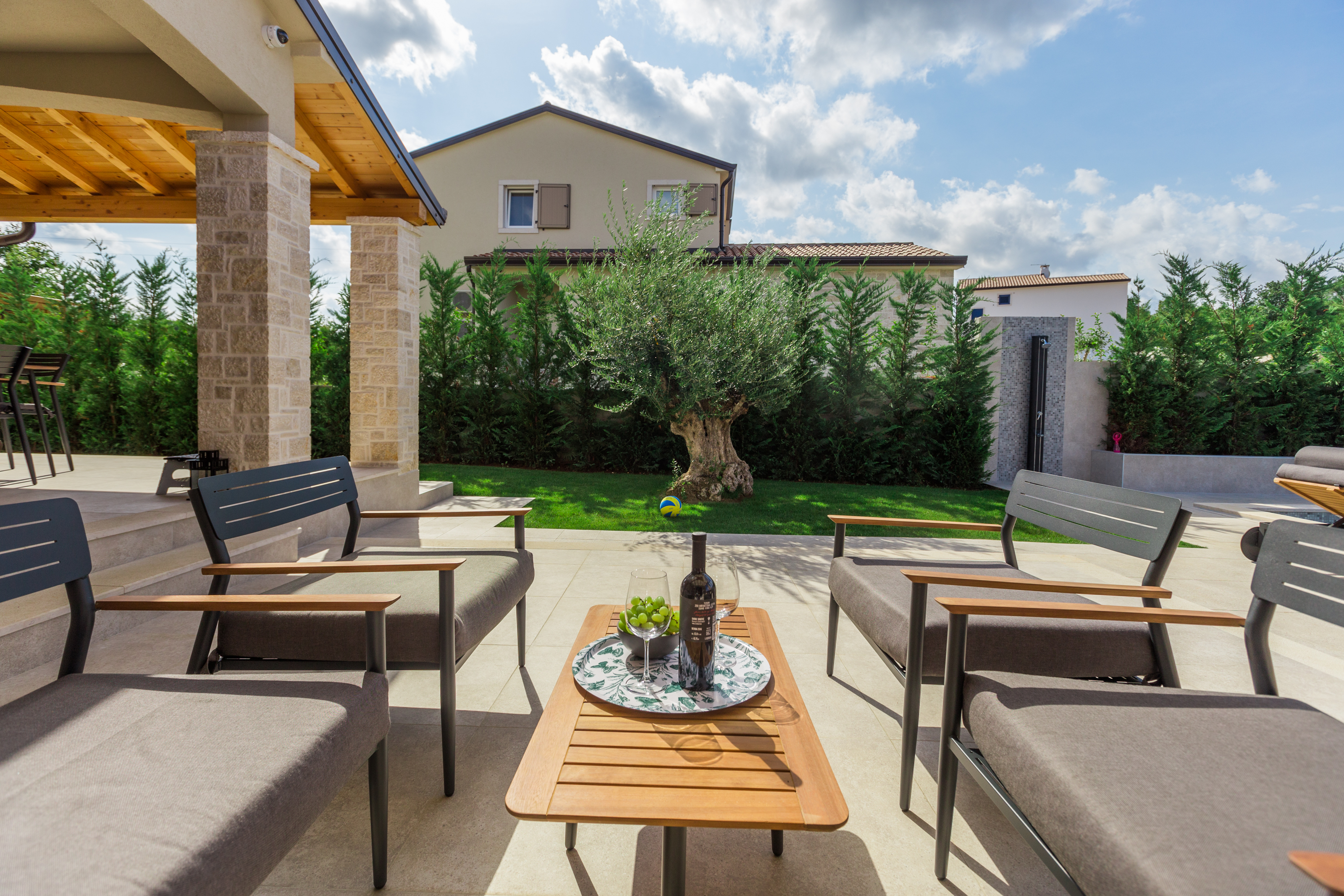 Der Außenbereich der Villa No.18 ist für völlige Entspannung und Genuss gestaltet. Der 40 m² große, beheizte Pool mit Hydromassagedüsen lädt die Gäste ein, sich unter der istrischen Sonne zu erholen und zu erfrischen. Rund um den Pool können die Gäste auf sechs Sonnenliegen entspannen oder ein Getränk im schattigen Loungebereich genießen. Der überdachte Essbereich im Freien mit einem großen Esstisch sowie einer separaten Sommerküche mit Holzkohlegrill, Spüle und Beleuchtung ist ideal, um gemeinsam Mahlzeiten zuzubereiten und zu genießen. Das gesamte Grundstück ist eingezäunt (1,7 m hoch) und von gepflegtem Grün mit automatischer Bewässerung umgeben, was Privatsphäre und eine ruhige Umgebung für die Gäste bietet.