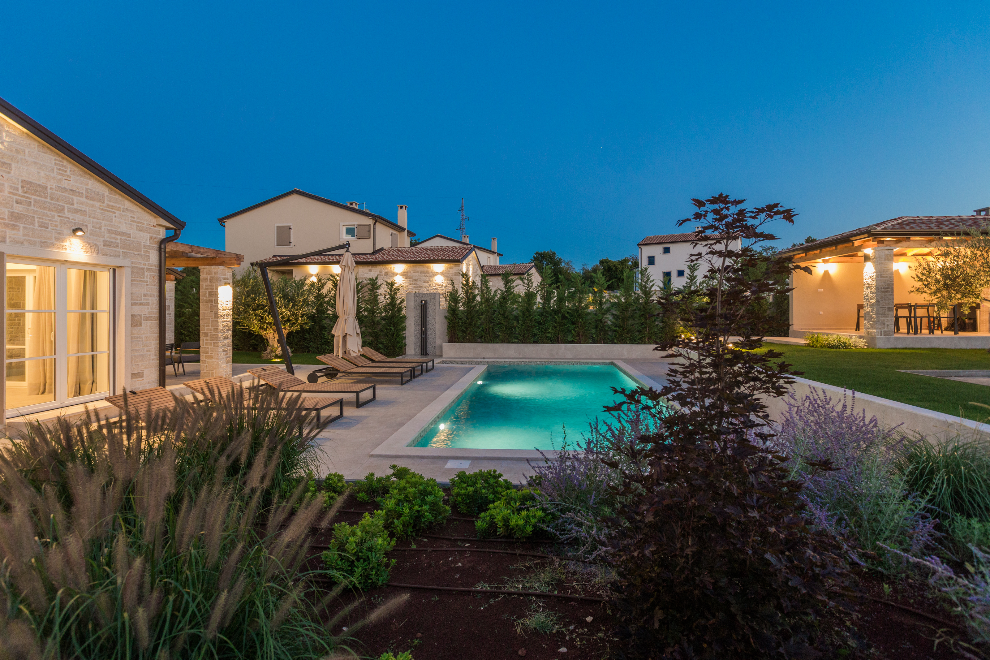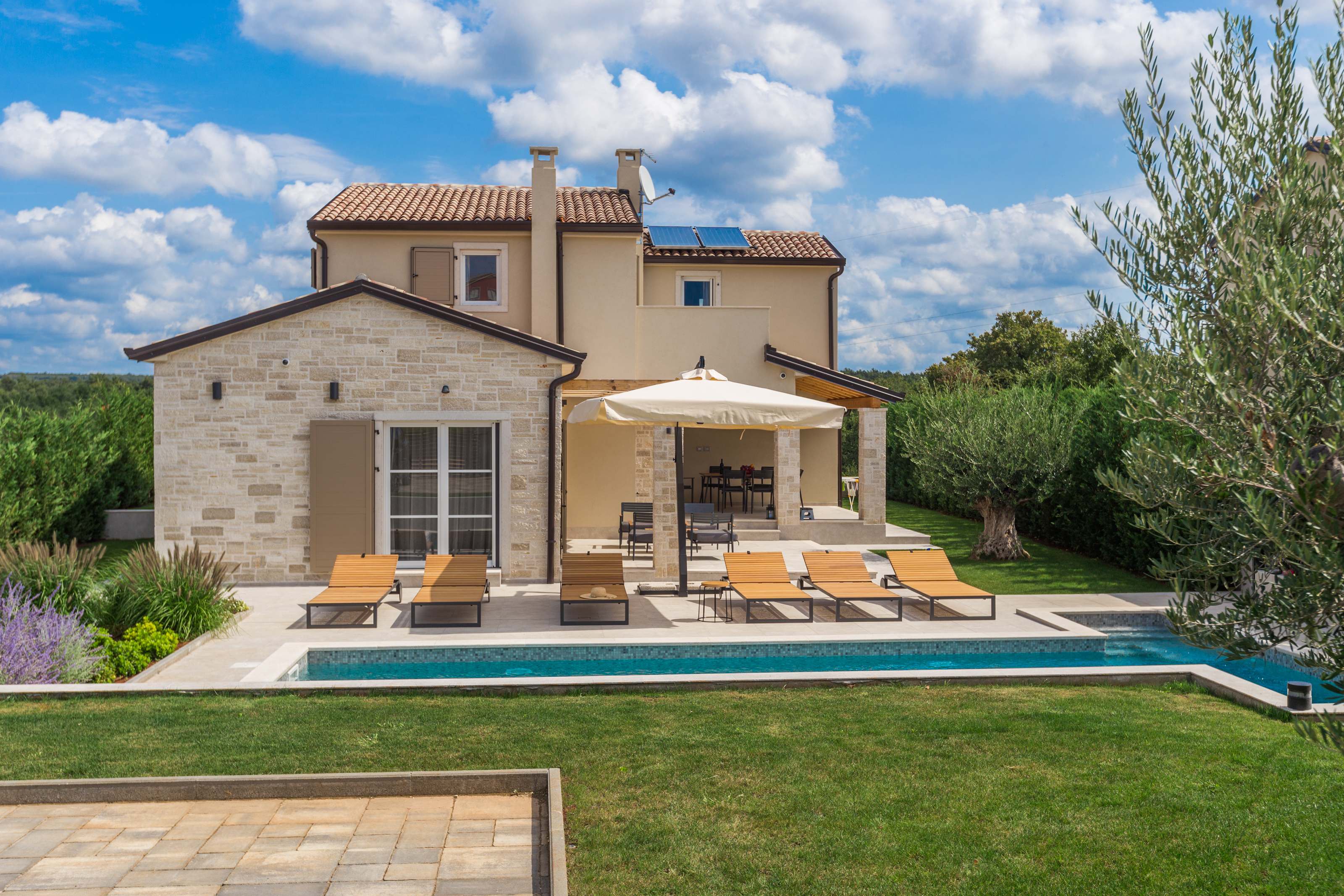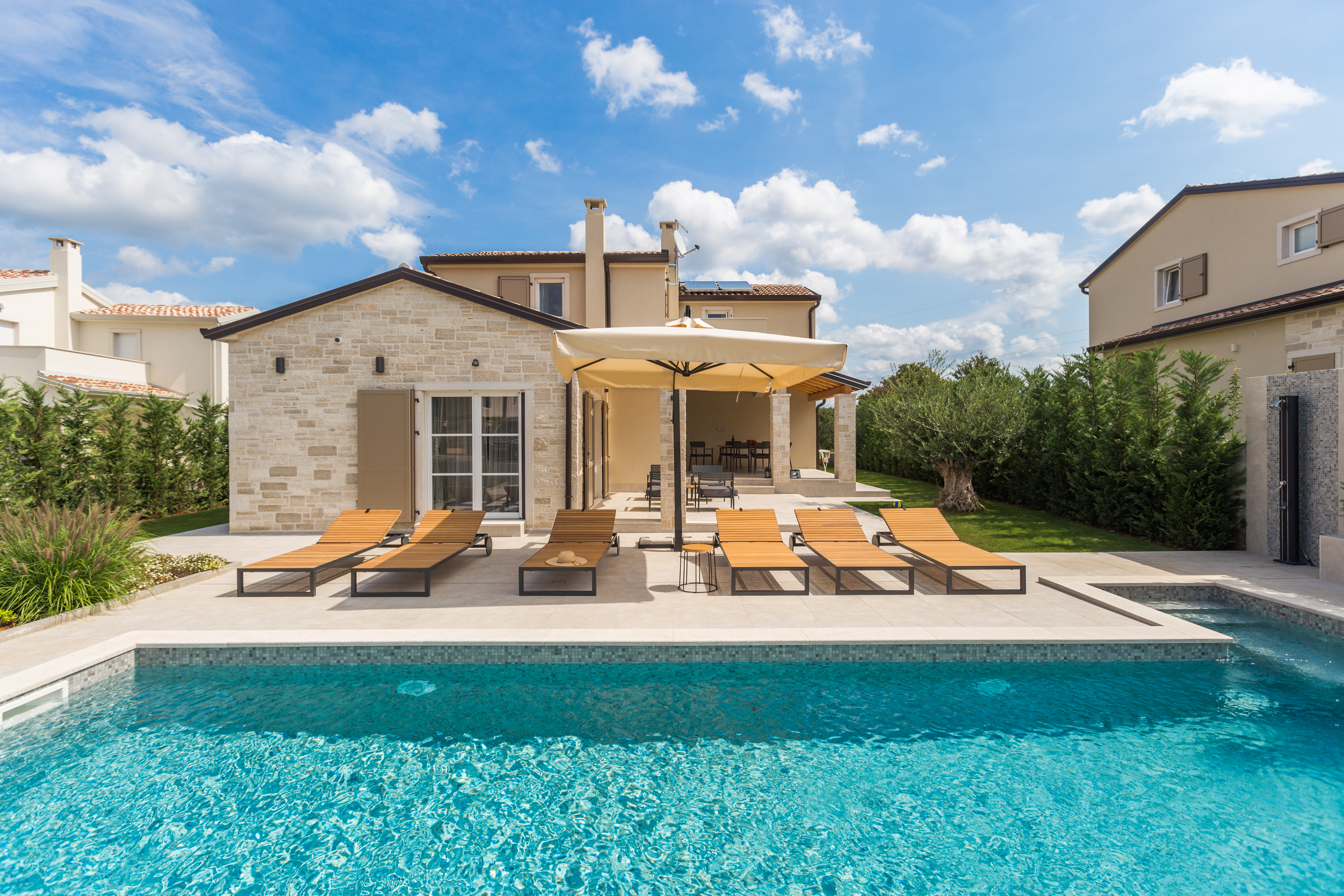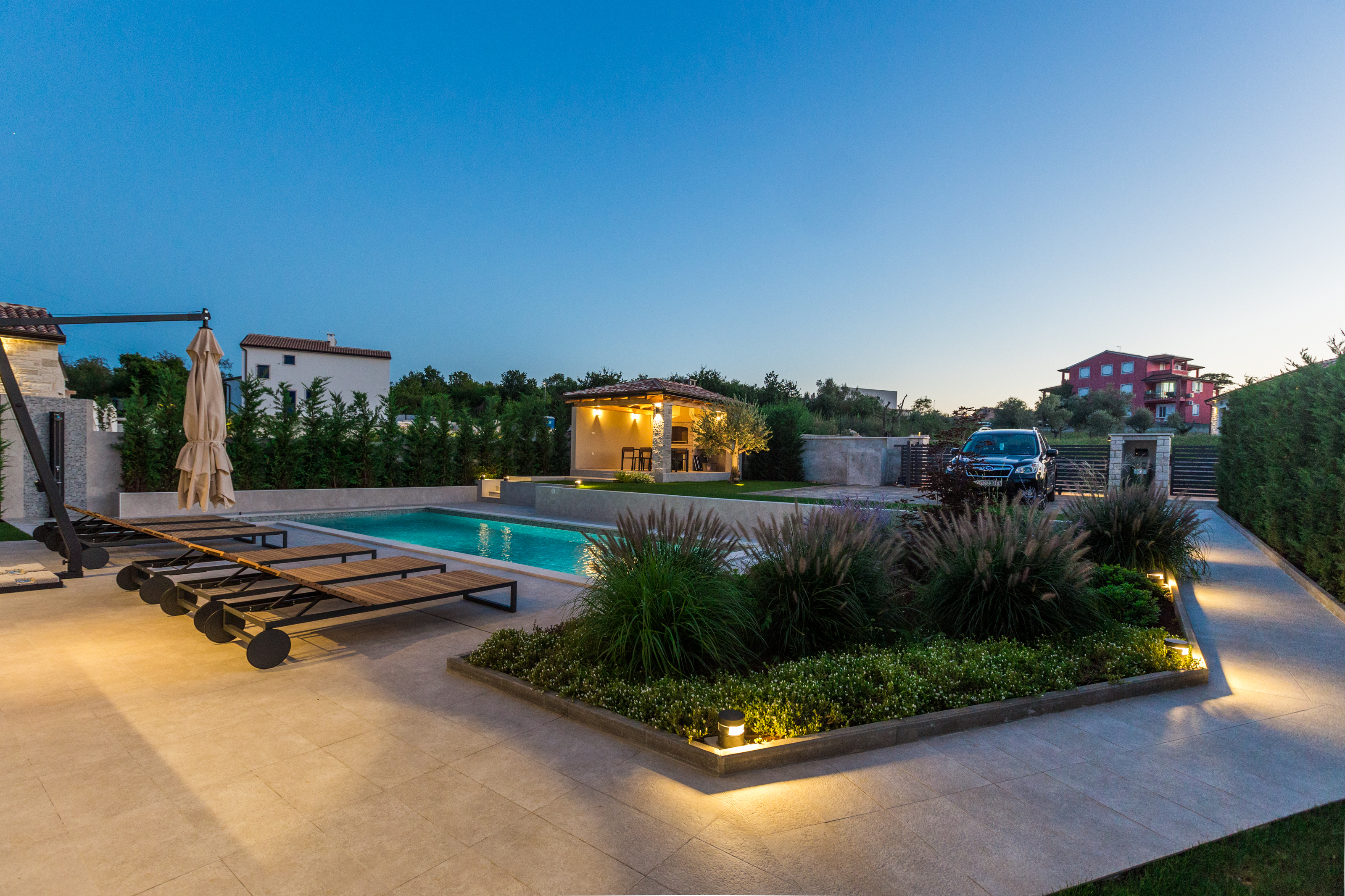 Der Außenbereich der Villa No.18 ist für völlige Entspannung und Genuss gestaltet. Der 40 m² große, beheizte Pool mit Hydromassagedüsen lädt die Gäste ein, sich unter der istrischen Sonne zu erholen und zu erfrischen. Rund um den Pool können die Gäste auf sechs Sonnenliegen entspannen oder ein Getränk im schattigen Loungebereich genießen. Der überdachte Essbereich im Freien mit einem großen Esstisch sowie einer separaten Sommerküche mit Holzkohlegrill, Spüle und Beleuchtung ist ideal, um gemeinsam Mahlzeiten zuzubereiten und zu genießen. Das gesamte Grundstück ist eingezäunt (1,7 m hoch) und von gepflegtem Grün mit automatischer Bewässerung umgeben, was Privatsphäre und eine ruhige Umgebung für die Gäste bietet.