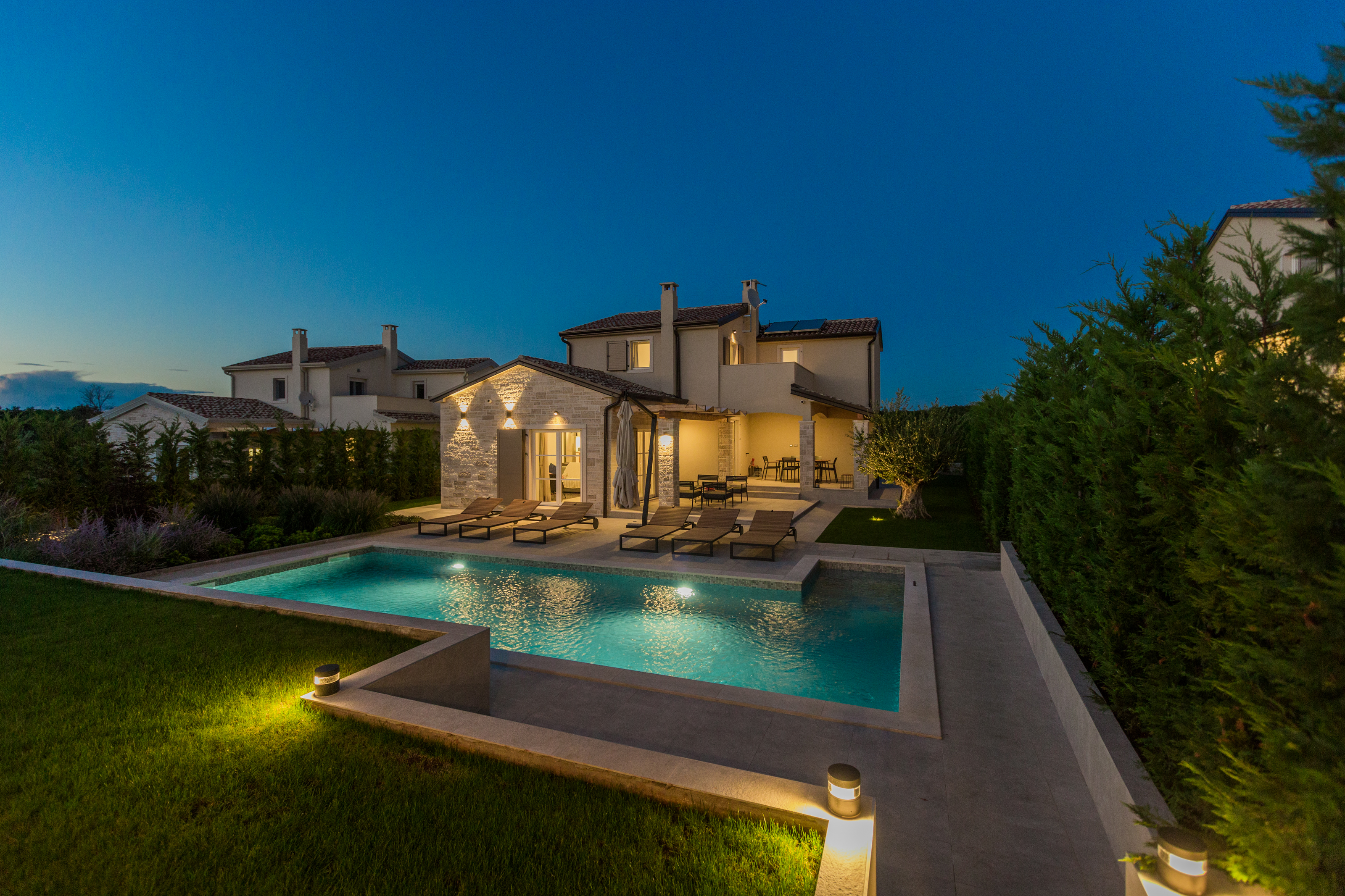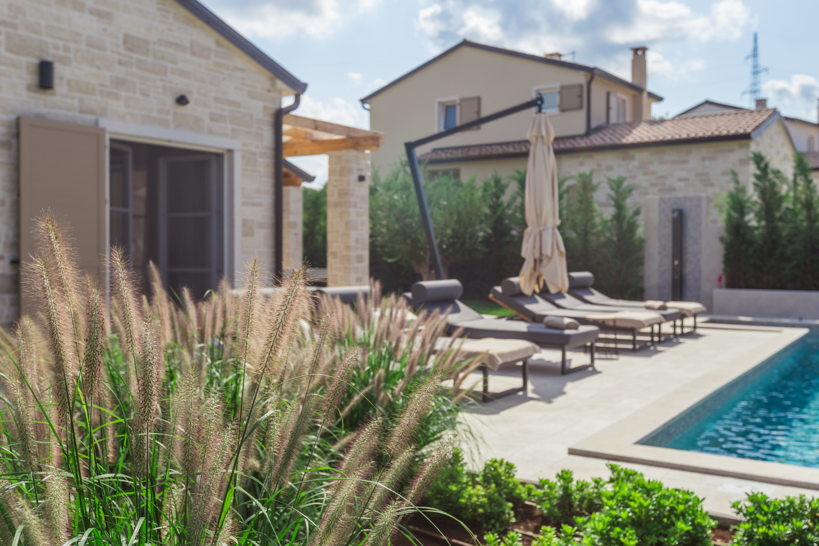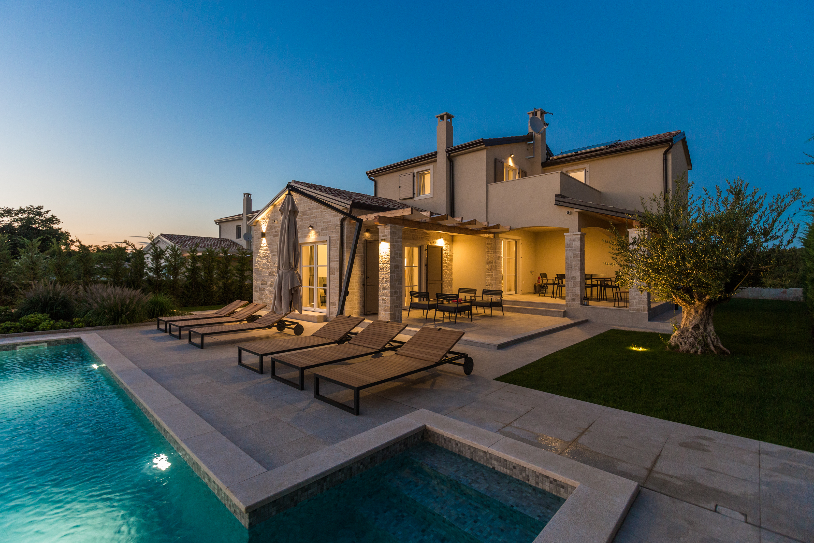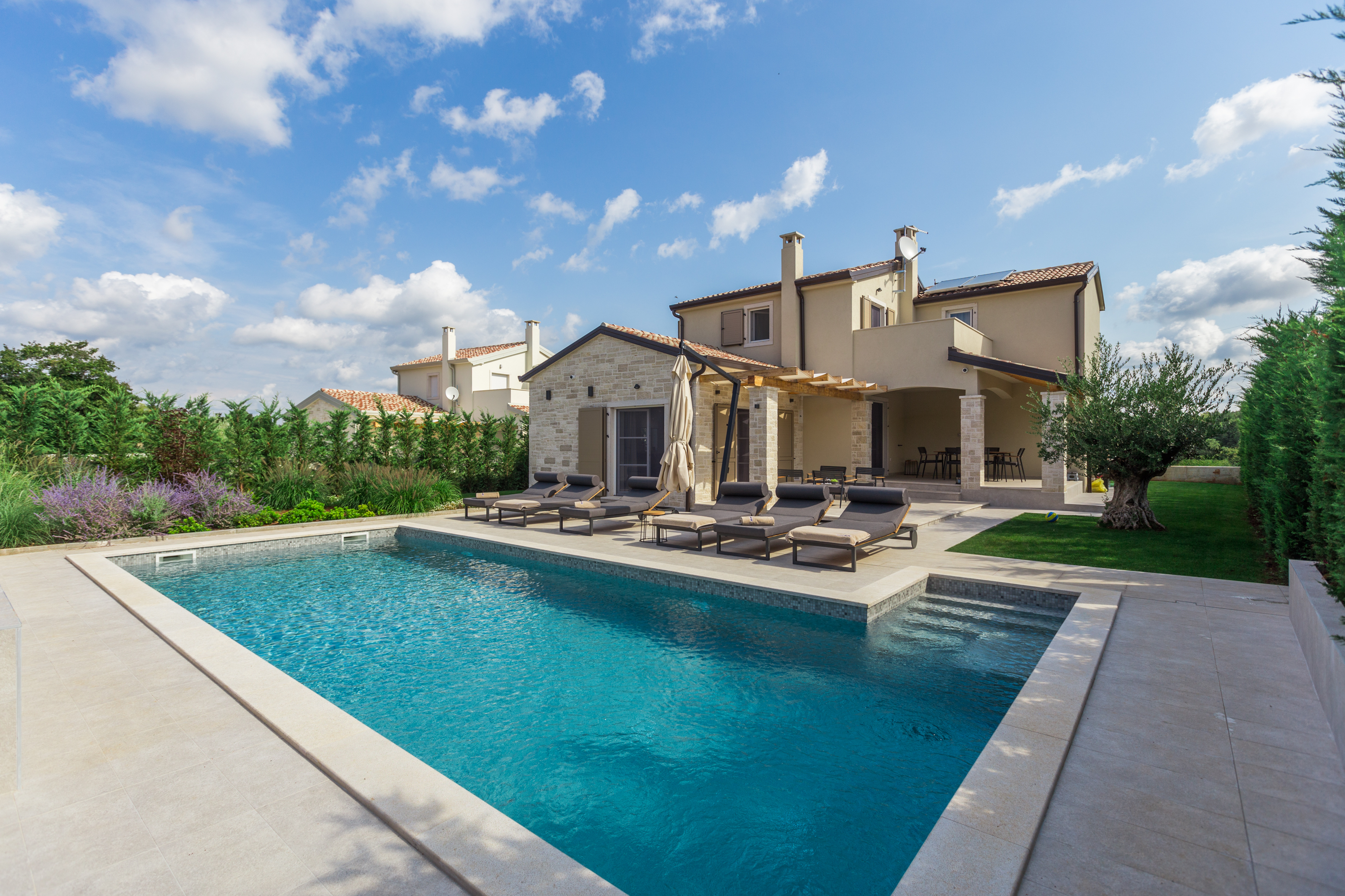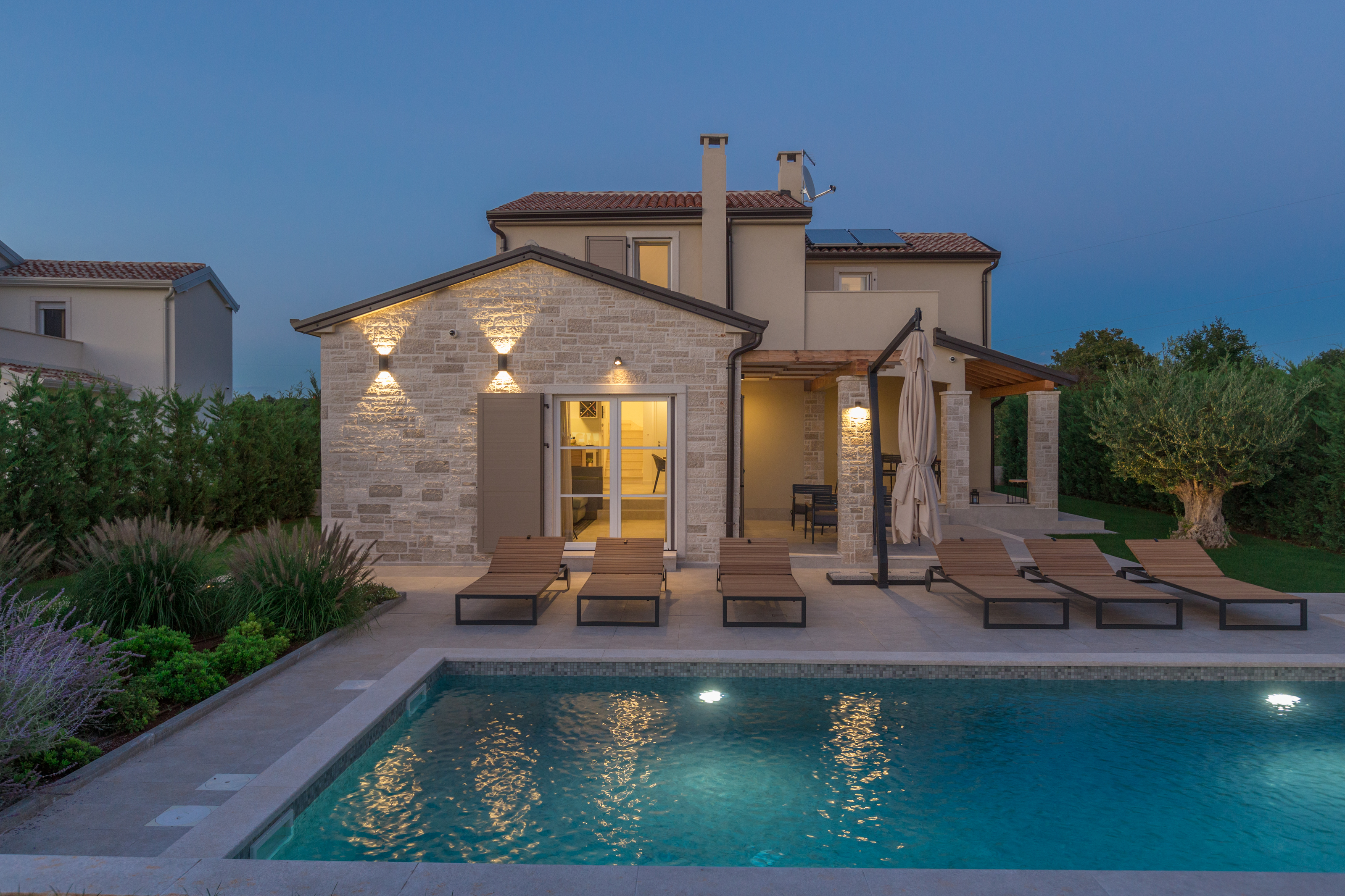 Der Außenbereich der Villa No.18 ist für völlige Entspannung und Genuss gestaltet. Der 40 m² große, beheizte Pool mit Hydromassagedüsen lädt die Gäste ein, sich unter der istrischen Sonne zu erholen und zu erfrischen. Rund um den Pool können die Gäste auf sechs Sonnenliegen entspannen oder ein Getränk im schattigen Loungebereich genießen. Der überdachte Essbereich im Freien mit einem großen Esstisch sowie einer separaten Sommerküche mit Holzkohlegrill, Spüle und Beleuchtung ist ideal, um gemeinsam Mahlzeiten zuzubereiten und zu genießen. Das gesamte Grundstück ist eingezäunt (1,7 m hoch) und von gepflegtem Grün mit automatischer Bewässerung umgeben, was Privatsphäre und eine ruhige Umgebung für die Gäste bietet.