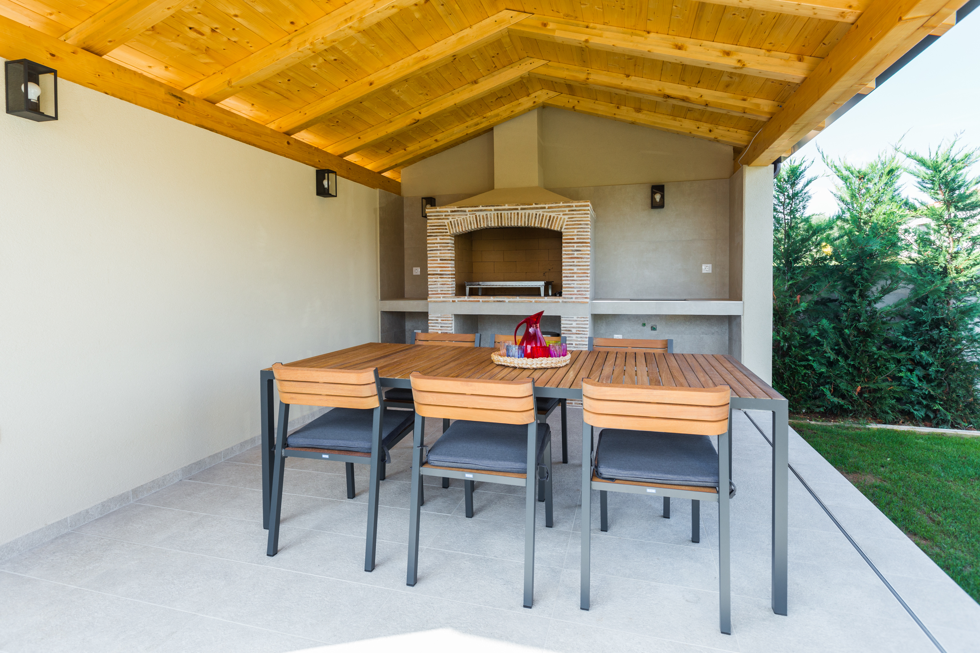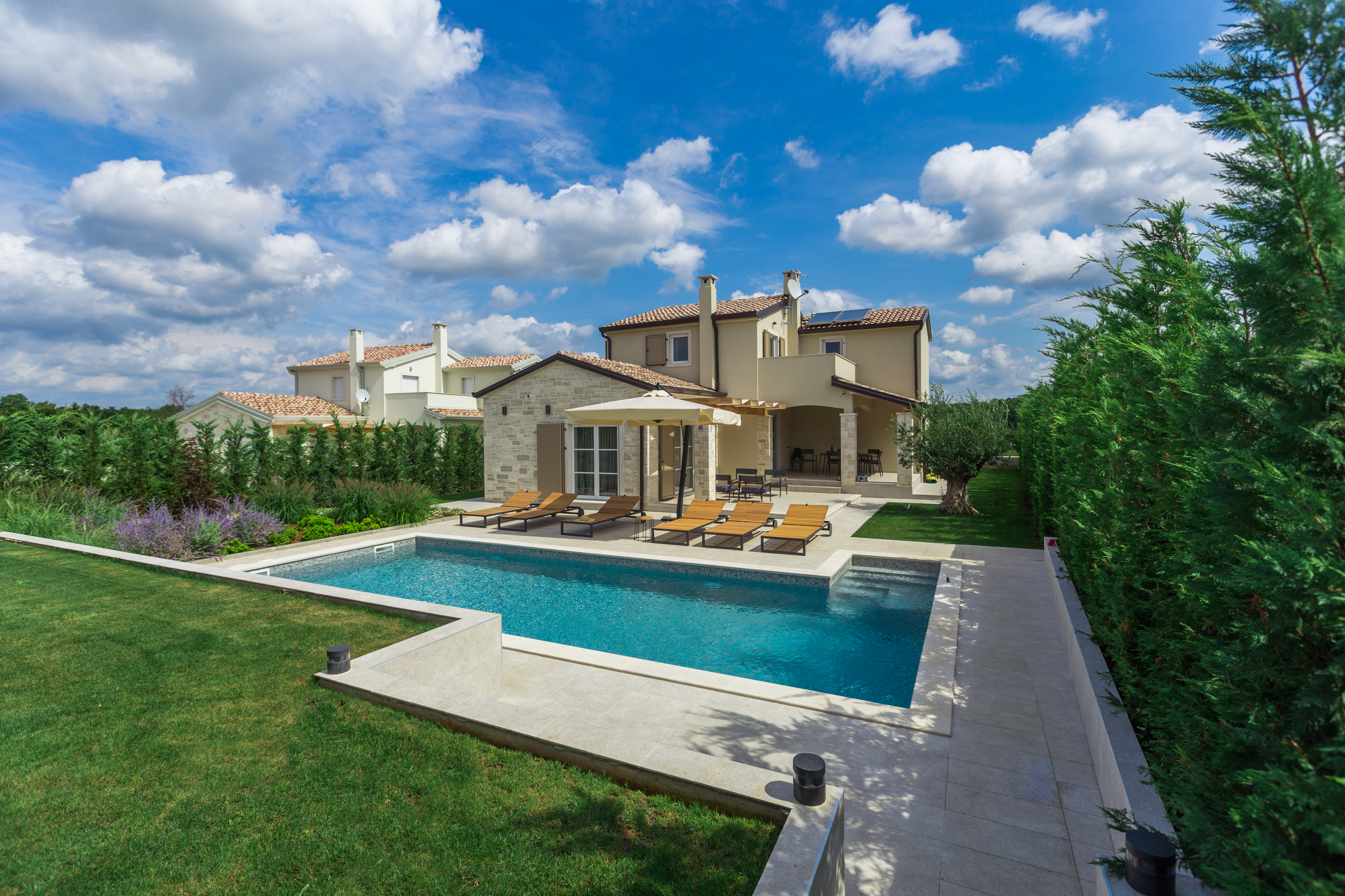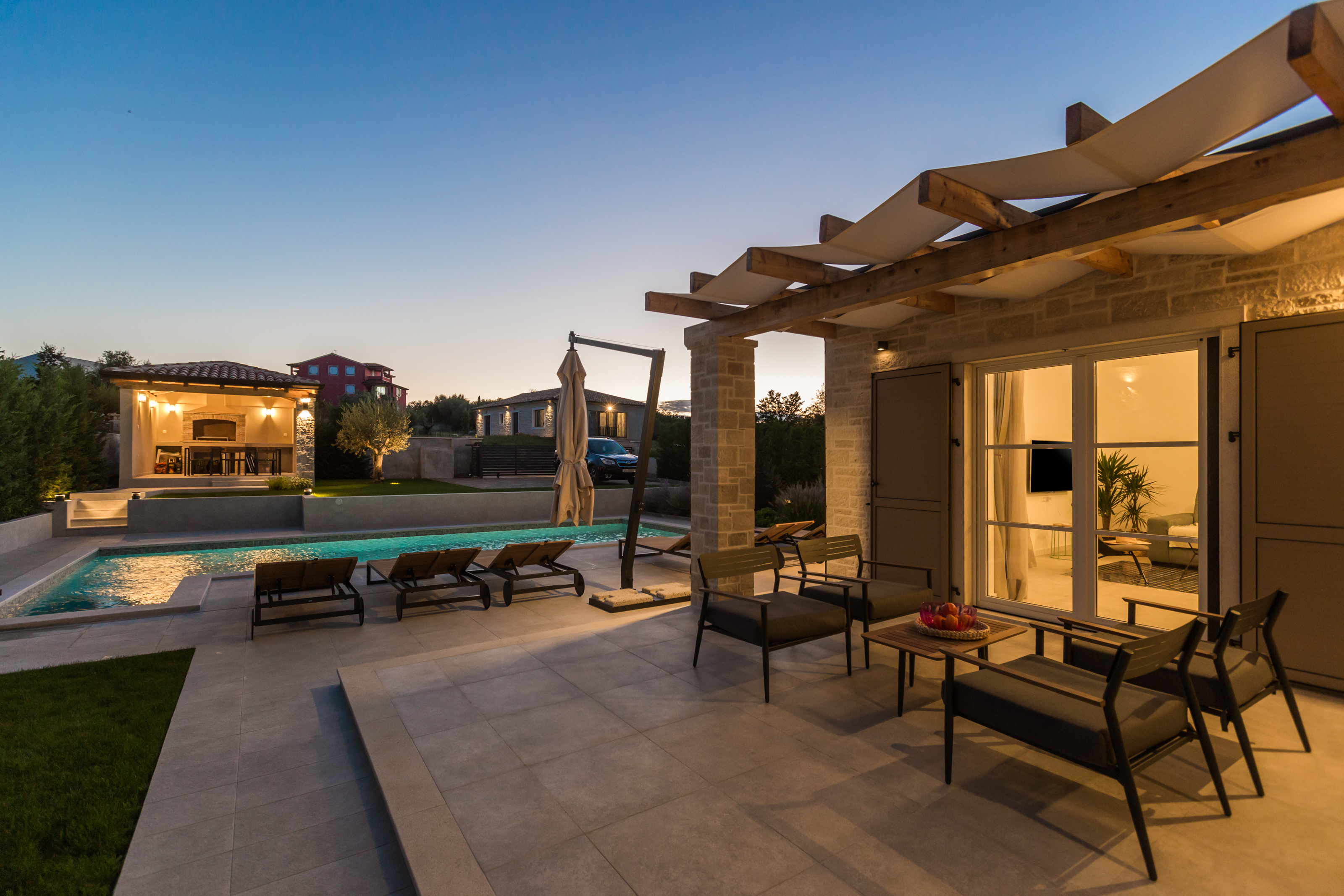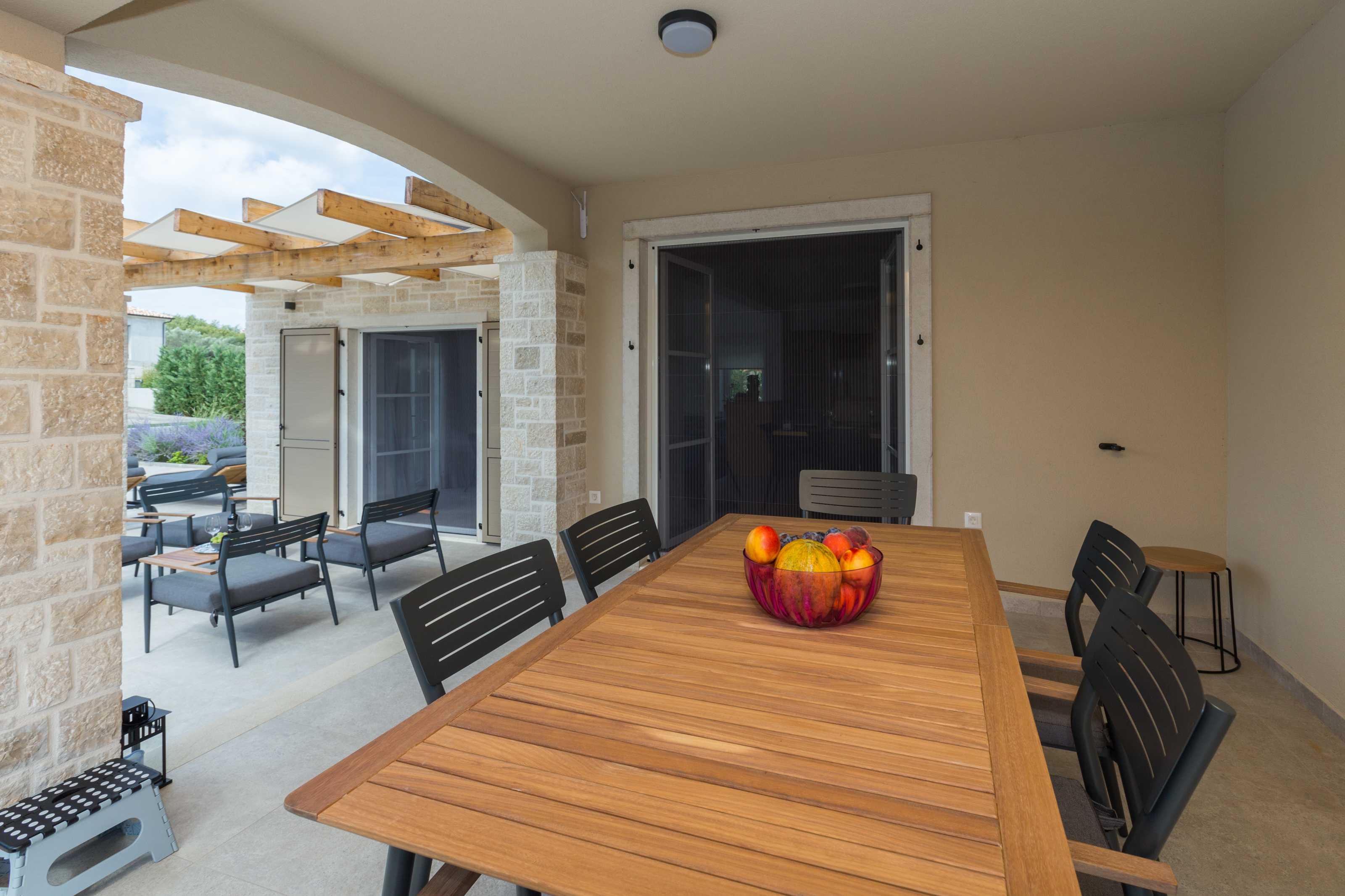 Der Außenbereich der Villa No.18 ist für völlige Entspannung und Genuss gestaltet. Der 40 m² große, beheizte Pool mit Hydromassagedüsen lädt die Gäste ein, sich unter der istrischen Sonne zu erholen und zu erfrischen. Rund um den Pool können die Gäste auf sechs Sonnenliegen entspannen oder ein Getränk im schattigen Loungebereich genießen. Der überdachte Essbereich im Freien mit einem großen Esstisch sowie einer separaten Sommerküche mit Holzkohlegrill, Spüle und Beleuchtung ist ideal, um gemeinsam Mahlzeiten zuzubereiten und zu genießen. Das gesamte Grundstück ist eingezäunt (1,7 m hoch) und von gepflegtem Grün mit automatischer Bewässerung umgeben, was Privatsphäre und eine ruhige Umgebung für die Gäste bietet.