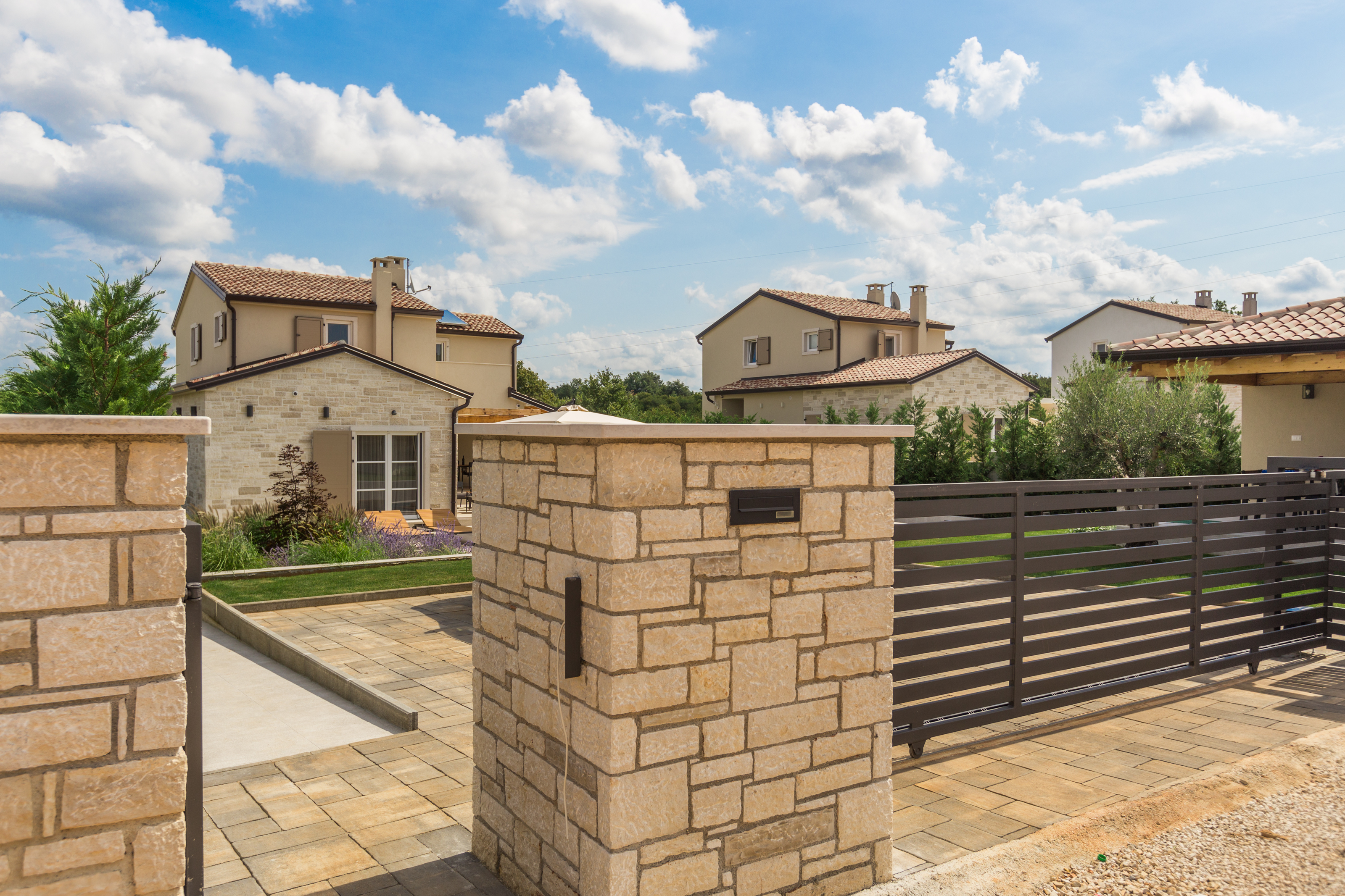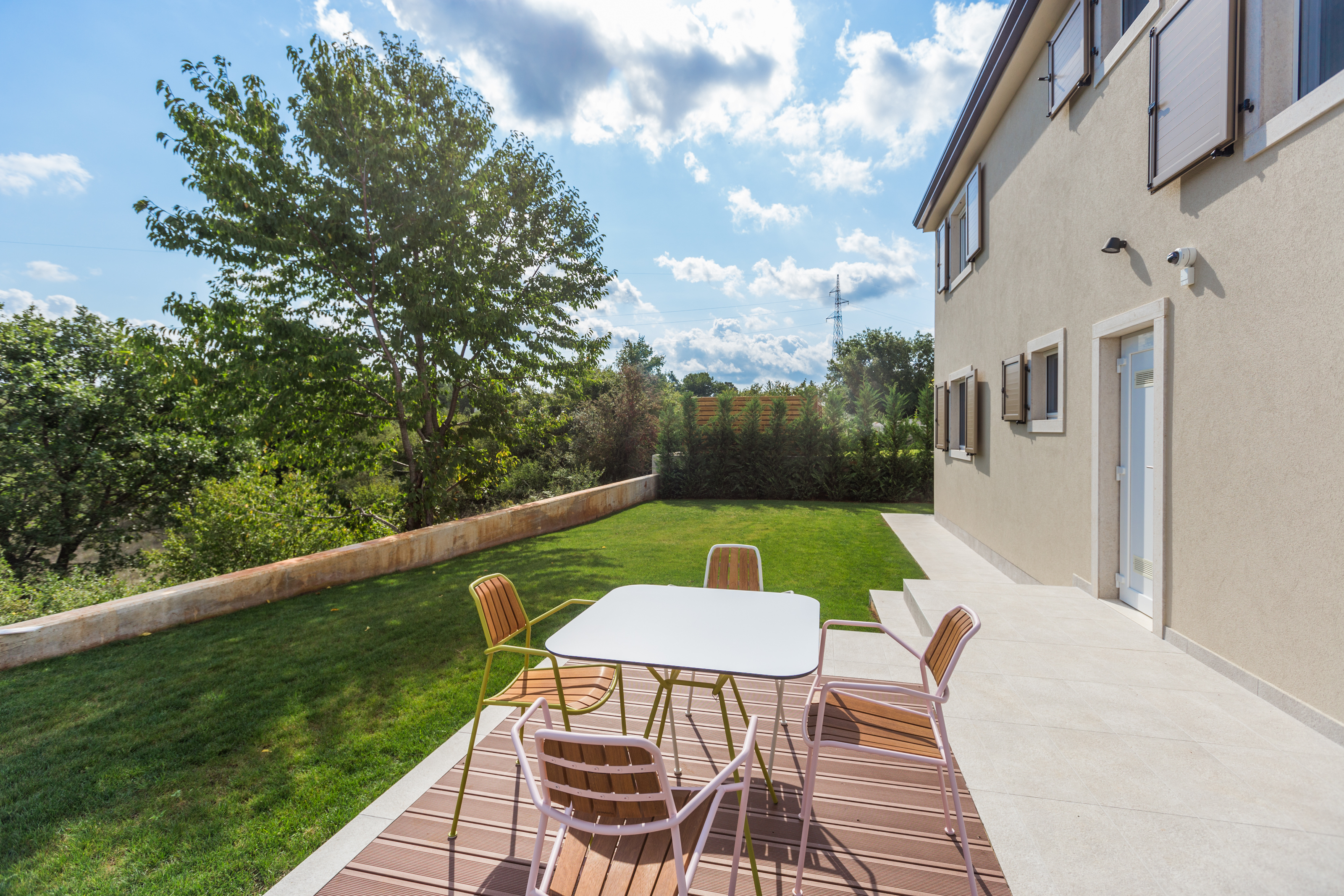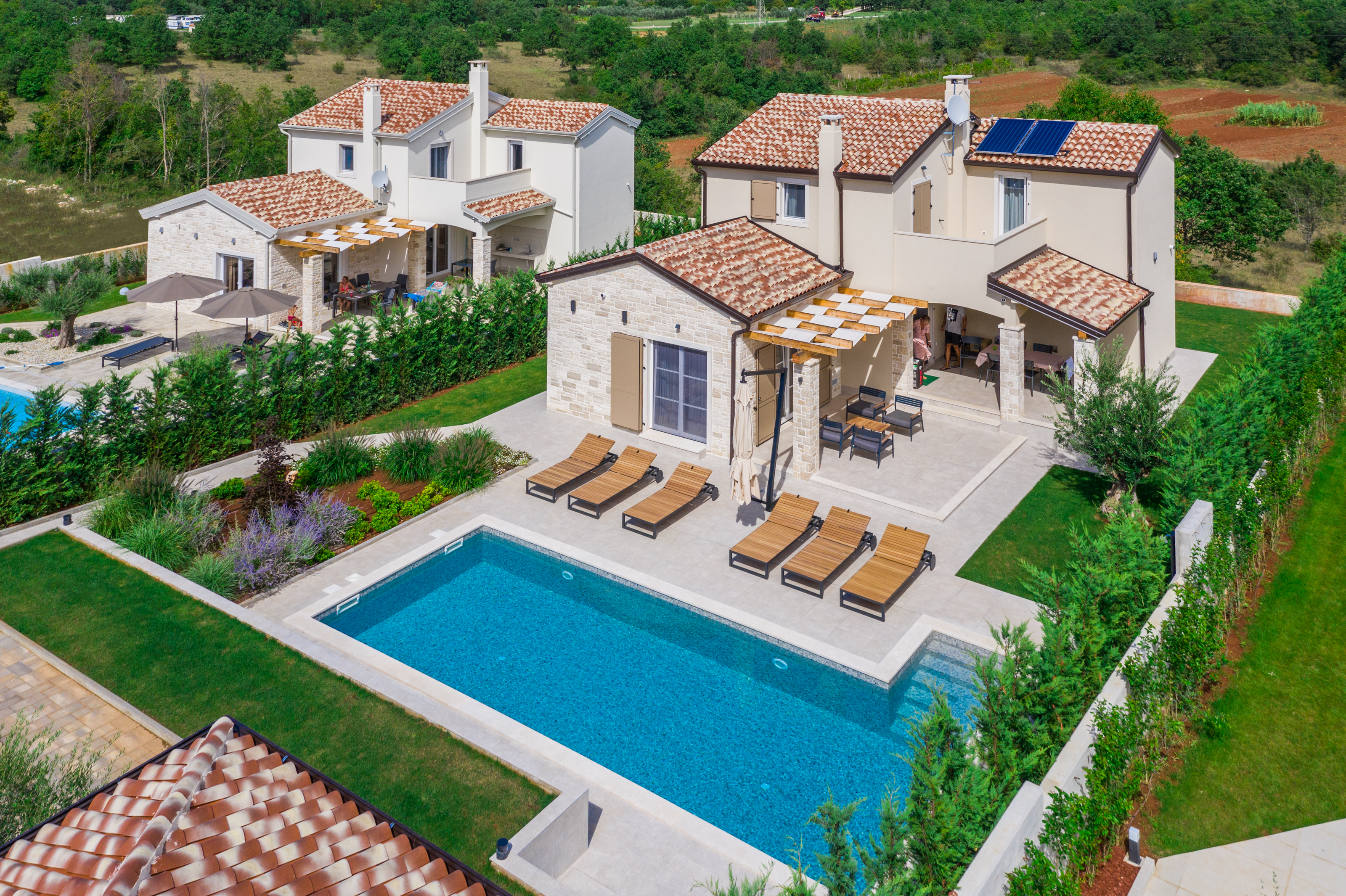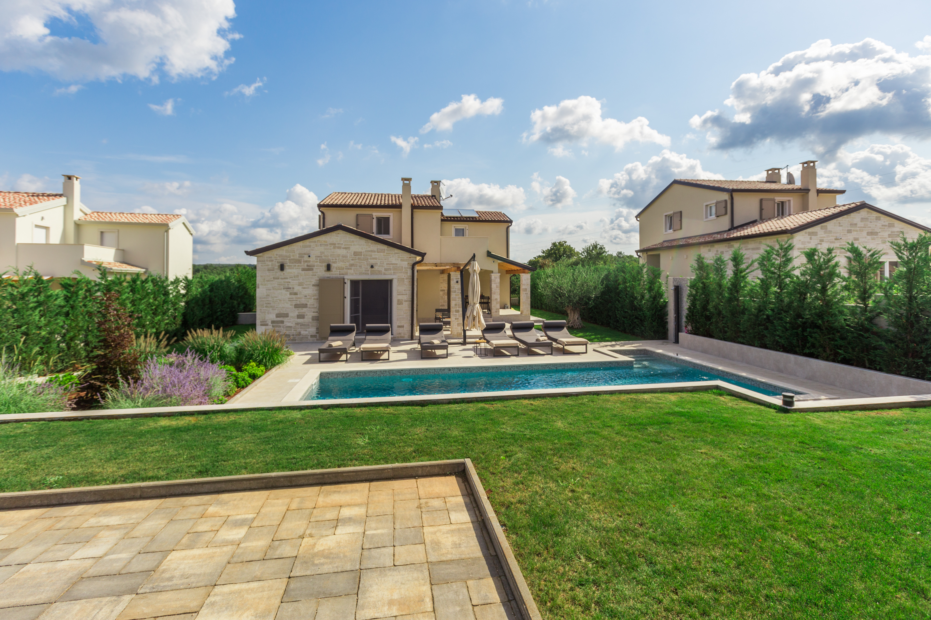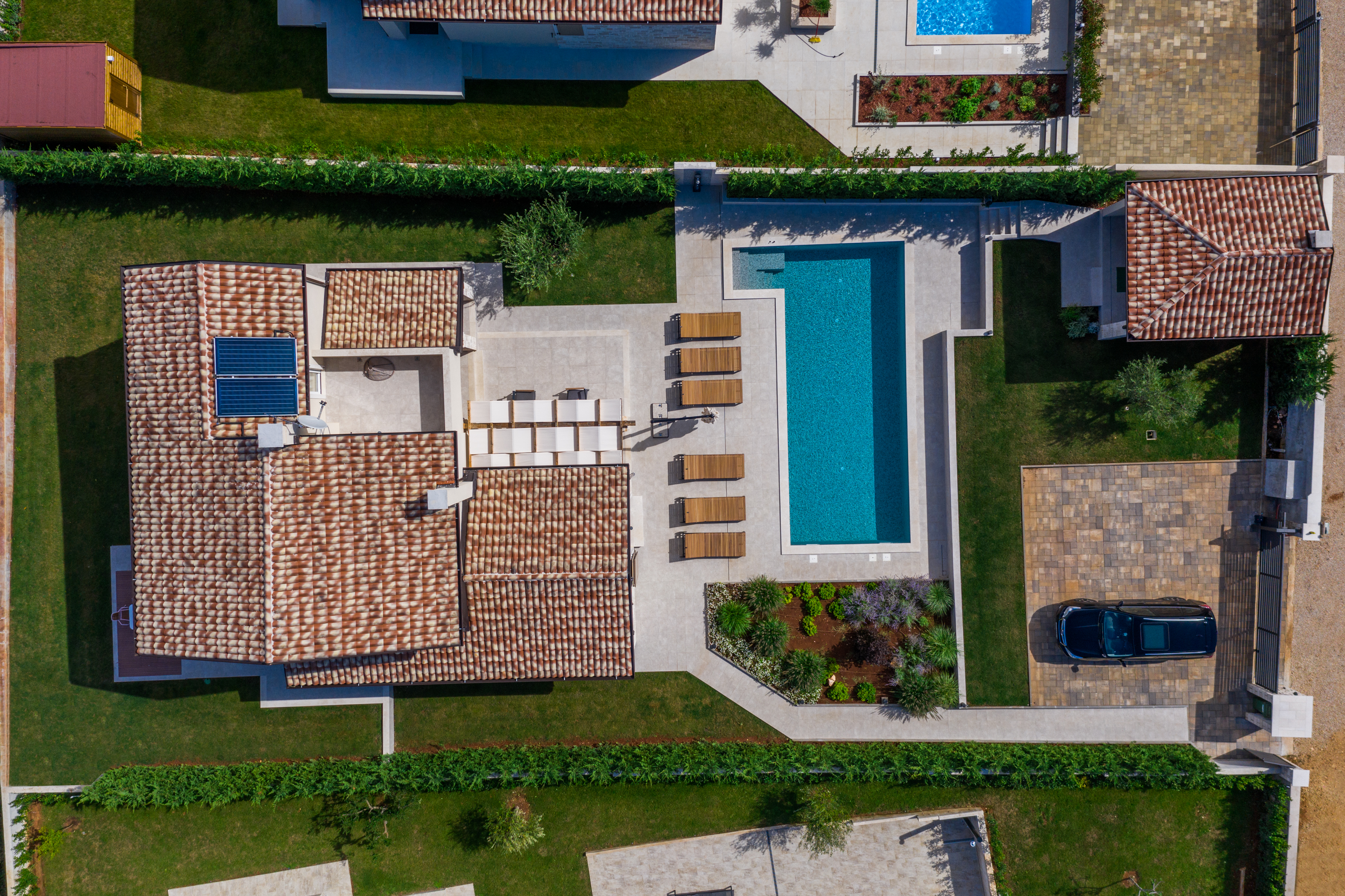 Der Außenbereich der Villa No.18 ist für völlige Entspannung und Genuss gestaltet. Der 40 m² große, beheizte Pool mit Hydromassagedüsen lädt die Gäste ein, sich unter der istrischen Sonne zu erholen und zu erfrischen. Rund um den Pool können die Gäste auf sechs Sonnenliegen entspannen oder ein Getränk im schattigen Loungebereich genießen. Der überdachte Essbereich im Freien mit einem großen Esstisch sowie einer separaten Sommerküche mit Holzkohlegrill, Spüle und Beleuchtung ist ideal, um gemeinsam Mahlzeiten zuzubereiten und zu genießen. Das gesamte Grundstück ist eingezäunt (1,7 m hoch) und von gepflegtem Grün mit automatischer Bewässerung umgeben, was Privatsphäre und eine ruhige Umgebung für die Gäste bietet.
