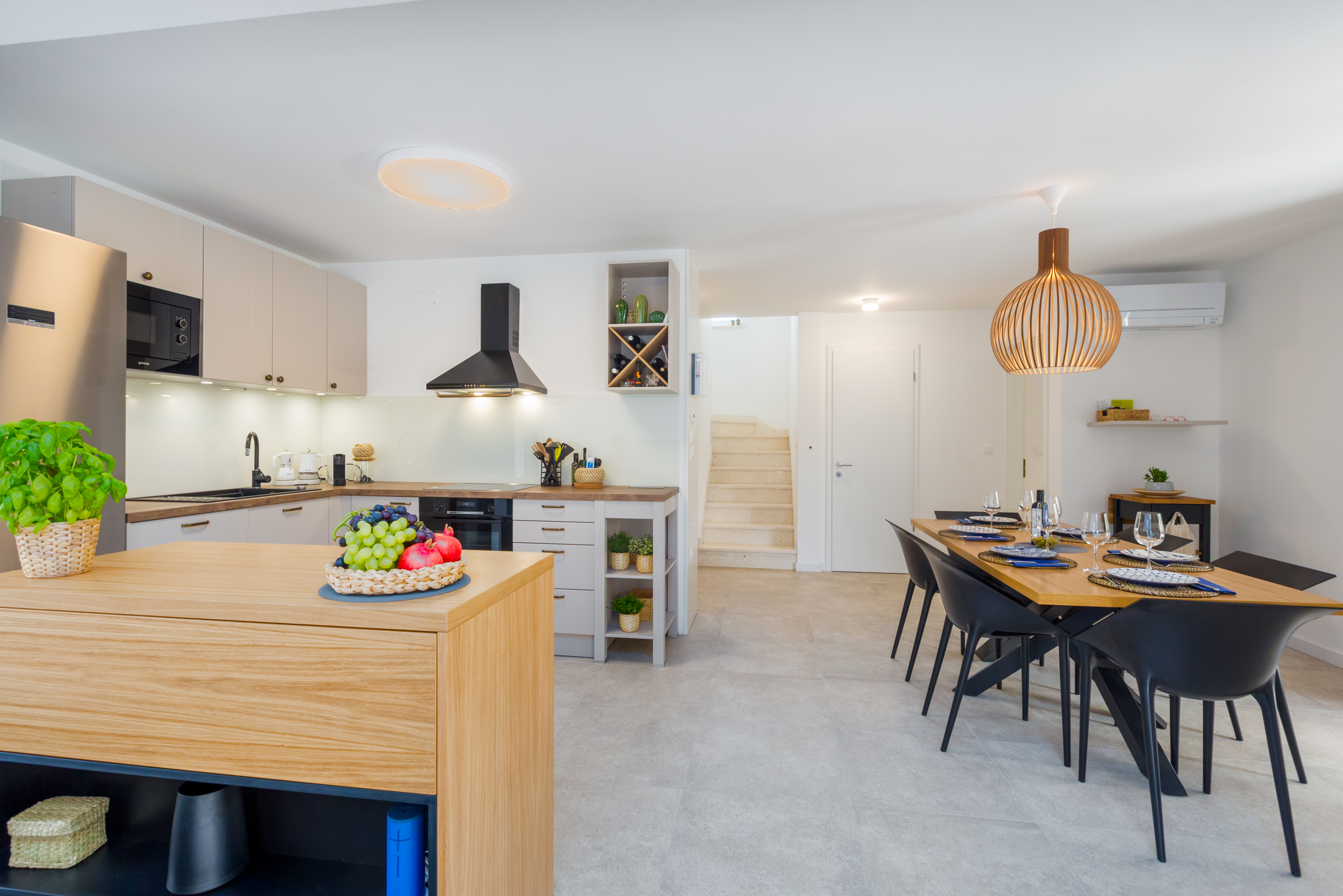 Das geräumige Erdgeschoss der Villa No.18 ist im offenen Konzept gestaltet und verfügt über einen hellen und eleganten Wohnbereich. Die voll ausgestattete moderne Küche mit Induktionskochfeld, Backofen, Geschirrspüler sowie Nespresso- und Filterkaffeemaschine ist nahtlos mit dem Essbereich und dem Wohnzimmer mit bequemen Sofa, SAT-TV und Kamin verbunden. Große Glastüren lassen viel Tageslicht herein und führen direkt auf die Terrasse und den Poolbereich. Auf dieser Etage befindet sich außerdem Schlafzimmer 1 (Bett 210x180 cm) mit eigenem Badezimmer, das über eine Dusche, ein Bidet und einen Haartrockner verfügt. Ein Gäste-WC sowie ein Hauswirtschaftsraum mit Waschmaschine, Trockner und Bügelbrett sorgen für zusätzlichen Komfort bei längeren Aufenthalten.