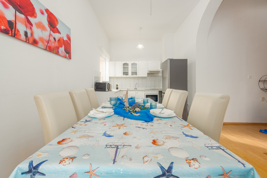Kind owners, location close to the beach, in a quiet area, with a shop nearby. The house is well maintained, spacious, easily accommodating 16 people without anyone disturbing one another. Many rooms, 3 bathrooms, 2 kitchens, and 1 kitchenette. The house is well equipped. The pool is very well kept, with plenty of sunbeds available. A large covered area with a table where everyone can sit together at once, a grill, and everything needed for relaxation. If someone doesn’t mind staying on an island and traveling by ferry (with rather high ticket prices), I sincerely recommend this place.
