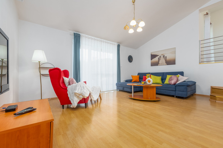 The interiors of Villa Ivana in Pasman are spread over three floors. The villa is divided into 3 apartments and has a total of 3 kitchens, two living rooms, 4 bedrooms and three bathrooms. The kitchens are fully equipped with all the necessary appliances. The large living room offers a Smart TV, a corner sofa and an armchair, and the smaller living room has a TV and a couch. Two bathrooms are equipped with showers, and one with a bathtub. All four bedrooms have double beds, and they also have additional beds. The villa has several balconies from which you can enjoy the sea view.