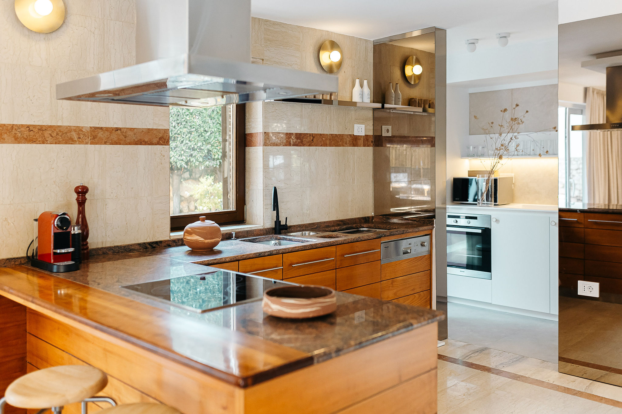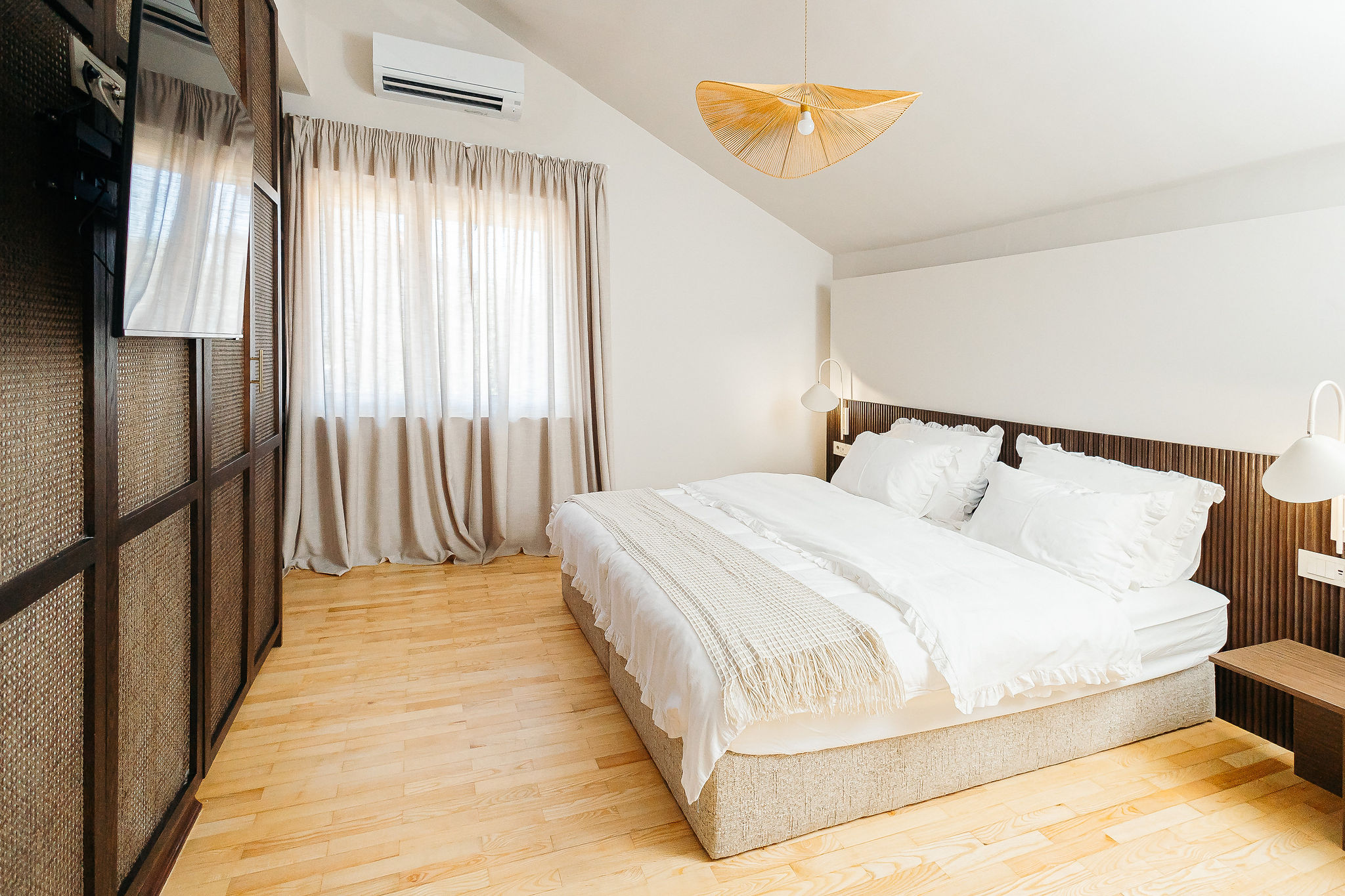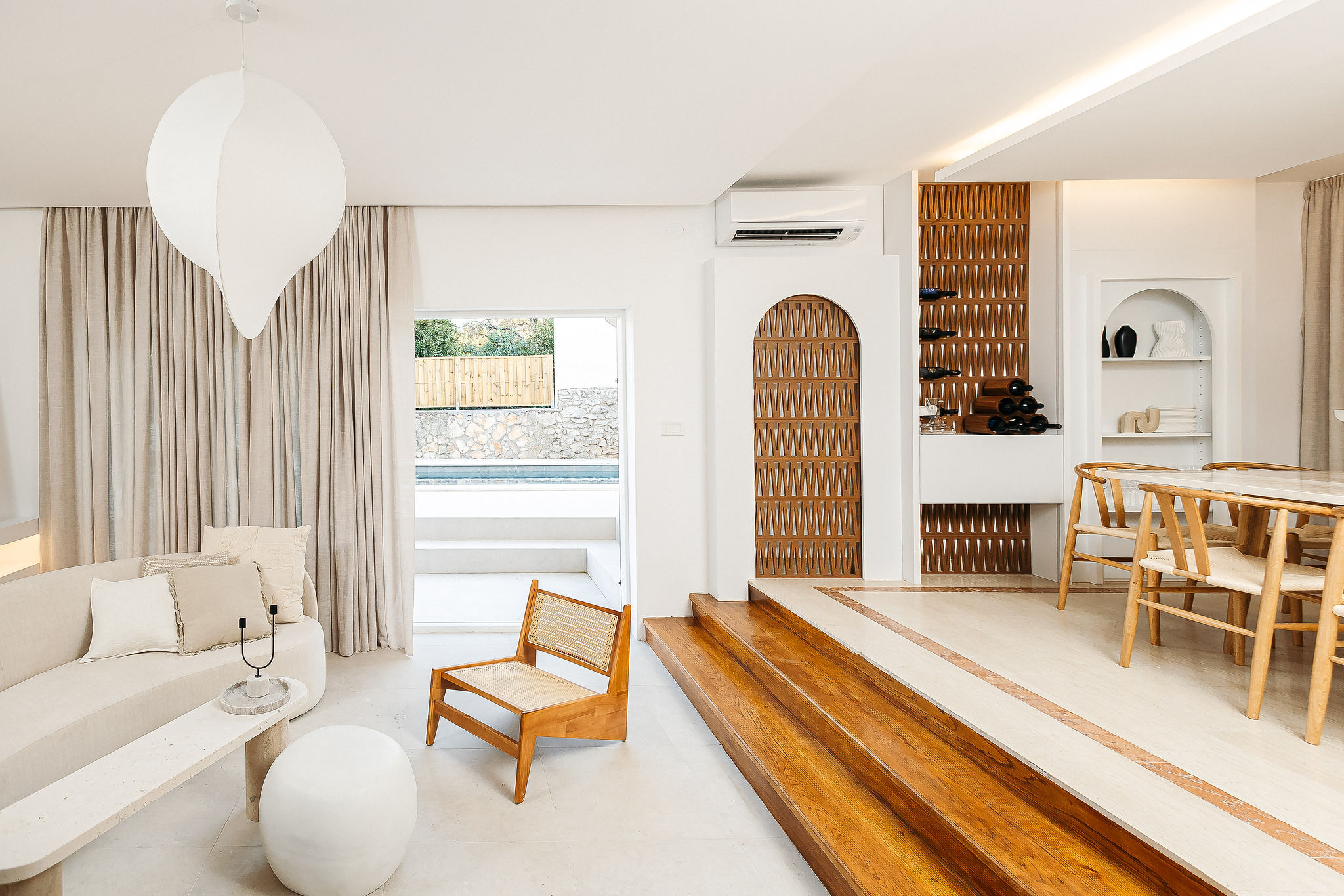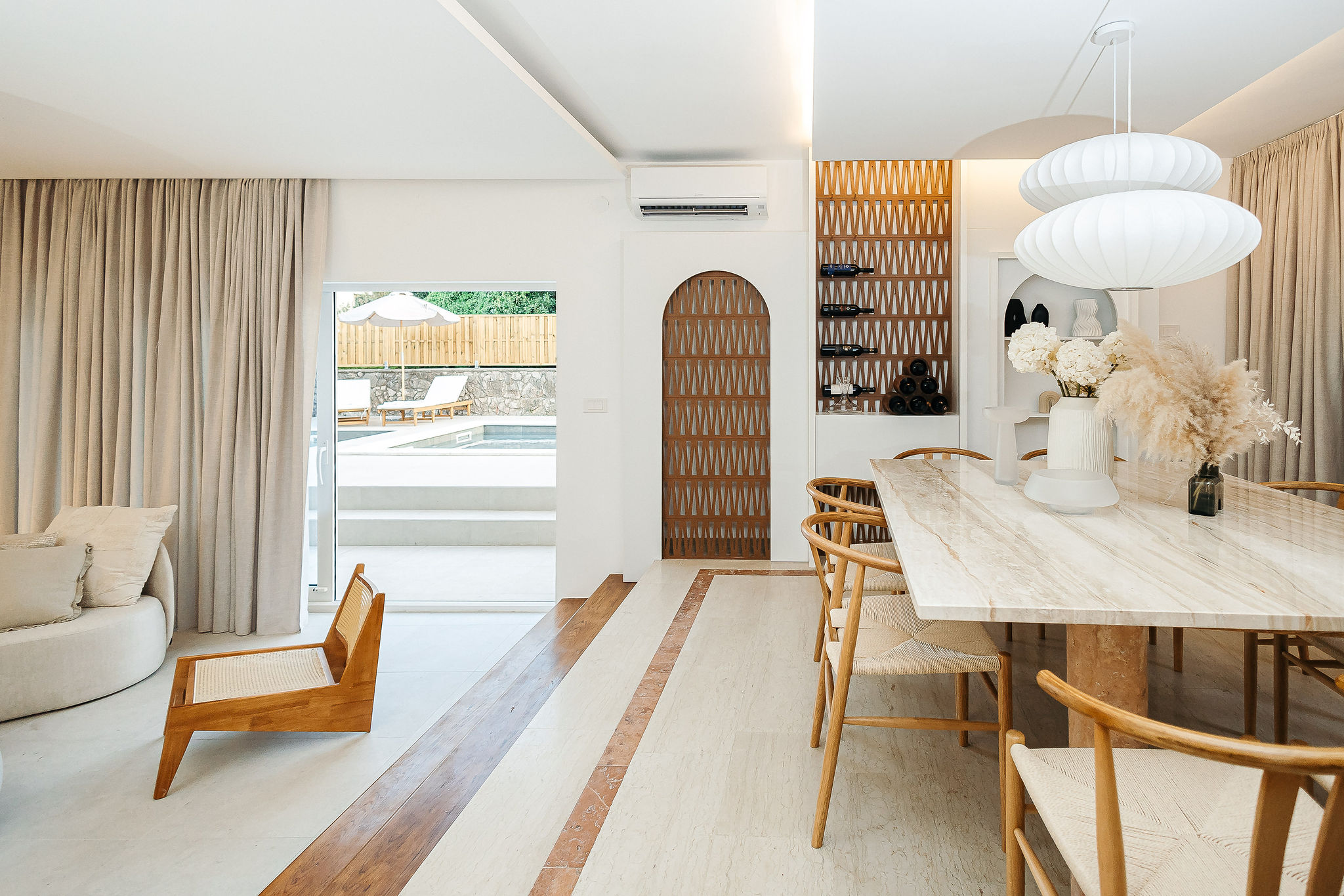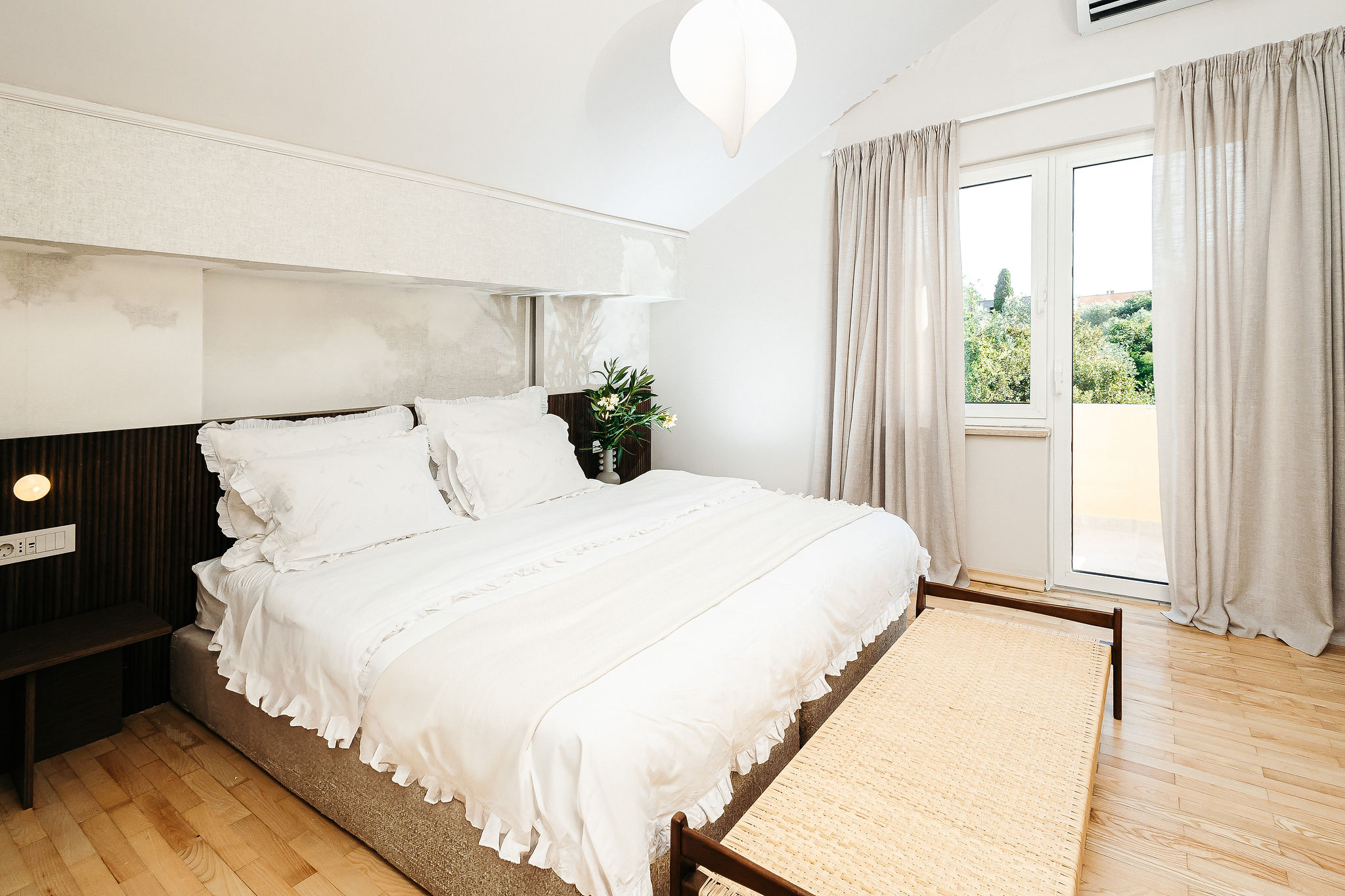 Bright interiors, generous proportions, and seamless indoor-outdoor flow define the interior of Villa Ksenia. On the ground floor, a spacious open-plan living area connects the lounge, dining space, and fully equipped kitchen. Large glass openings lead directly to the terrace and pool area, allowing natural light to fill the space throughout the day. This level also includes a sauna with dedicated shower, a full bathroom, and a separate laundry room. Upstairs, four air-conditioned bedrooms ensure restful privacy for every guest. Two bedrooms feature double beds (180x200 cm), while two offer twin beds that can be configured as doubles. Each bedroom includes a TV, ample storage, and carefully selected details designed for comfort. One bedroom opens onto a balcony with a partial sea view, while another overlooks the pool area. The first floor also features a second living room and an additional fully equipped kitchen, making the villa particularly suitable for extended families or two families sharing the property.