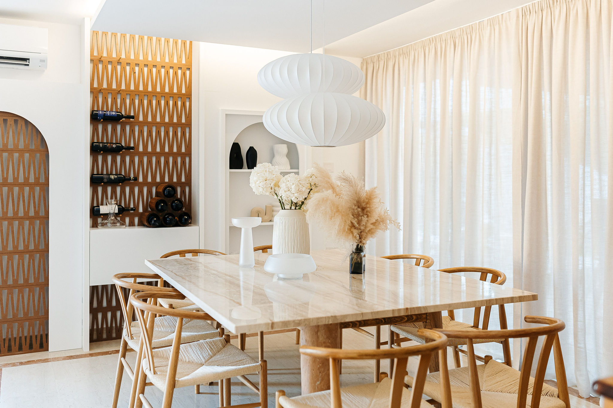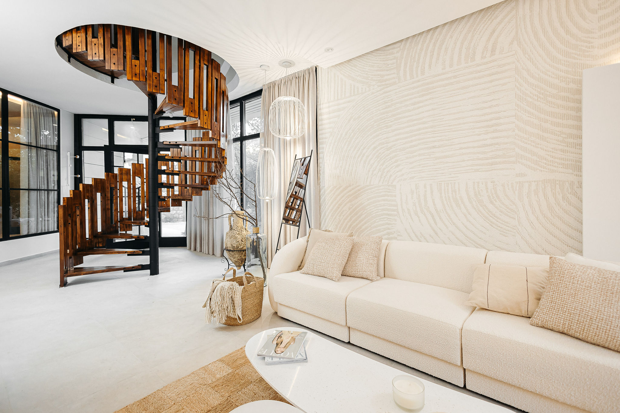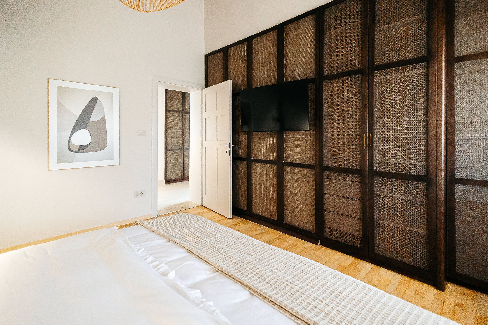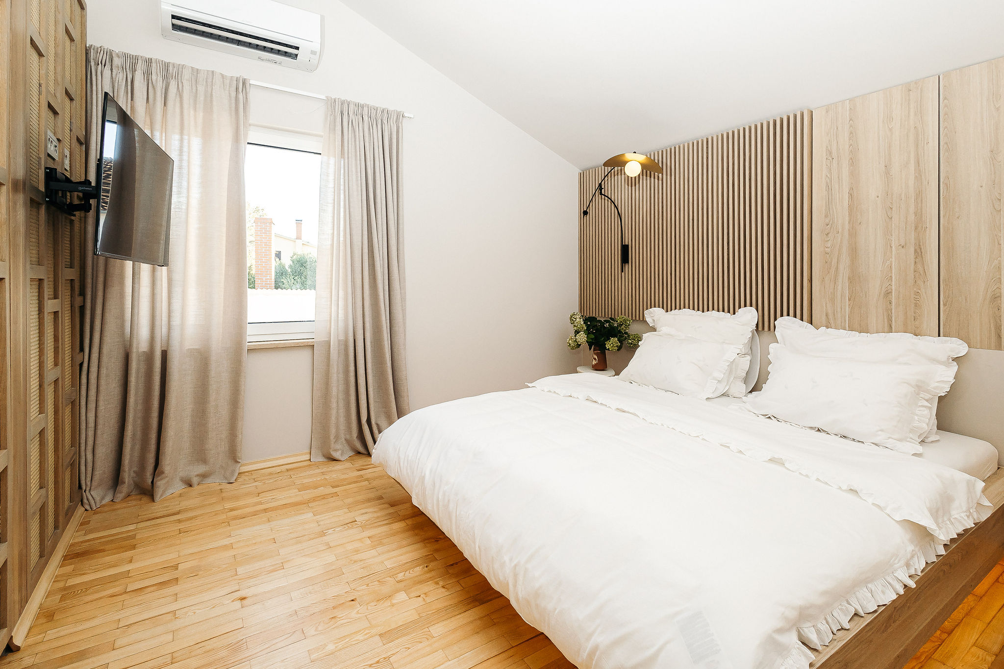 Bright interiors, generous proportions, and seamless indoor-outdoor flow define the interior of Villa Ksenia. On the ground floor, a spacious open-plan living area connects the lounge, dining space, and fully equipped kitchen. Large glass openings lead directly to the terrace and pool area, allowing natural light to fill the space throughout the day. This level also includes a sauna with dedicated shower, a full bathroom, and a separate laundry room. Upstairs, four air-conditioned bedrooms ensure restful privacy for every guest. Two bedrooms feature double beds (180x200 cm), while two offer twin beds that can be configured as doubles. Each bedroom includes a TV, ample storage, and carefully selected details designed for comfort. One bedroom opens onto a balcony with a partial sea view, while another overlooks the pool area. The first floor also features a second living room and an additional fully equipped kitchen, making the villa particularly suitable for extended families or two families sharing the property.