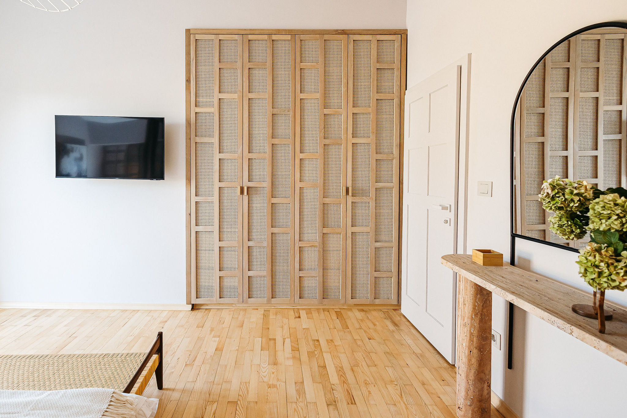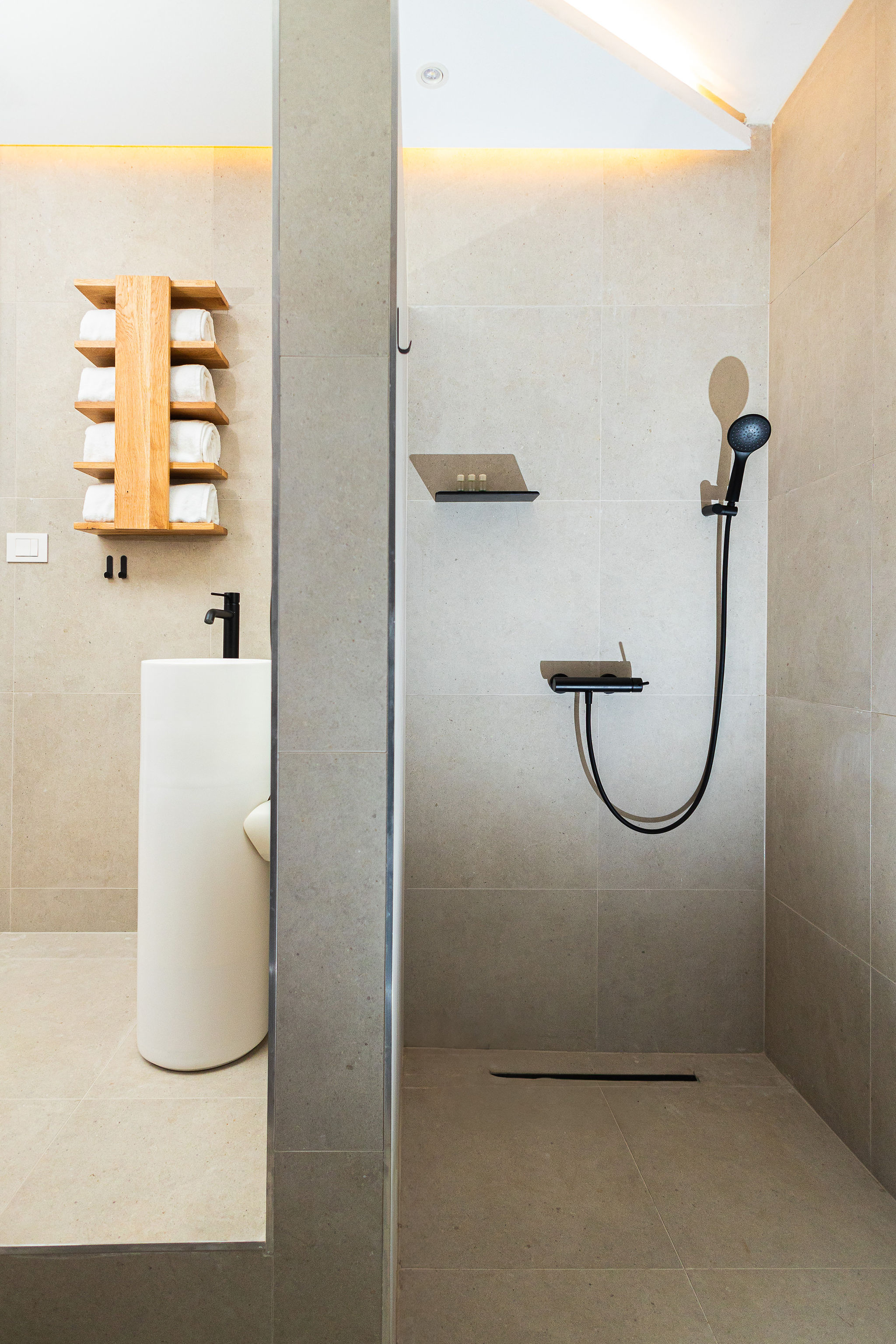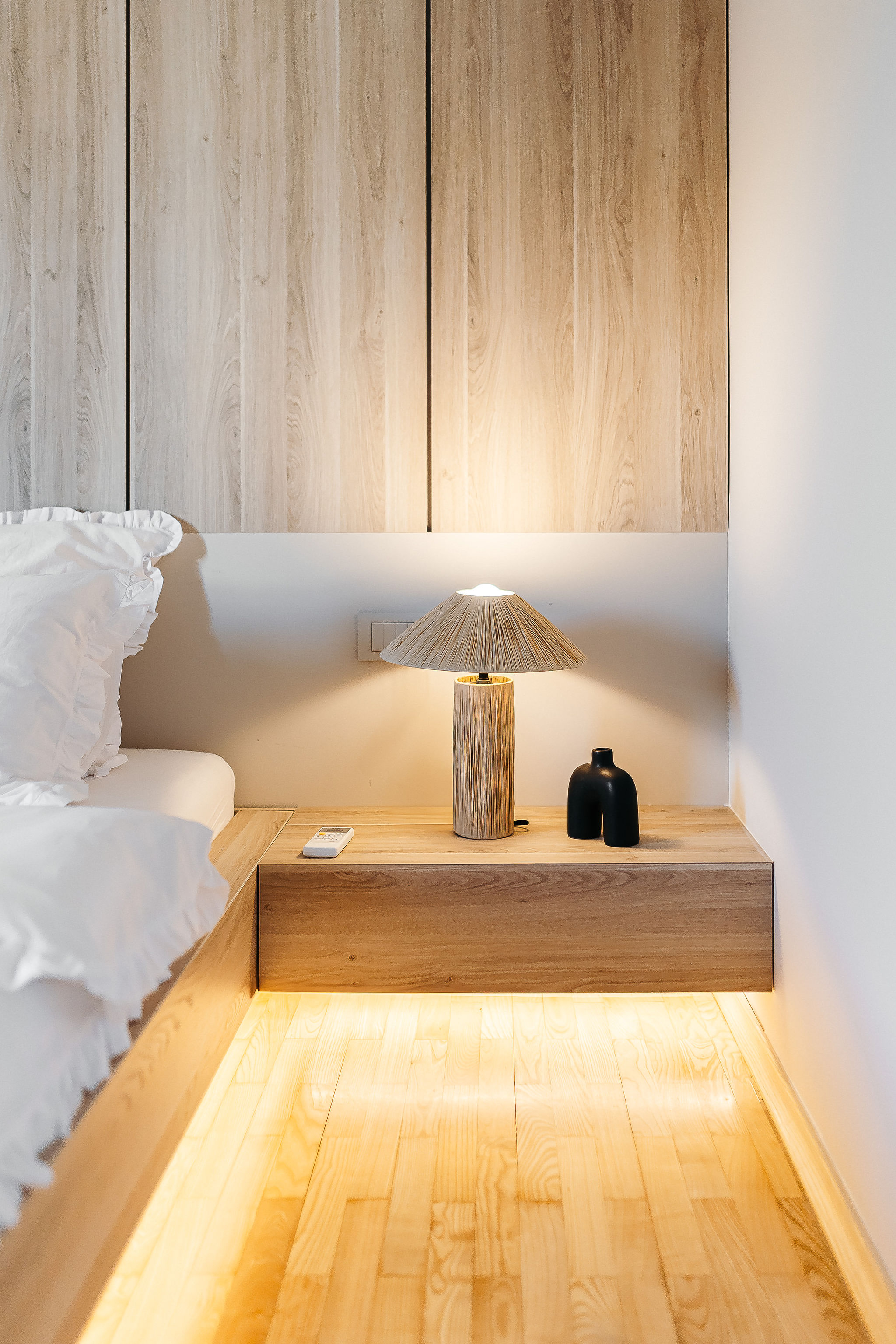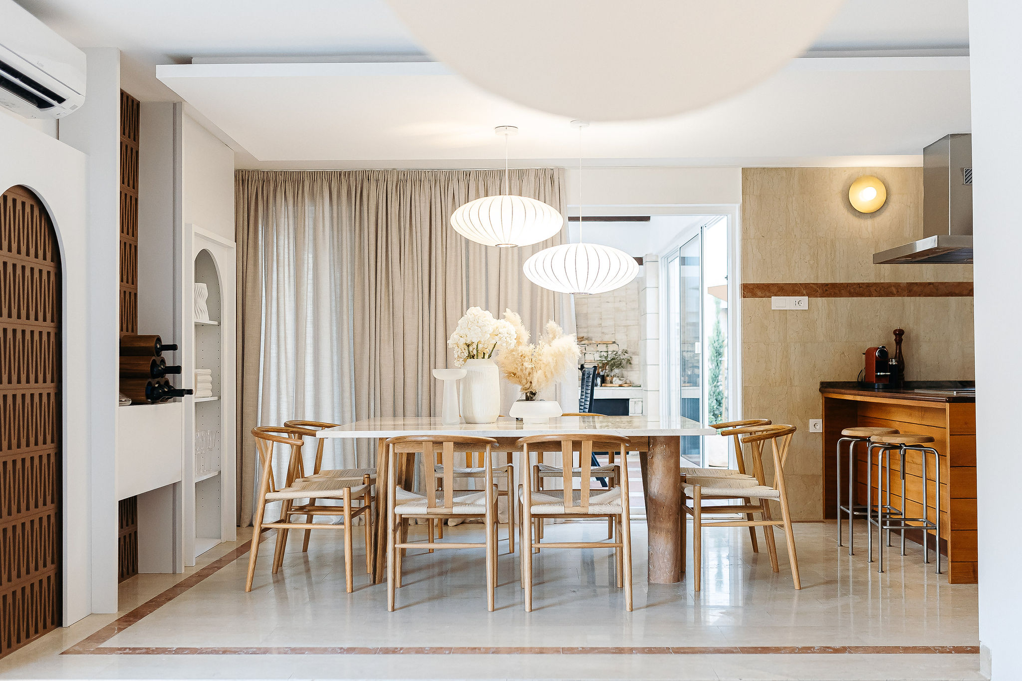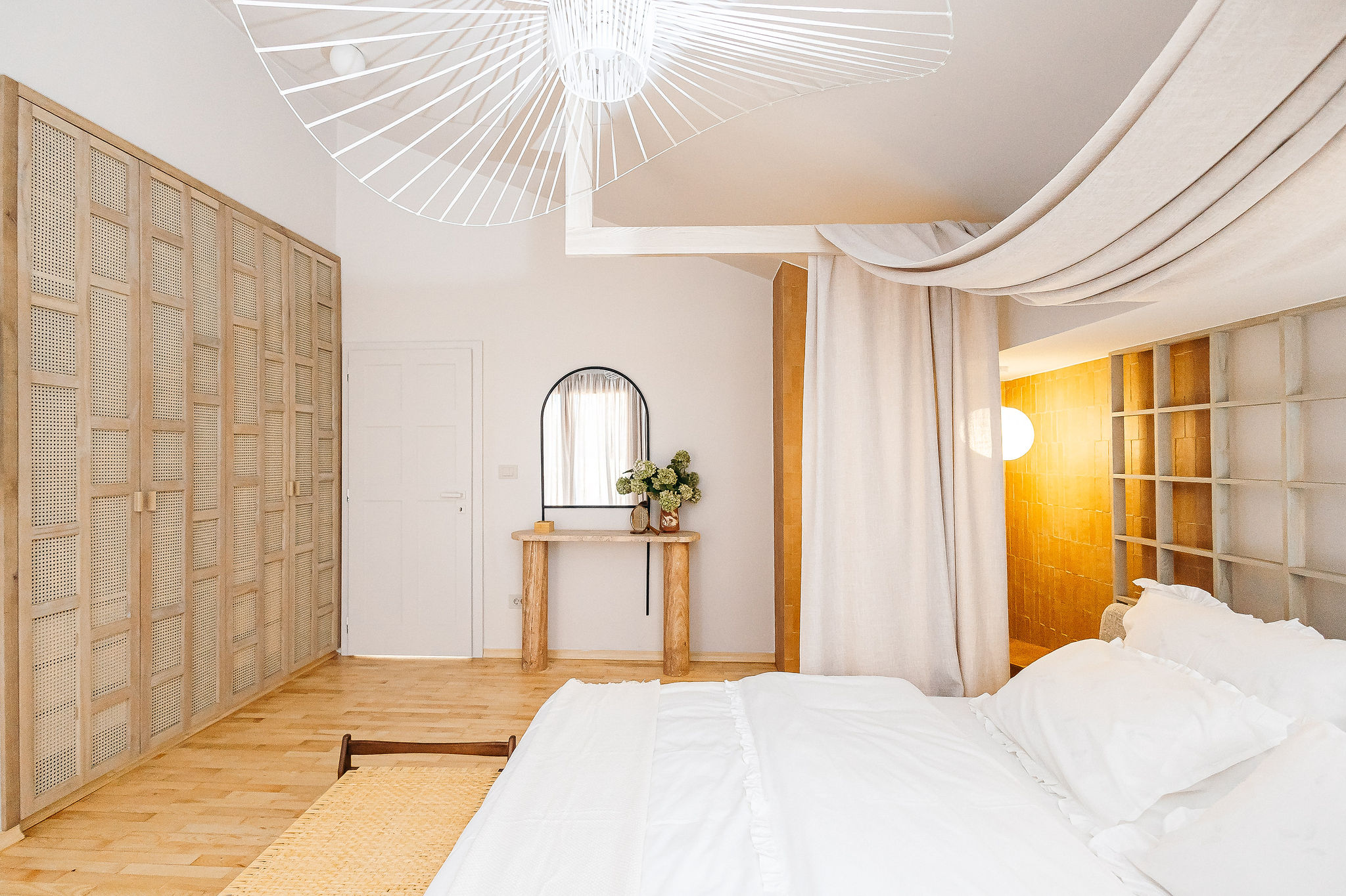 Bright interiors, generous proportions, and seamless indoor-outdoor flow define the interior of Villa Ksenia. On the ground floor, a spacious open-plan living area connects the lounge, dining space, and fully equipped kitchen. Large glass openings lead directly to the terrace and pool area, allowing natural light to fill the space throughout the day. This level also includes a sauna with dedicated shower, a full bathroom, and a separate laundry room. Upstairs, four air-conditioned bedrooms ensure restful privacy for every guest. Two bedrooms feature double beds (180x200 cm), while two offer twin beds that can be configured as doubles. Each bedroom includes a TV, ample storage, and carefully selected details designed for comfort. One bedroom opens onto a balcony with a partial sea view, while another overlooks the pool area. The first floor also features a second living room and an additional fully equipped kitchen, making the villa particularly suitable for extended families or two families sharing the property.