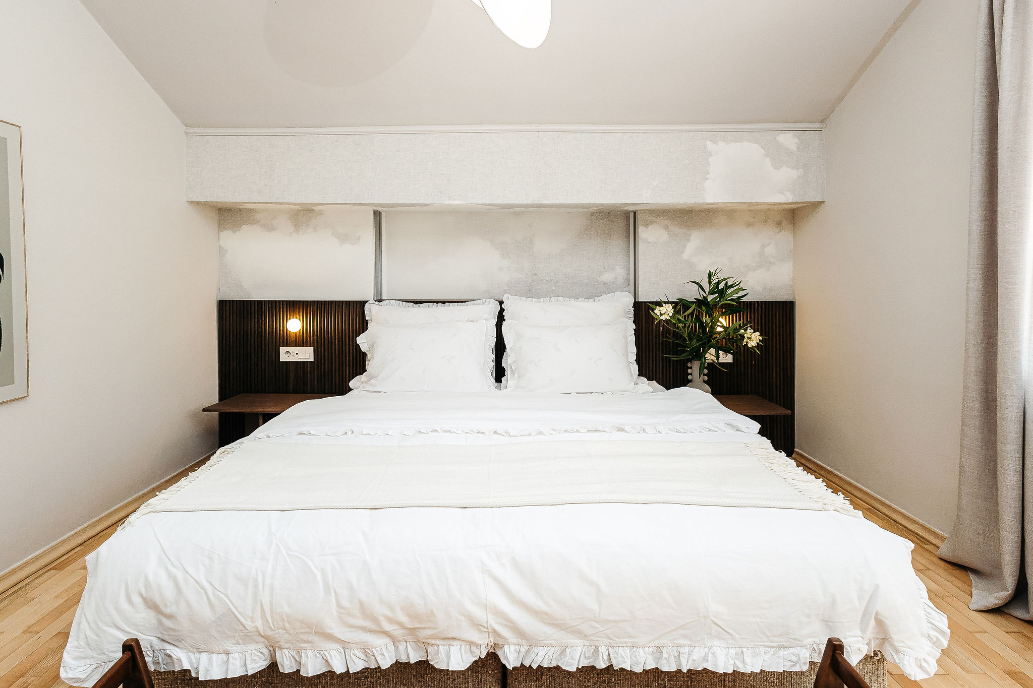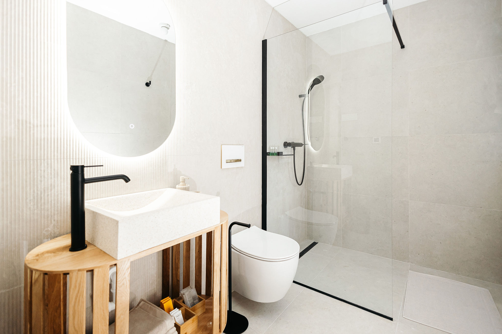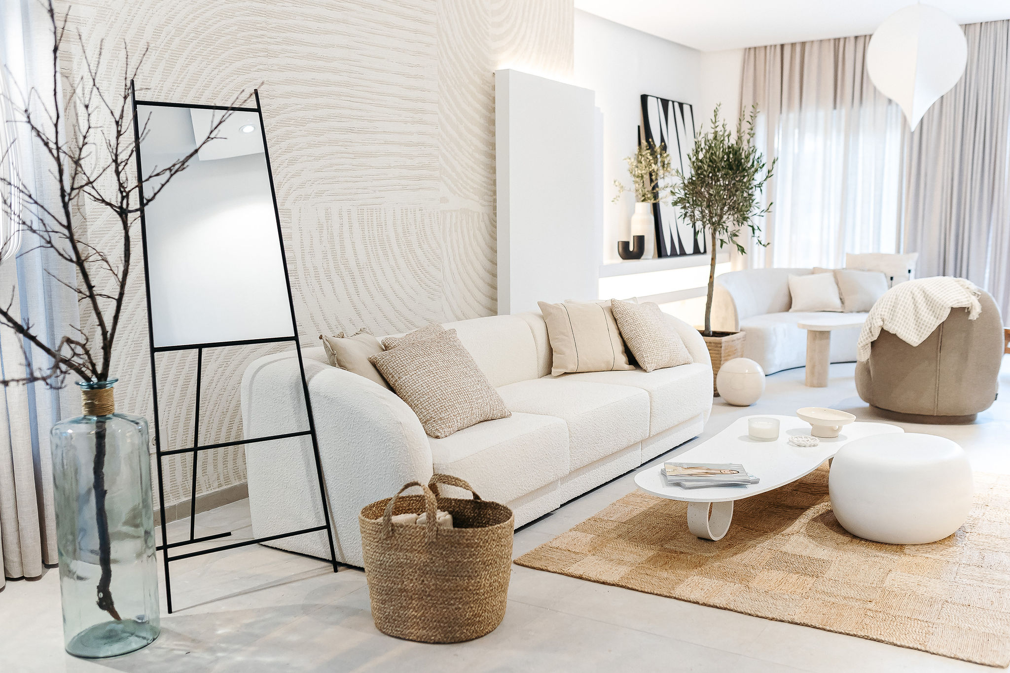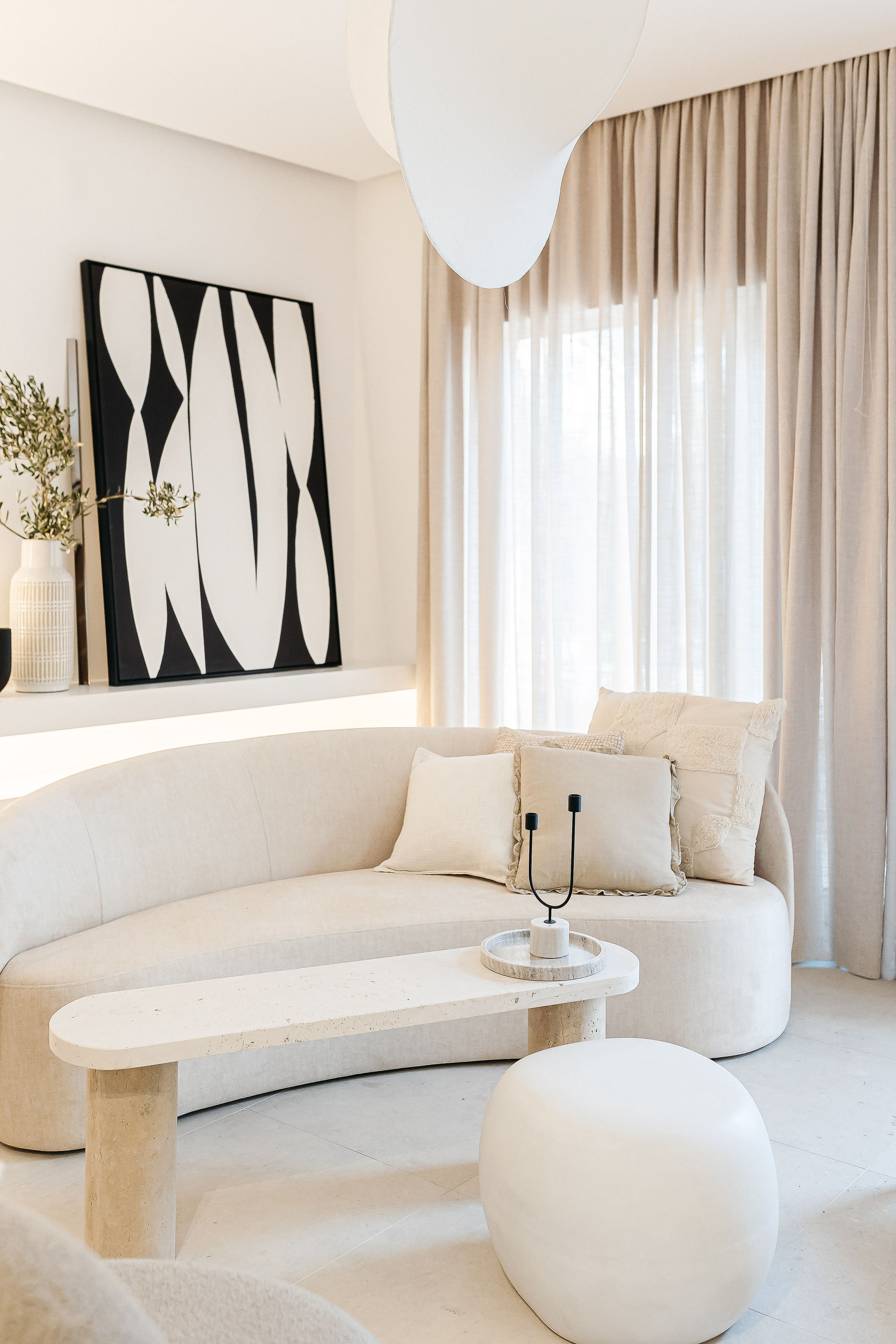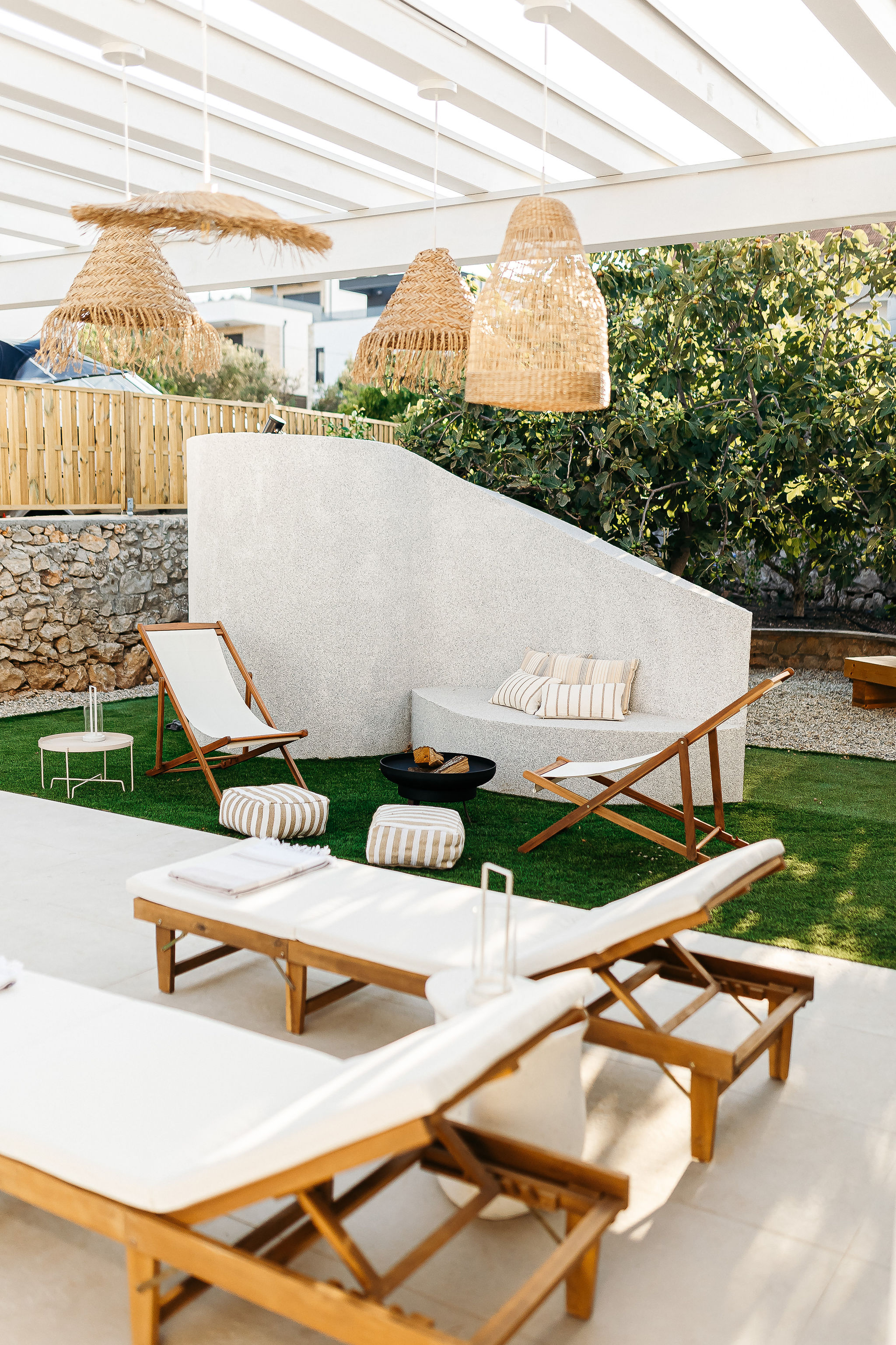 Bright interiors, generous proportions, and seamless indoor-outdoor flow define the interior of Villa Ksenia. On the ground floor, a spacious open-plan living area connects the lounge, dining space, and fully equipped kitchen. Large glass openings lead directly to the terrace and pool area, allowing natural light to fill the space throughout the day. This level also includes a sauna with dedicated shower, a full bathroom, and a separate laundry room. Upstairs, four air-conditioned bedrooms ensure restful privacy for every guest. Two bedrooms feature double beds (180x200 cm), while two offer twin beds that can be configured as doubles. Each bedroom includes a TV, ample storage, and carefully selected details designed for comfort. One bedroom opens onto a balcony with a partial sea view, while another overlooks the pool area. The first floor also features a second living room and an additional fully equipped kitchen, making the villa particularly suitable for extended families or two families sharing the property.