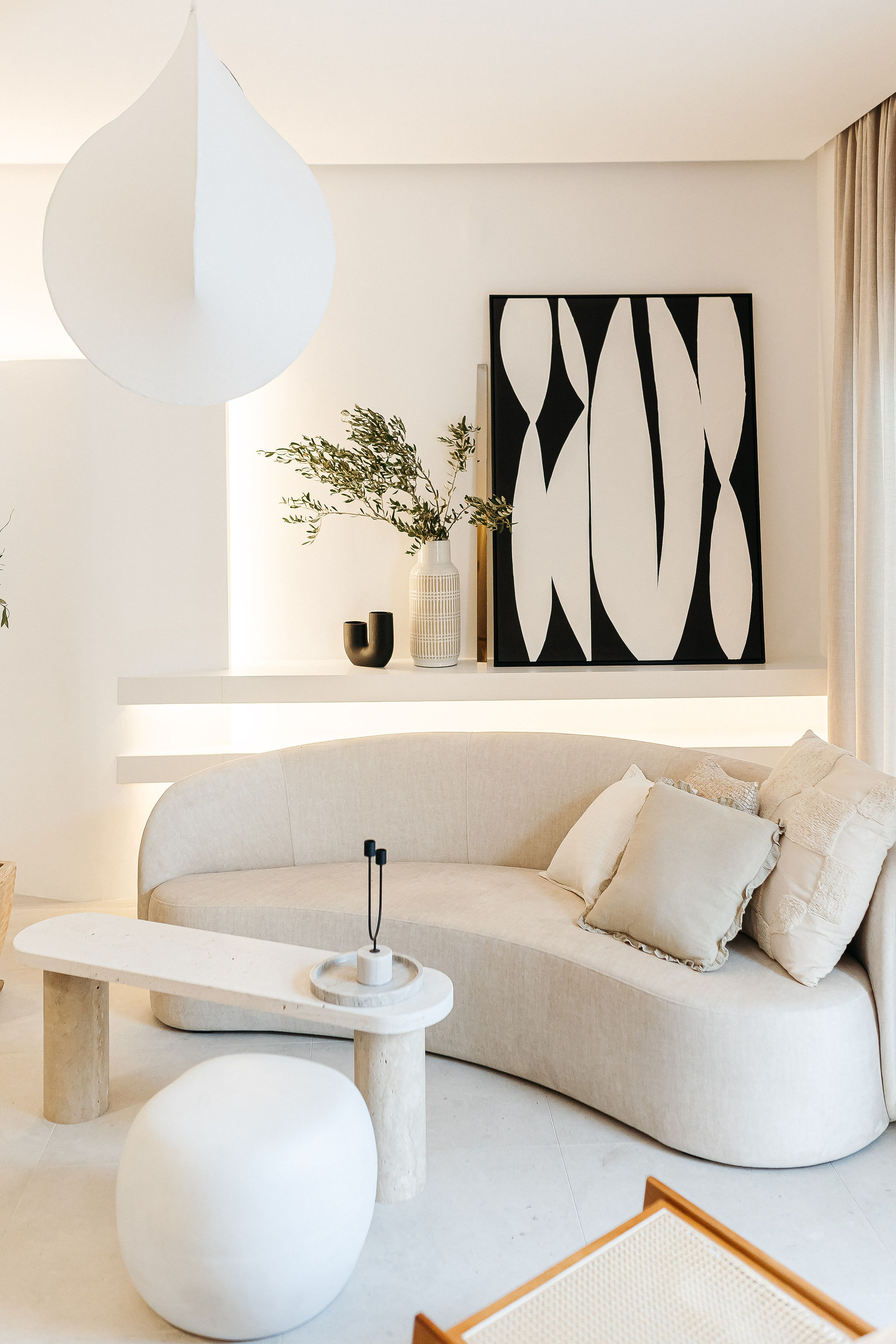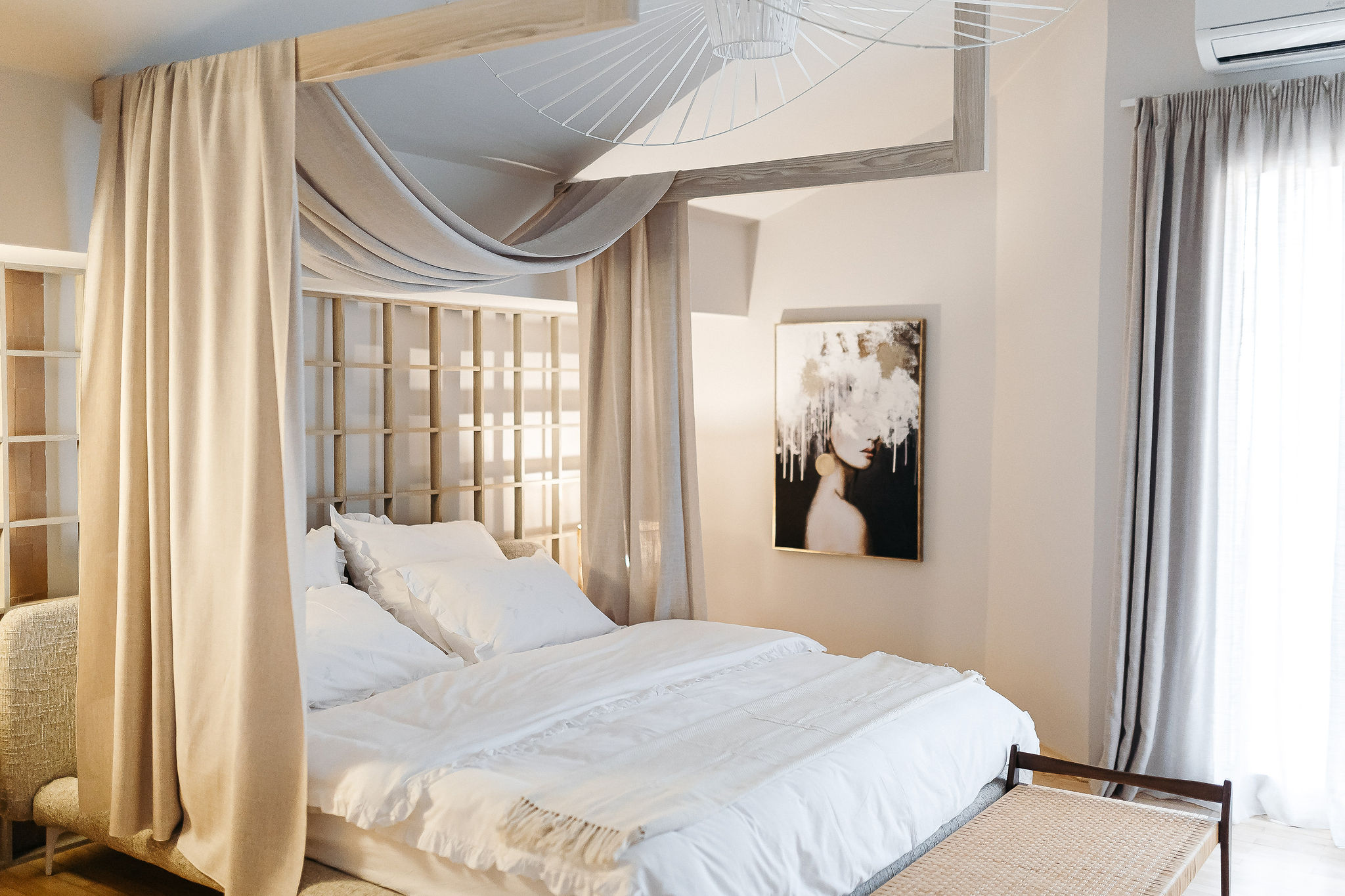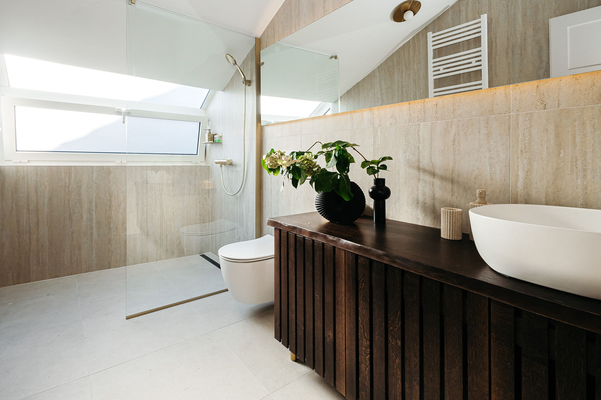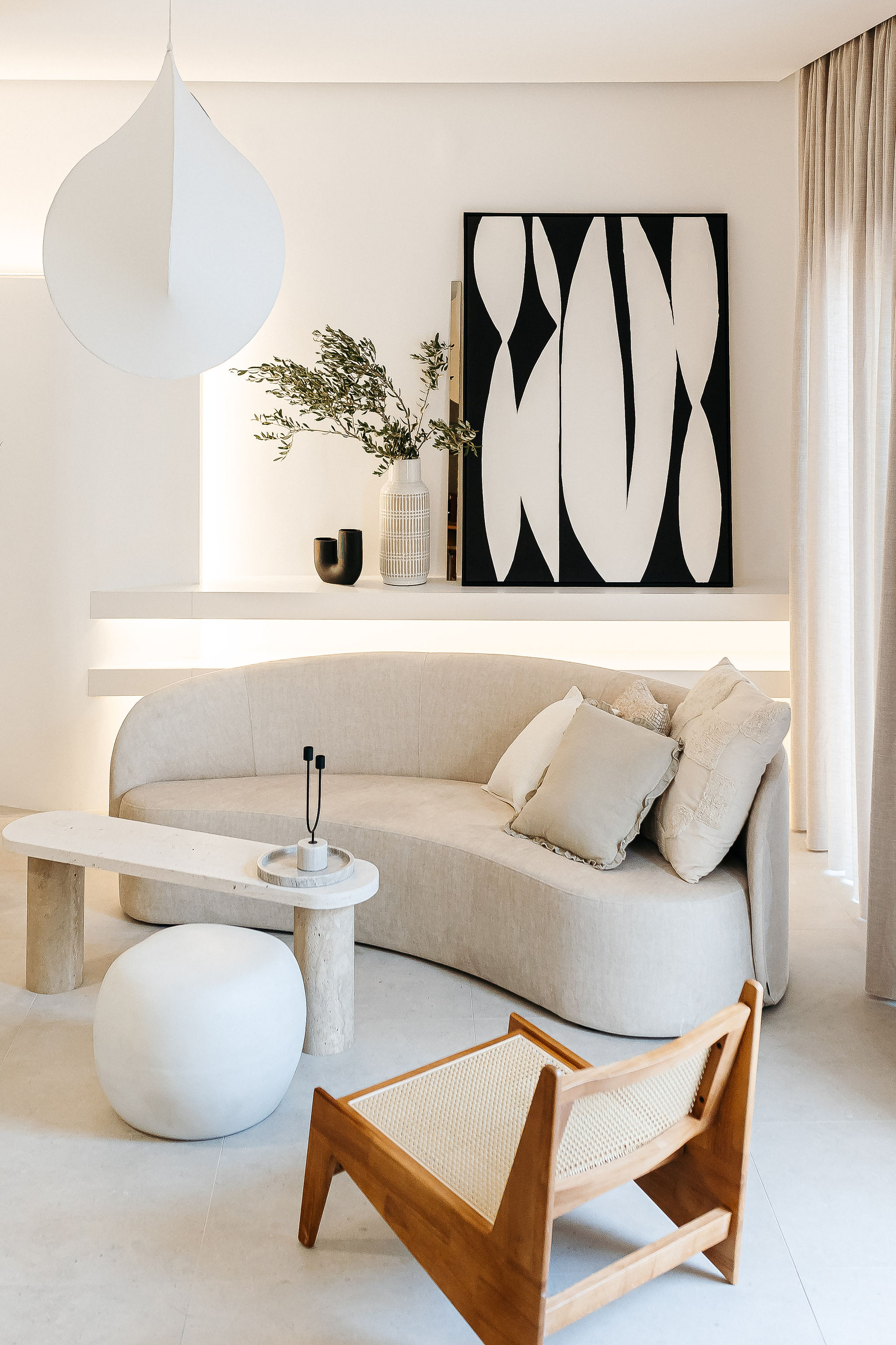 Bright interiors, generous proportions, and seamless indoor-outdoor flow define the interior of Villa Ksenia. On the ground floor, a spacious open-plan living area connects the lounge, dining space, and fully equipped kitchen. Large glass openings lead directly to the terrace and pool area, allowing natural light to fill the space throughout the day. This level also includes a sauna with dedicated shower, a full bathroom, and a separate laundry room. Upstairs, four air-conditioned bedrooms ensure restful privacy for every guest. Two bedrooms feature double beds (180x200 cm), while two offer twin beds that can be configured as doubles. Each bedroom includes a TV, ample storage, and carefully selected details designed for comfort. One bedroom opens onto a balcony with a partial sea view, while another overlooks the pool area. The first floor also features a second living room and an additional fully equipped kitchen, making the villa particularly suitable for extended families or two families sharing the property.