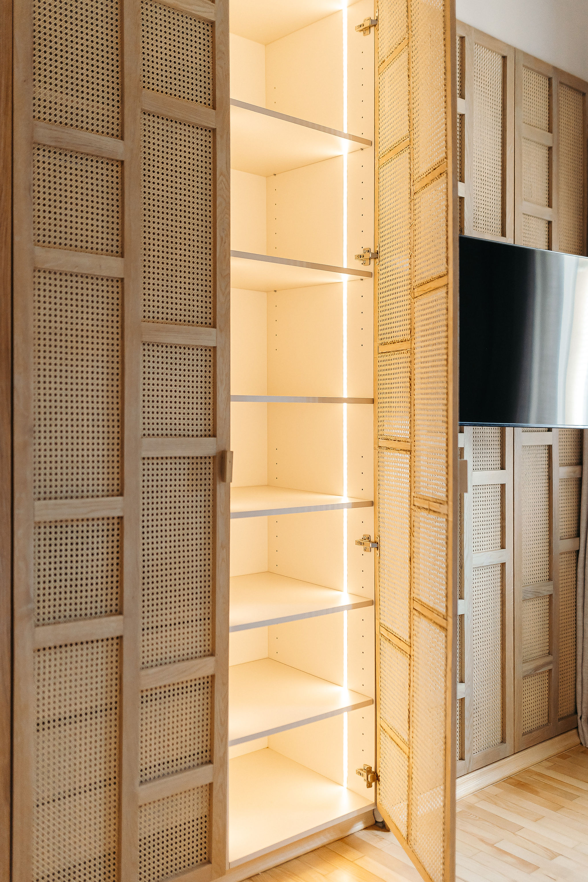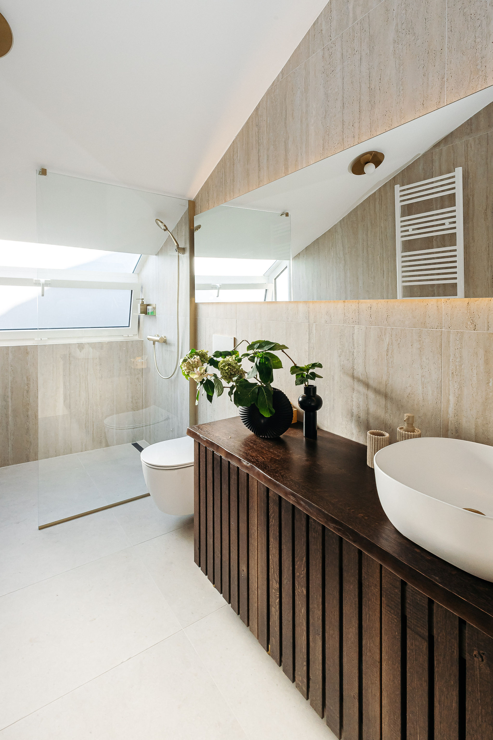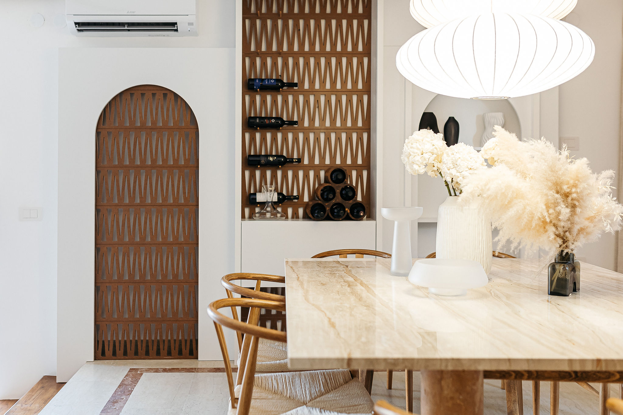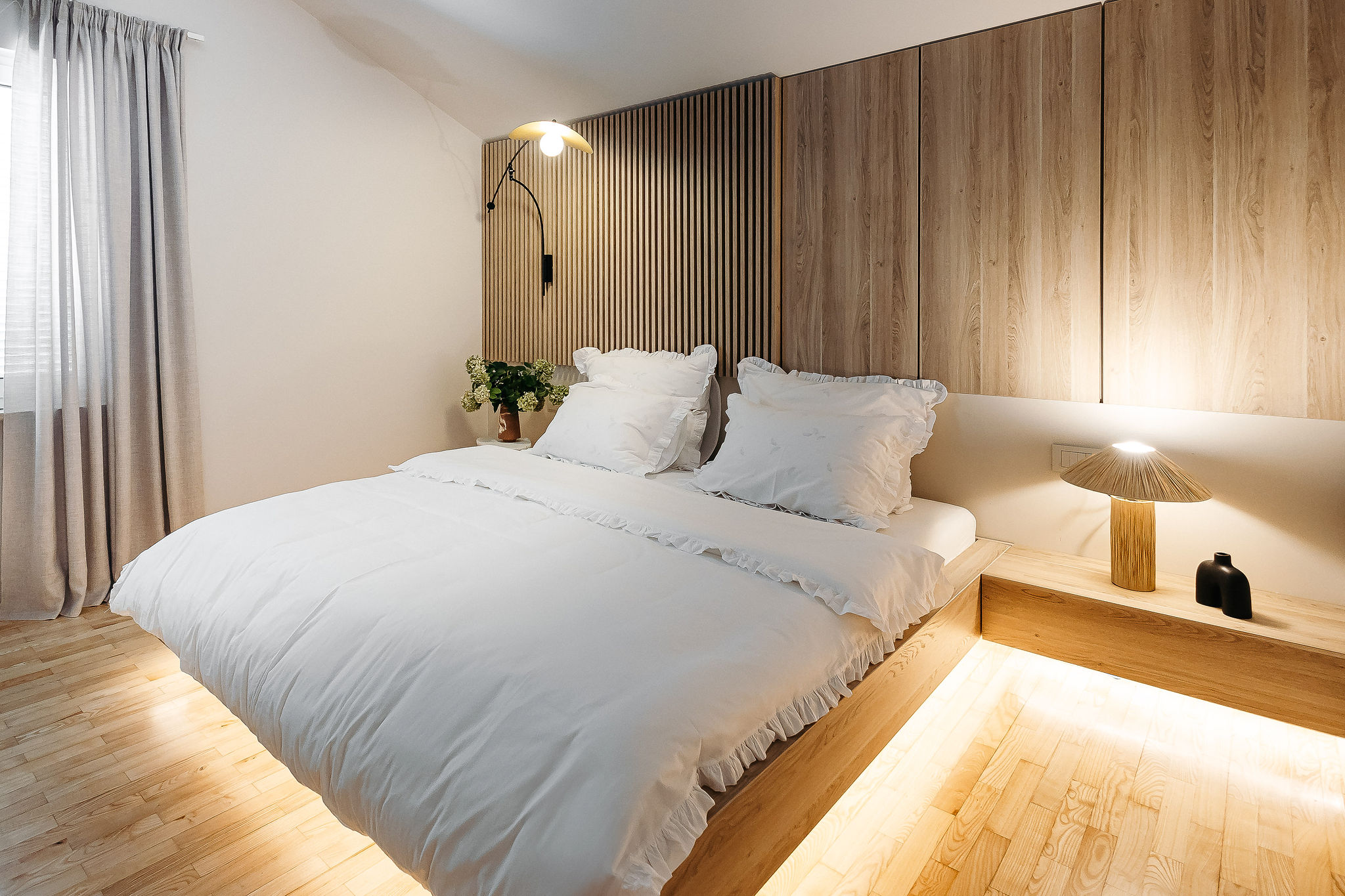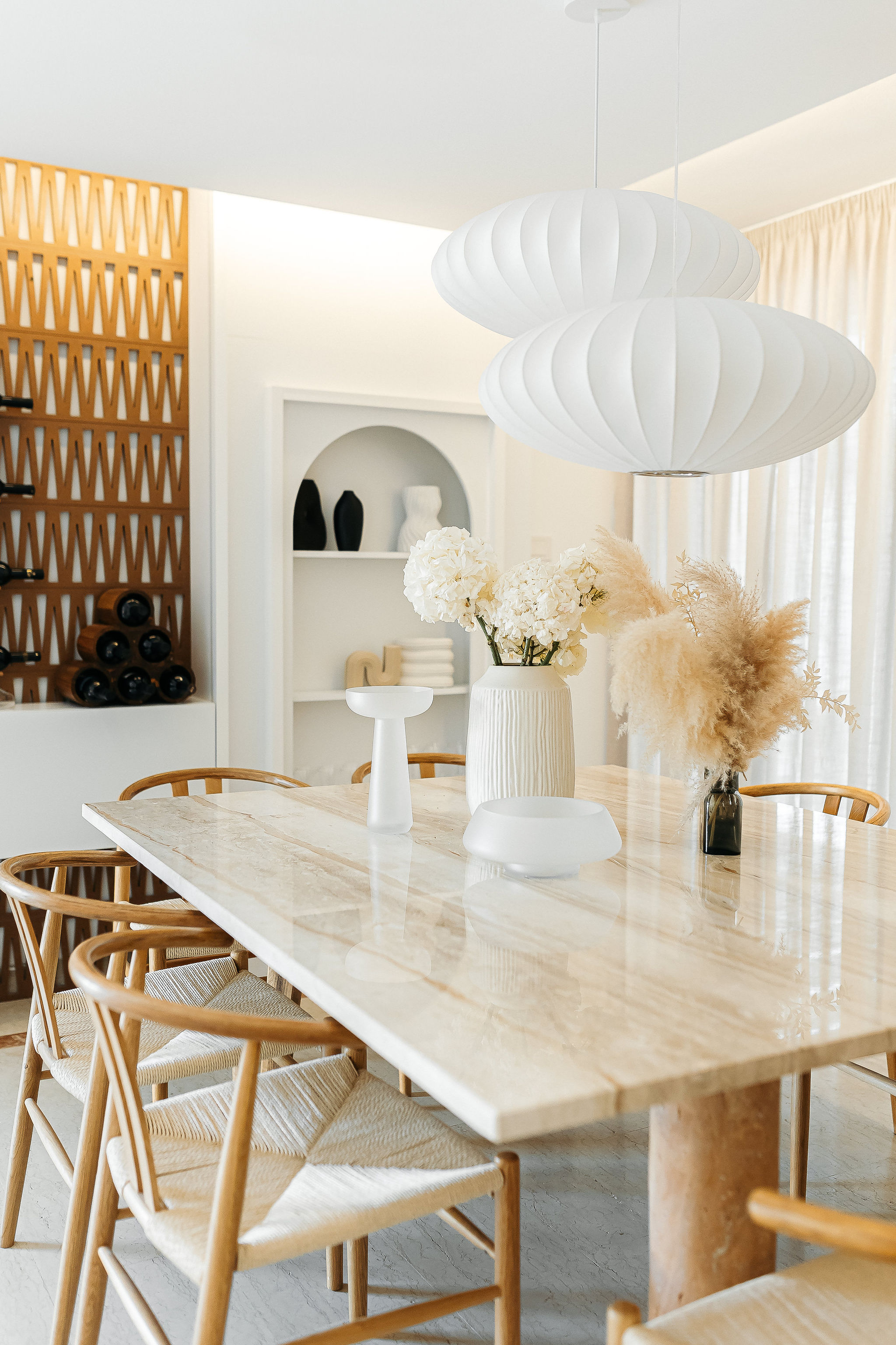 Bright interiors, generous proportions, and seamless indoor-outdoor flow define the interior of Villa Ksenia. On the ground floor, a spacious open-plan living area connects the lounge, dining space, and fully equipped kitchen. Large glass openings lead directly to the terrace and pool area, allowing natural light to fill the space throughout the day. This level also includes a sauna with dedicated shower, a full bathroom, and a separate laundry room. Upstairs, four air-conditioned bedrooms ensure restful privacy for every guest. Two bedrooms feature double beds (180x200 cm), while two offer twin beds that can be configured as doubles. Each bedroom includes a TV, ample storage, and carefully selected details designed for comfort. One bedroom opens onto a balcony with a partial sea view, while another overlooks the pool area. The first floor also features a second living room and an additional fully equipped kitchen, making the villa particularly suitable for extended families or two families sharing the property.