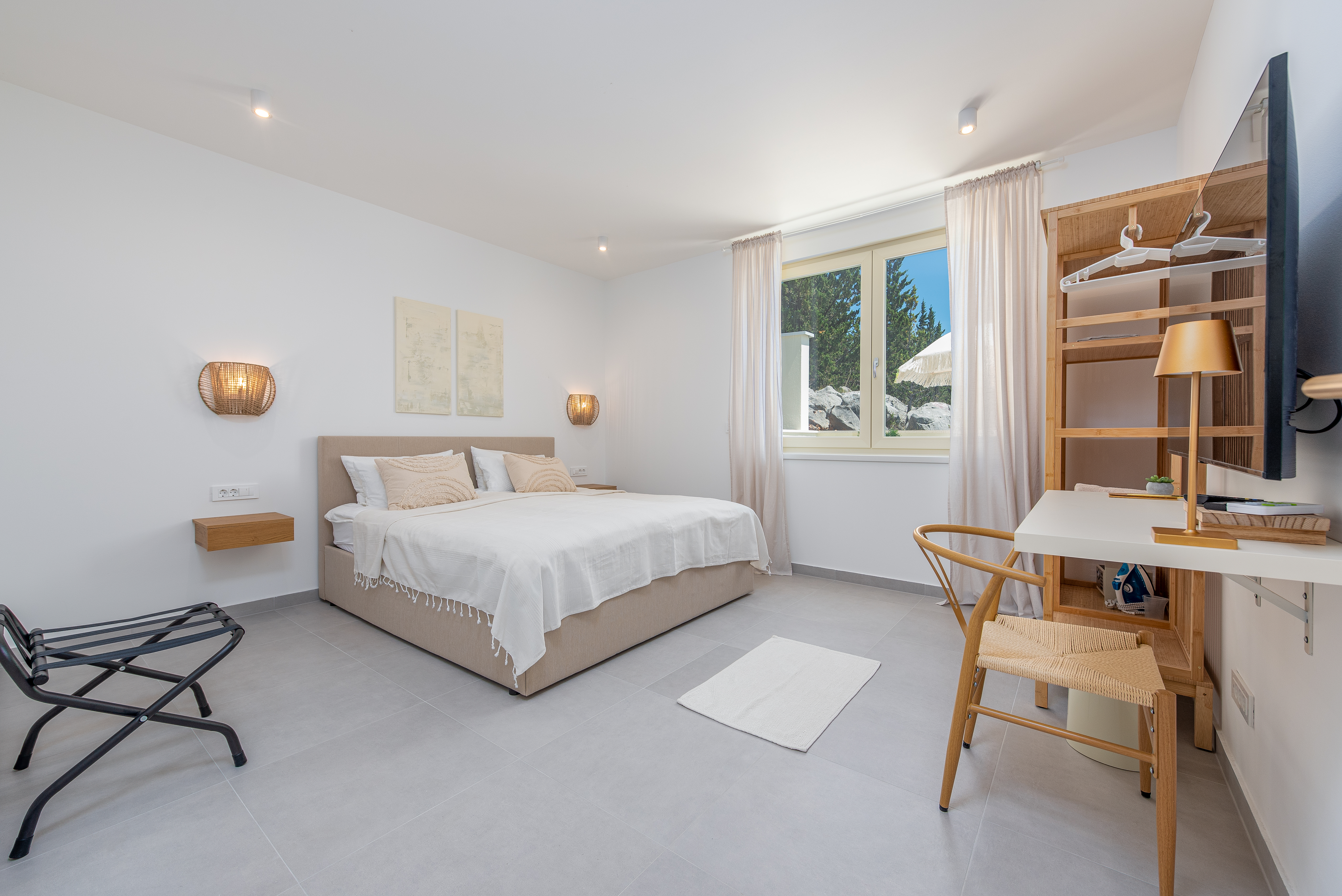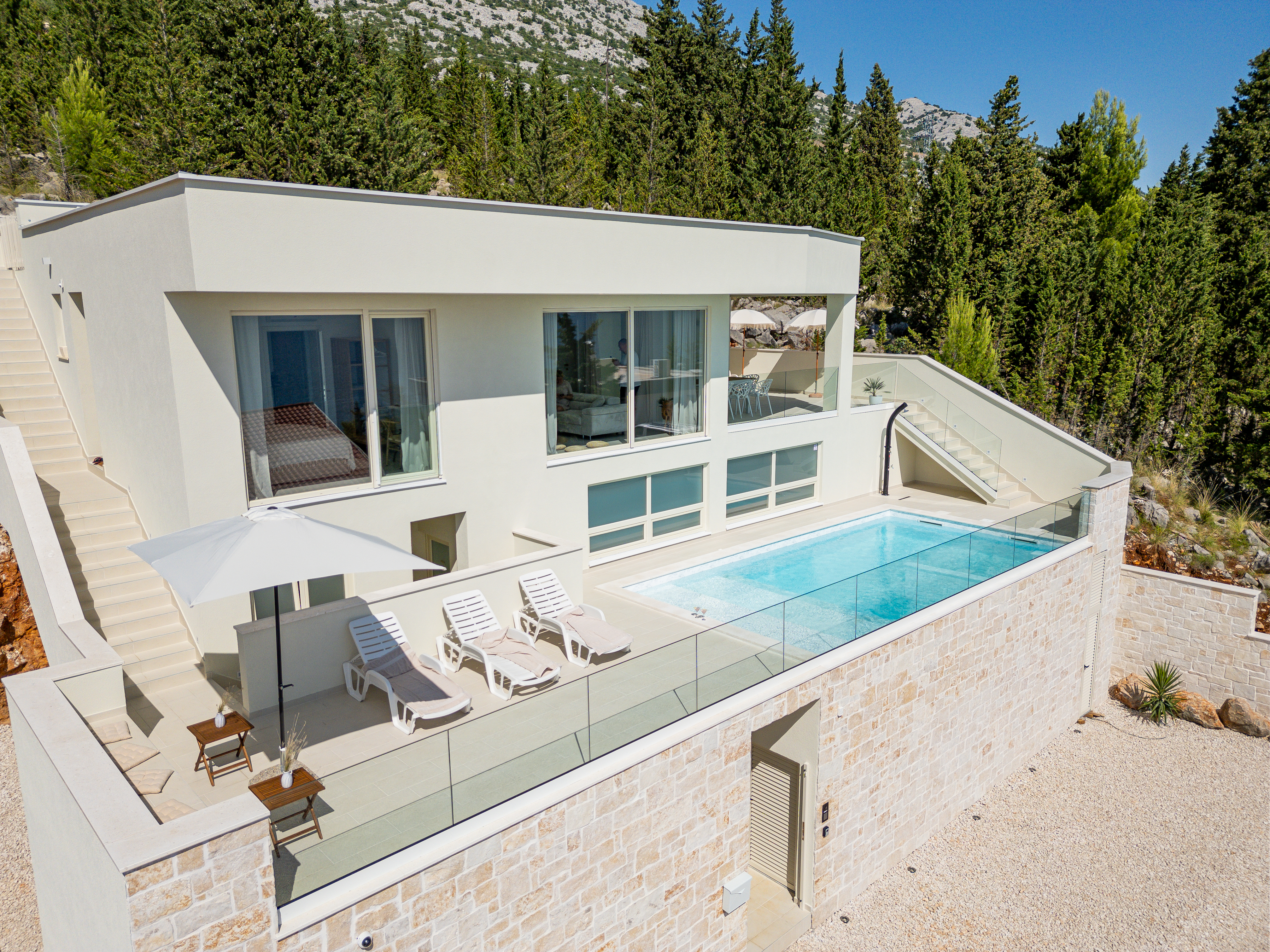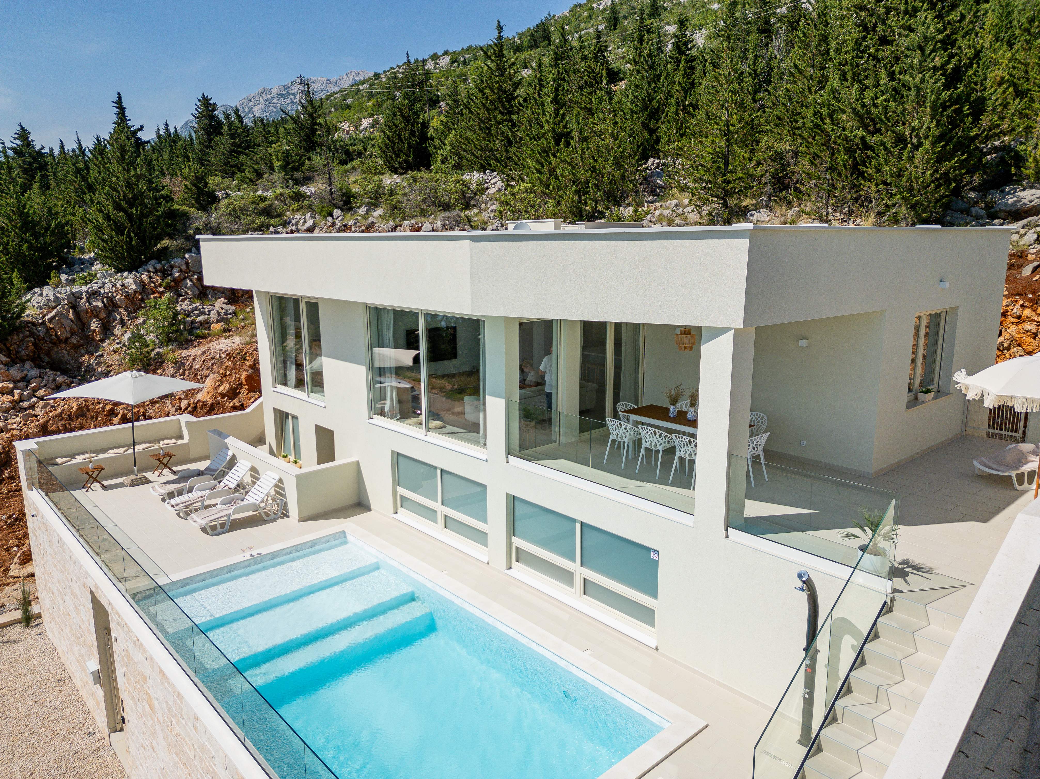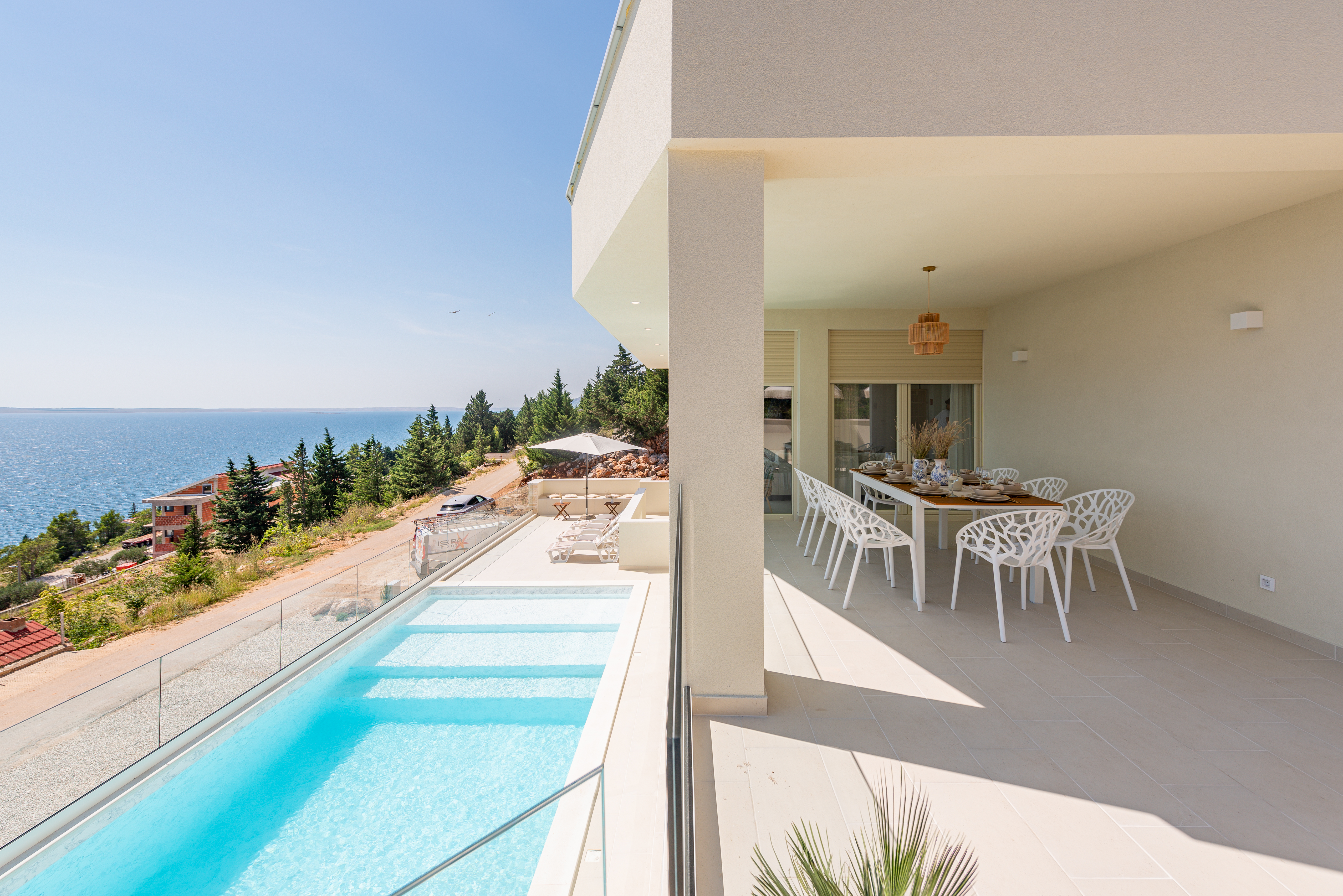 Just 700 meters from the villa, you'll find a beautiful beach, perfect for a relaxing day by the water. The outdoor area features a sparkling pool with comfortable loungers and stylish fringe parasols, alongside an outdoor shower. Relax in the sun with a beautiful view of the sea and surrounding forest. A shaded dining area with an electric grill is ideal for alfresco dining.