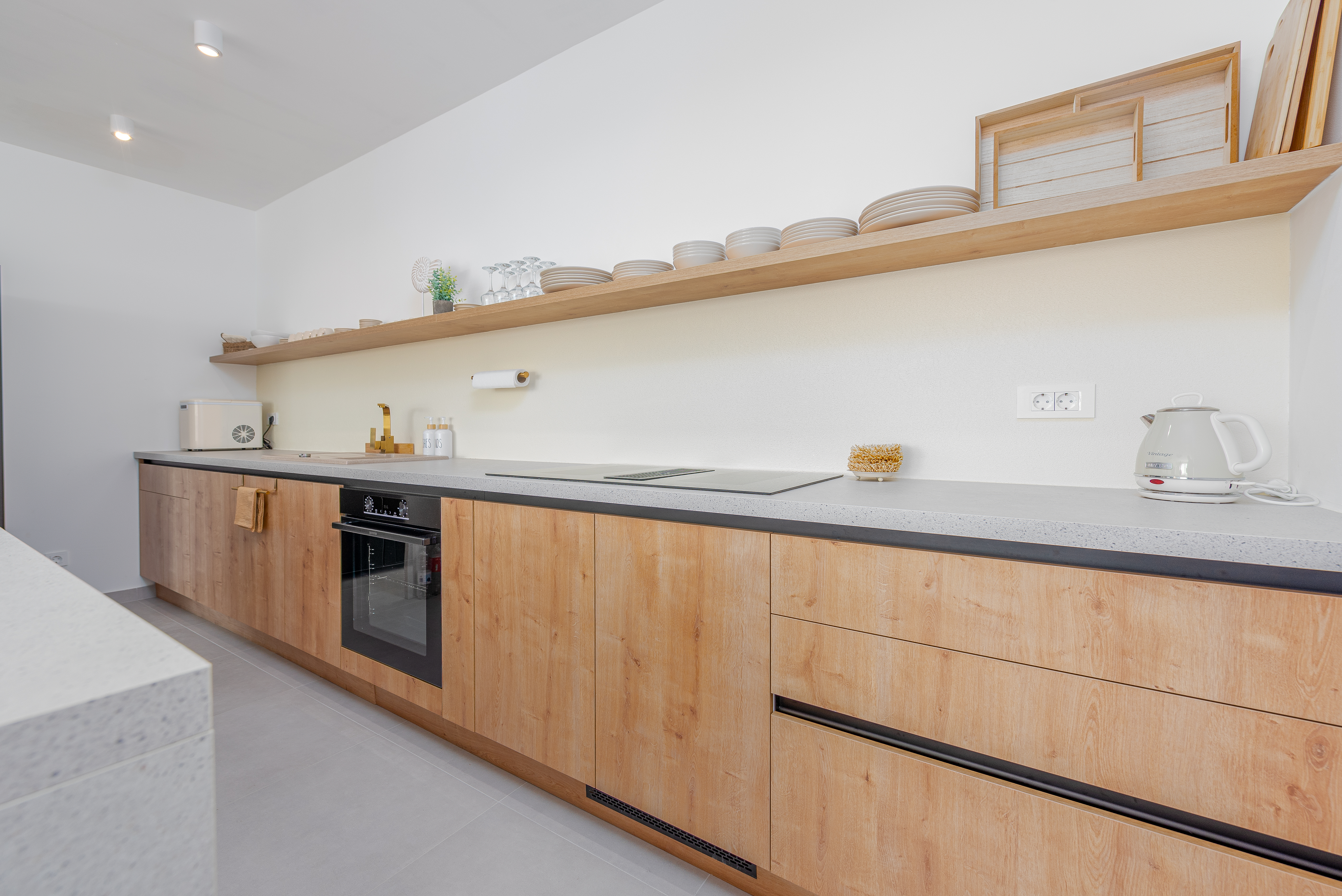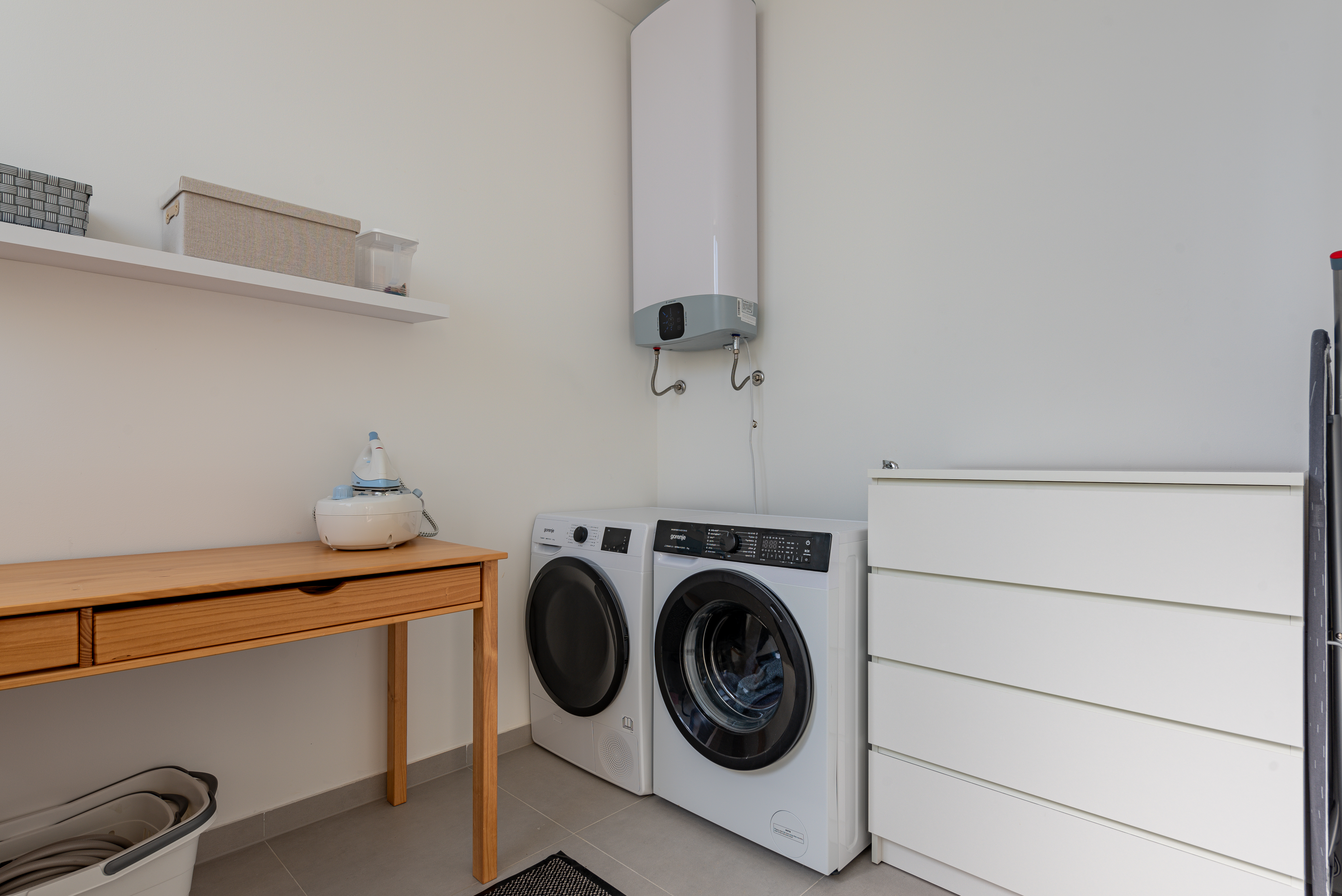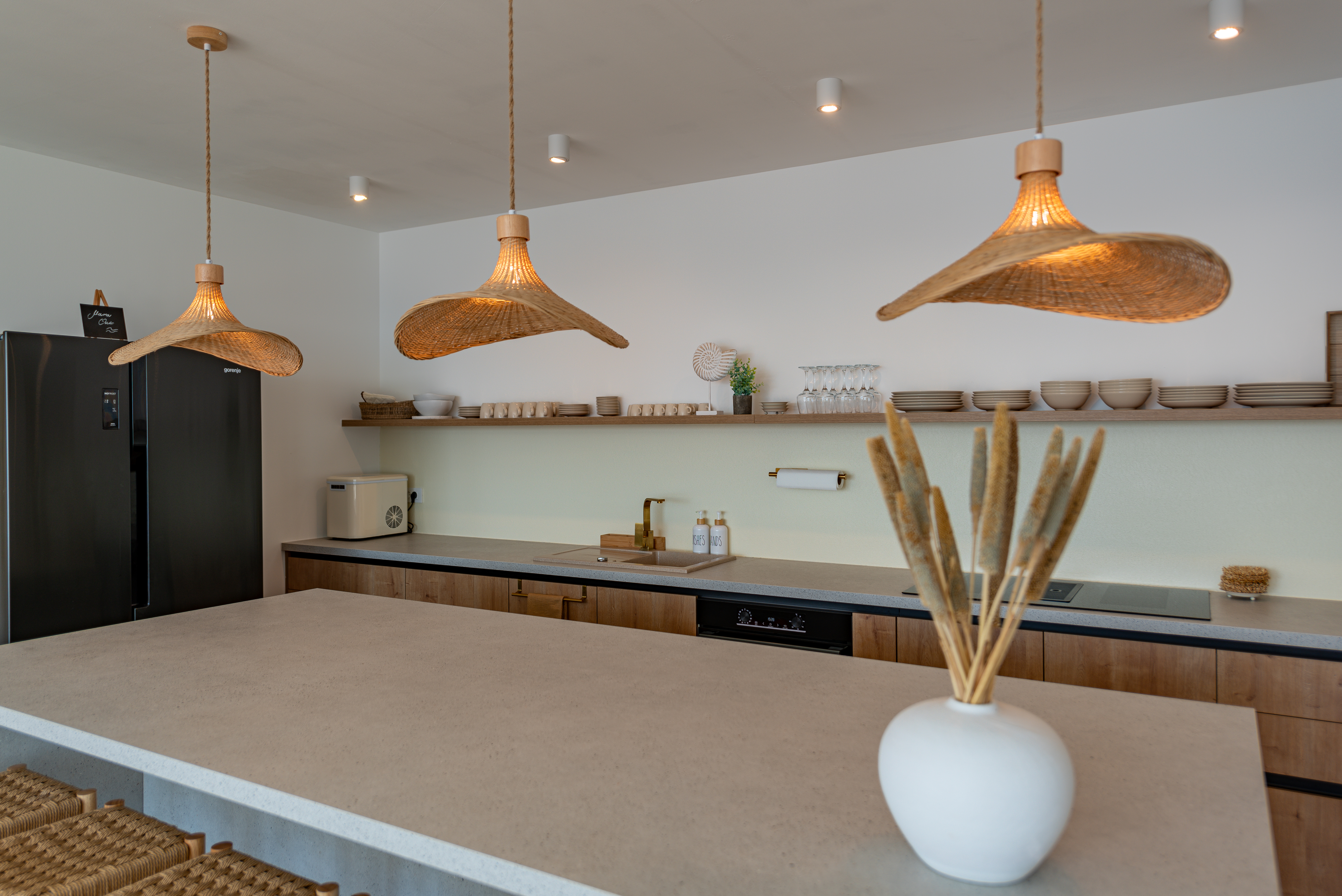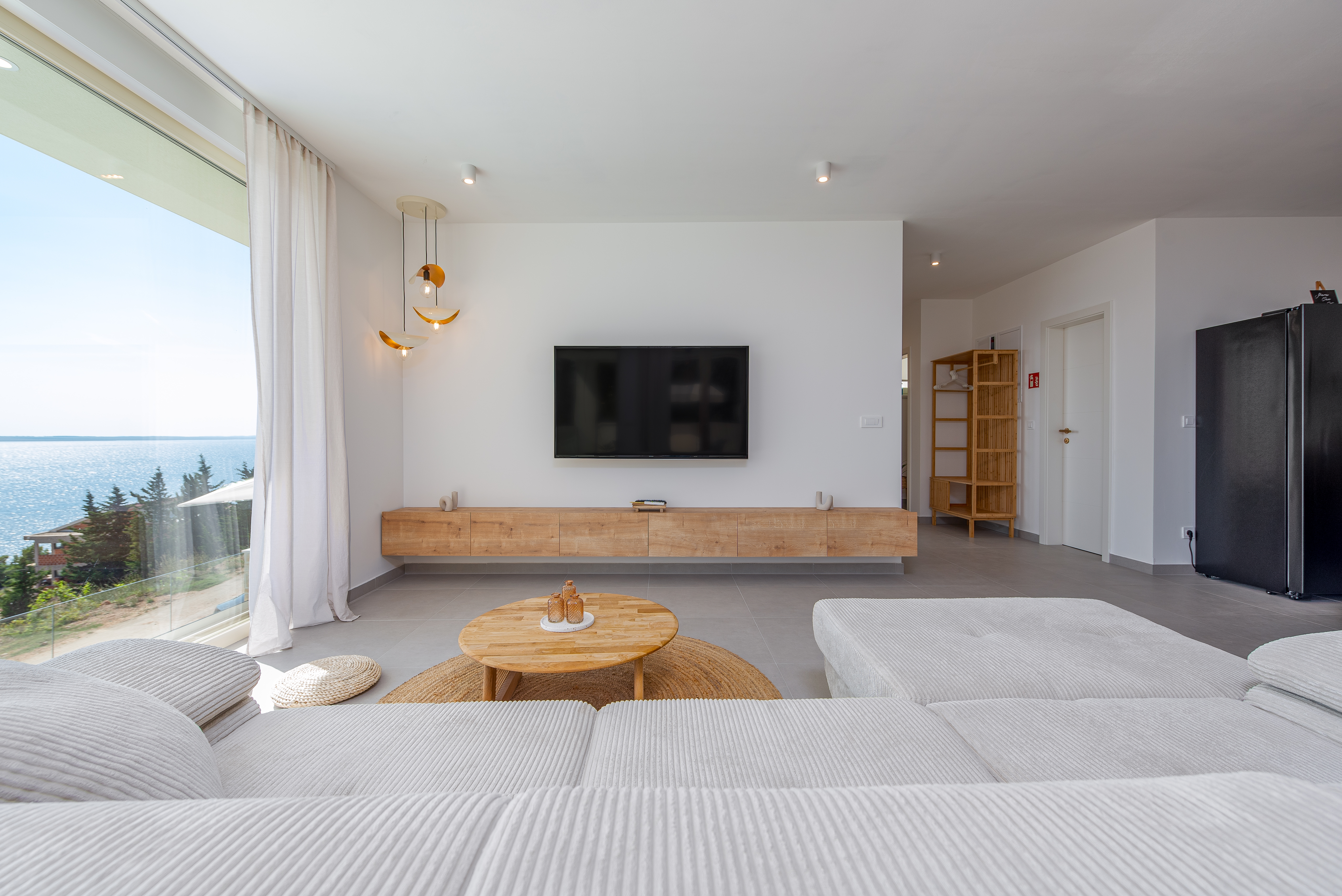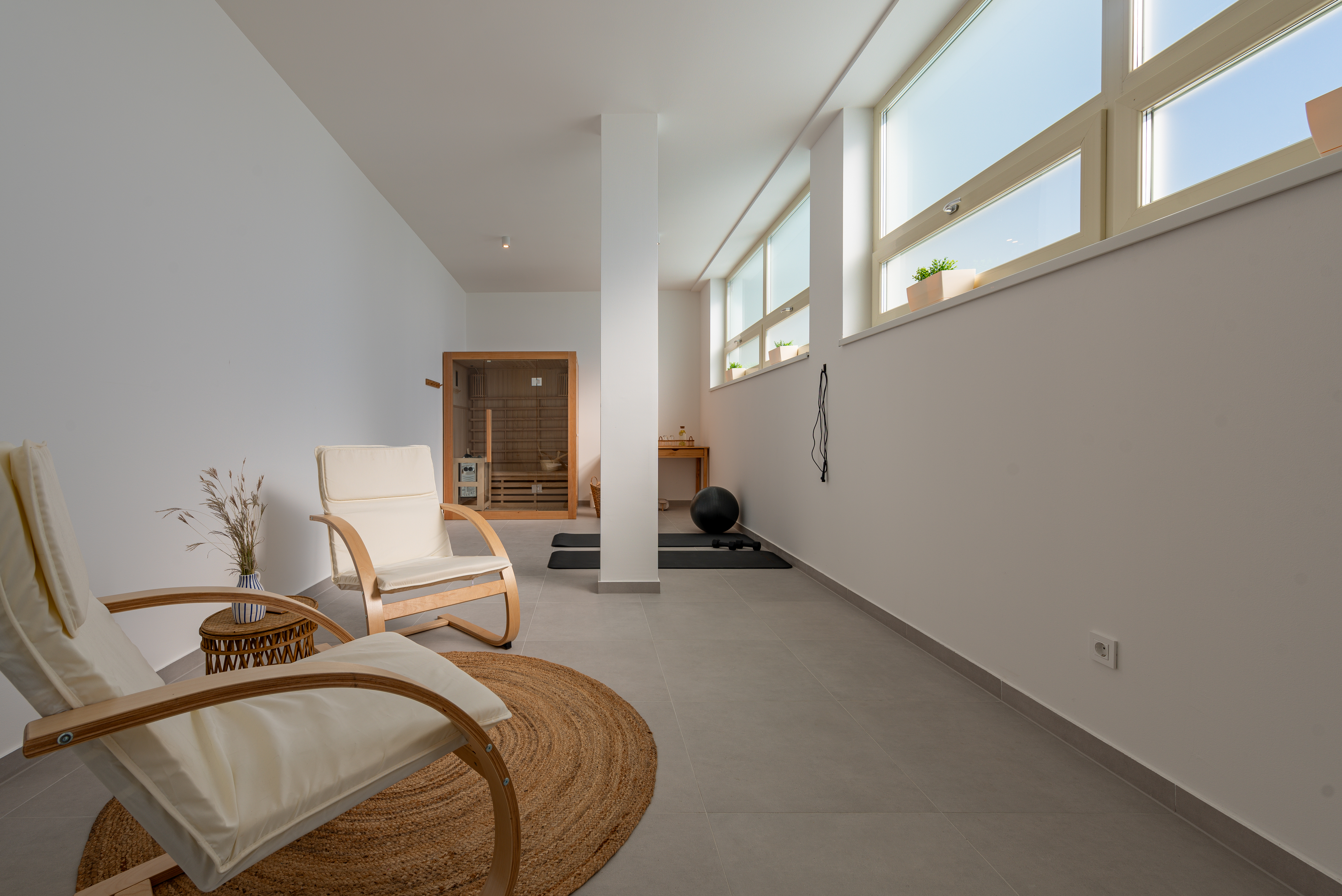 Indoors, the villa is bathed in natural light, thanks to large windows that highlight the light grey tones and wood elements, creating a bright and airy atmosphere. The spacious living room offers a corner sofa and a smart TV, providing the perfect spot to unwind while enjoying the spectacular views. The open-concept kitchen is designed without counters, featuring a large kitchen island with bar stools, making it ideal for socializing while preparing meals. The villa includes two modern bedrooms. The couch in the living room is used as an additional bed for two people. The villa also has two beautifully designed bathrooms with walk-in showers. For ultimate relaxation, a sauna is available, as well as fitness equipment for those looking to stay active. A laundry room and an additional toilet add convenience to this beautiful retreat, ensuring a comfortable and memorable stay.