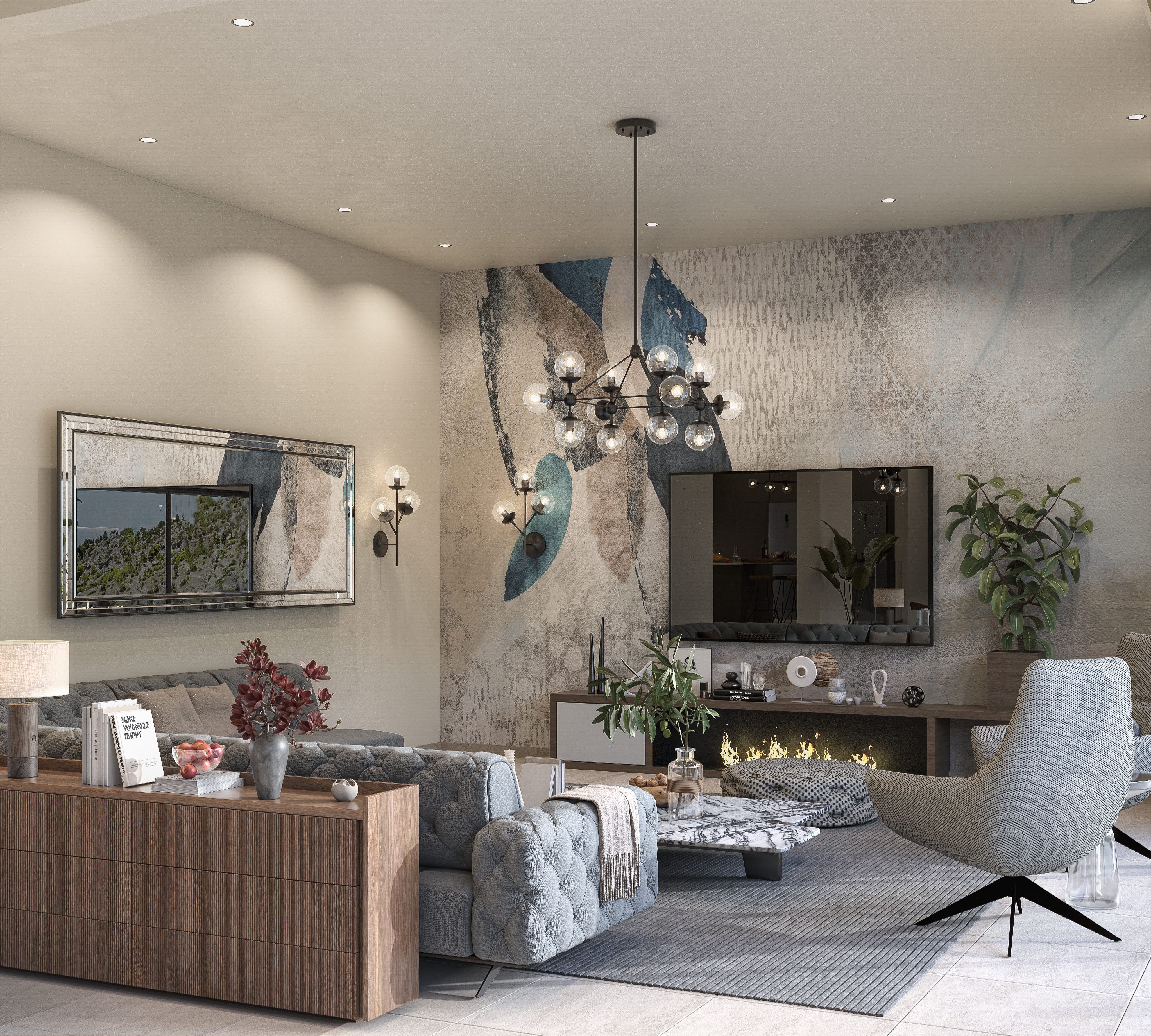 The interior of Villa Residence Grande Mare is spacious, elegant, and thoughtfully designed to provide maximum comfort. The open-plan living area features a stylish living room with a large smart TV, comfortable seating, and an electric fireplace, creating a warm and inviting atmosphere. The modern open-space kitchen is fully equipped with high-end appliances, including multiple ovens, large refrigerators with freezers, a wine fridge, ice maker, dishwasher, and all necessary kitchenware. Adjacent to the kitchen, a generous dining area comfortably accommodates all guests, making it ideal for shared meals and gatherings. Large glass surfaces allow plenty of natural light and connect the interior with the outdoor terrace, pool, and sea views.