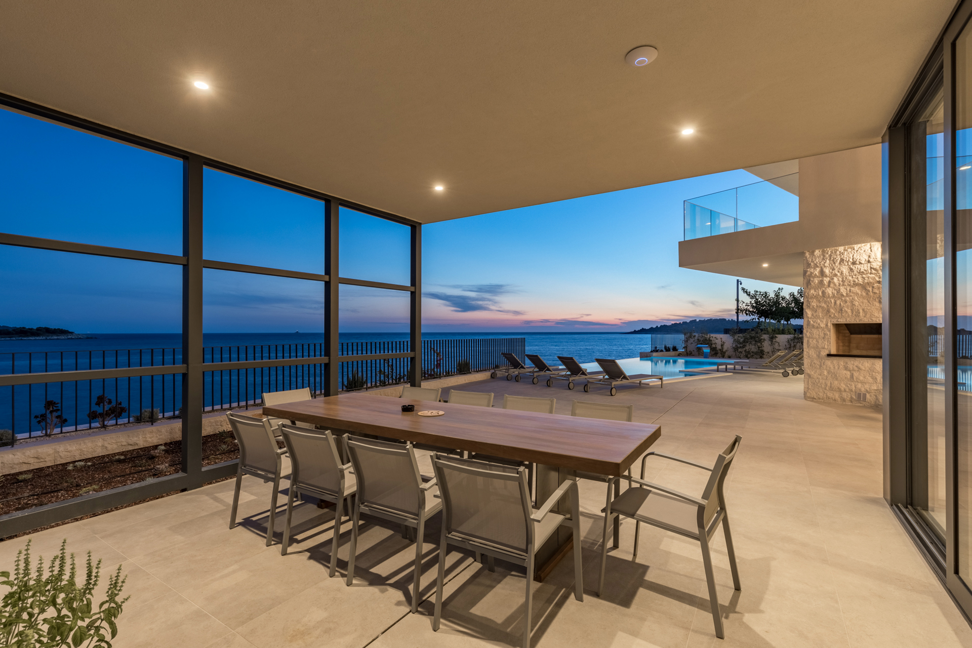 The outdoor area of Villa Valiosa is designed for ultimate enjoyment. A 55 m² saltwater infinity pool with a waterfall, integrated massage jets, and pool heating invites guests to unwind while admiring the panoramic sea views. Around the pool, guests can relax on comfortable sun loungers, enjoy a drink in the outdoor seating area, or prepare meals in the fully equipped barbecue area. The large outdoor dining table is perfect for family gatherings and dinners under the Mediterranean sky.