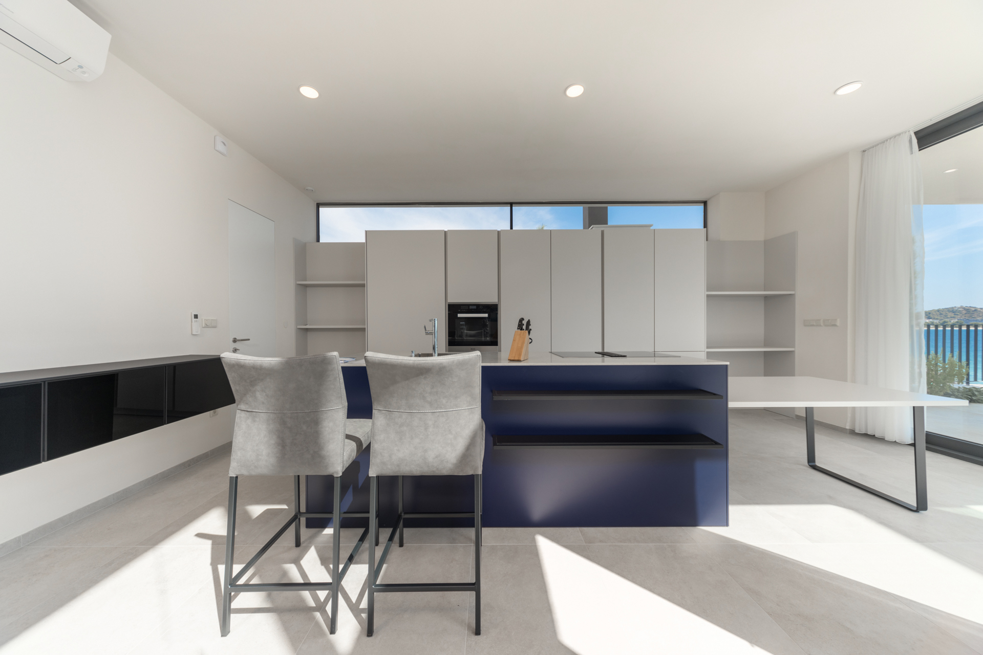 The spacious and open-plan ground floor with a gallery is filled with natural light and offers stunning sea views. The main living area includes a bright and modern living room, a fully equipped kitchen, and a stylish indoor dining area that connects seamlessly to the terrace and pool area. This level also includes a cloakroom, a separate guest toilet, and a utility room equipped with a washing machine, dryer, and an additional shower—providing added convenience for longer stays. A disability-access bedroom with its own en-suite bathroom and sea view ensures accessibility and comfort for all guests.