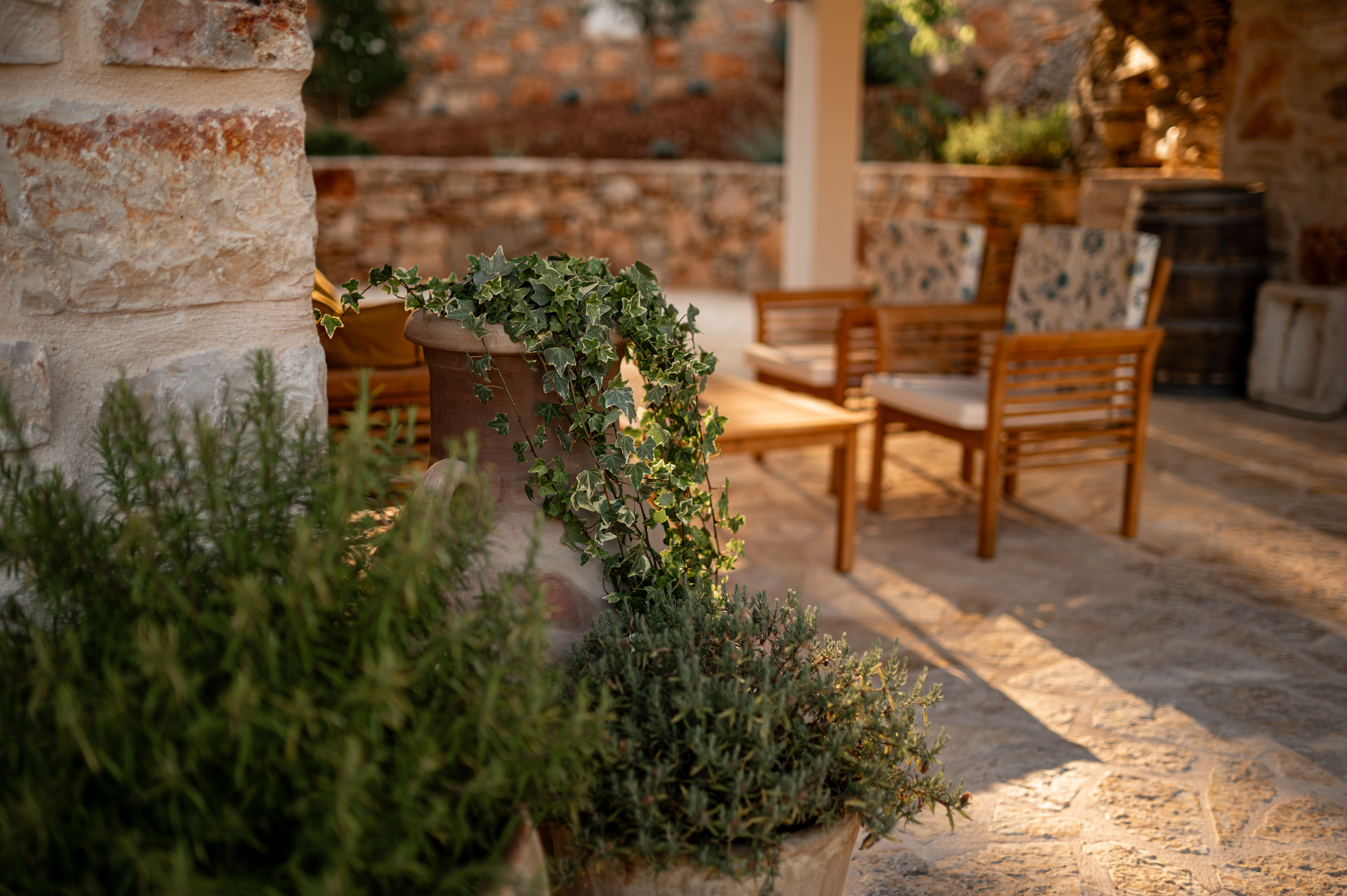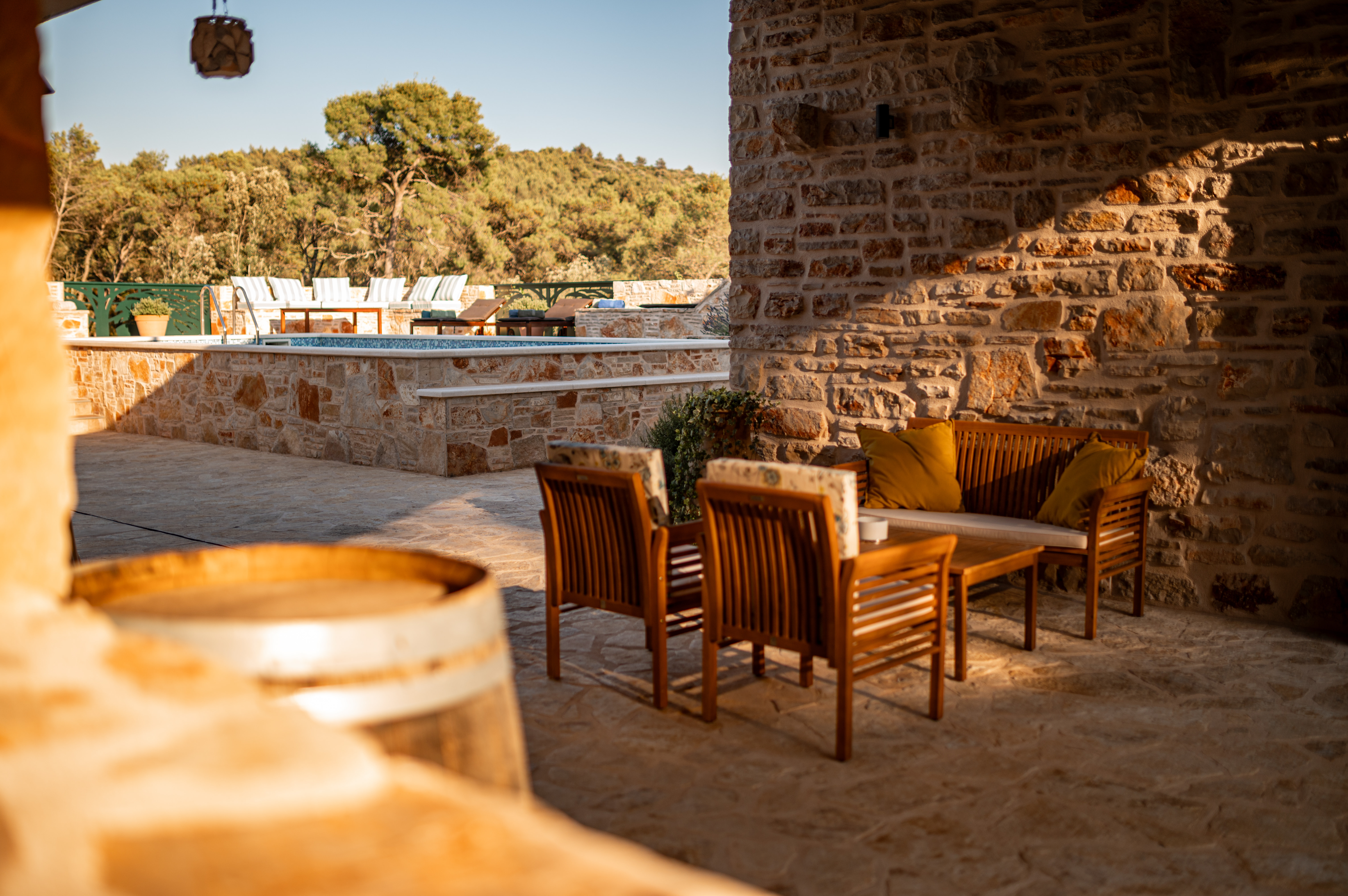 Vila je ograđena zidom koji osigurava potpunu privatnost i mir. Okućnica od 1500 m² poziva na opuštanje i uživanje. Grijani bazen, veličine 32 m², nudi osvježenje, a na raspolaganju su ležaljke za upijanje topline sunčevih zraka dok slušate umirujuće zvukove prekrasne prirode koja vas okružuje. Osvježiti se možete i pod vanjskim tušem pored bazena. Vila ima potpuno opremljenu vanjsku kuhinju i blagovaonicu, savršeno mjesto za obroke na otvorenom. Tu je i roštilj i kamin, kao i vanjski WC.