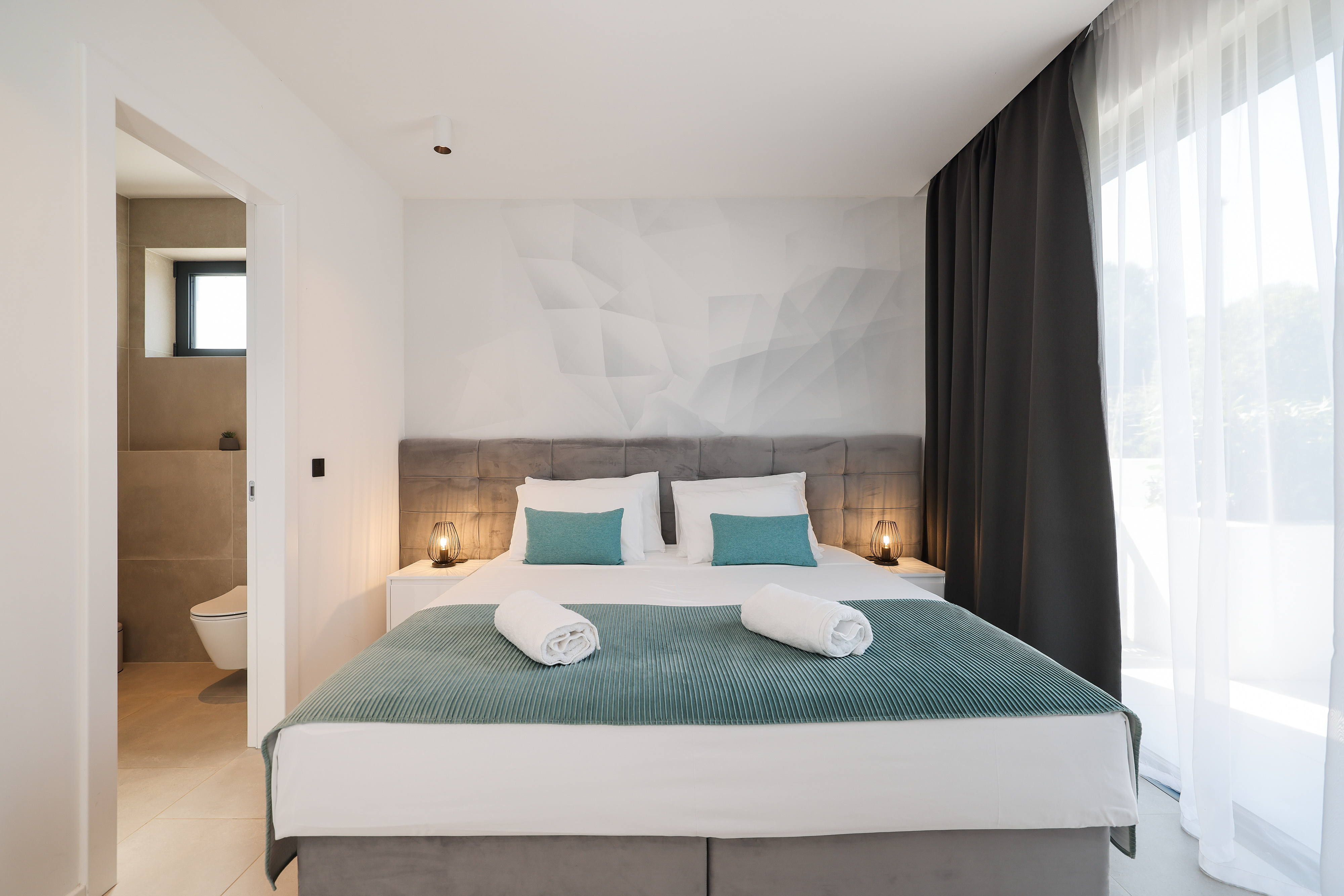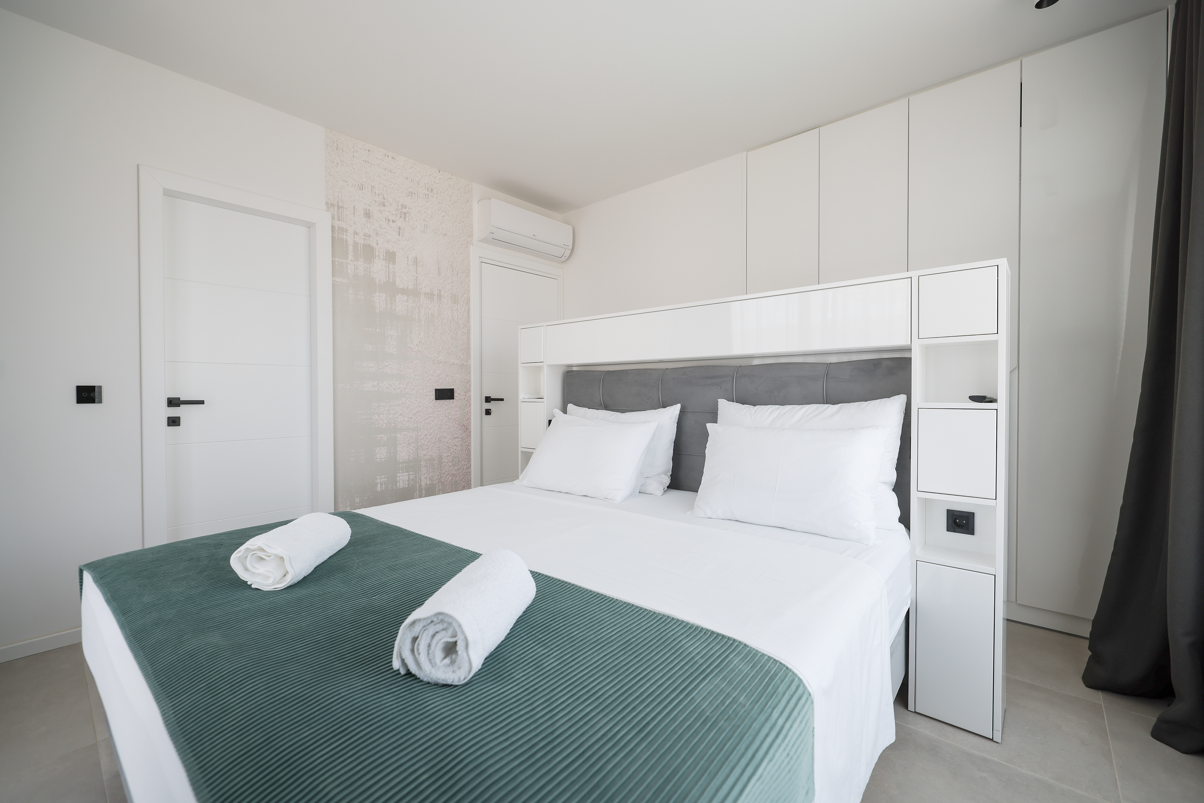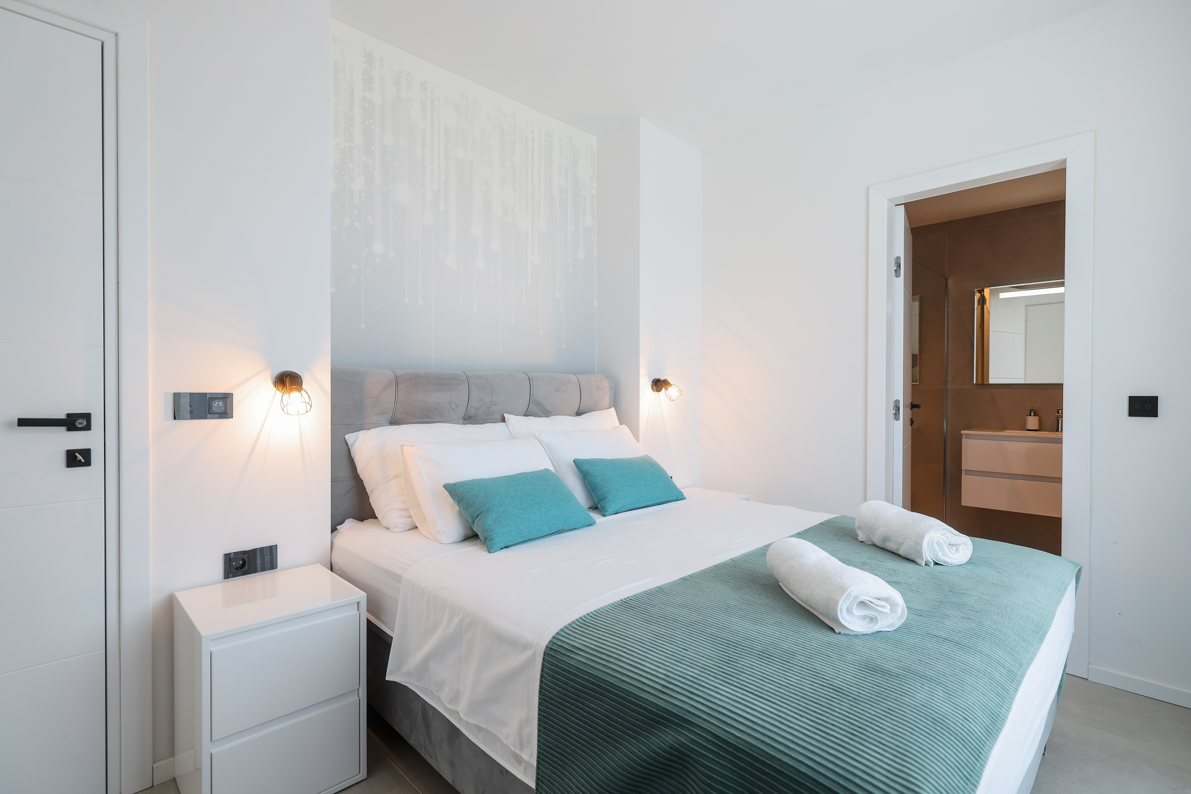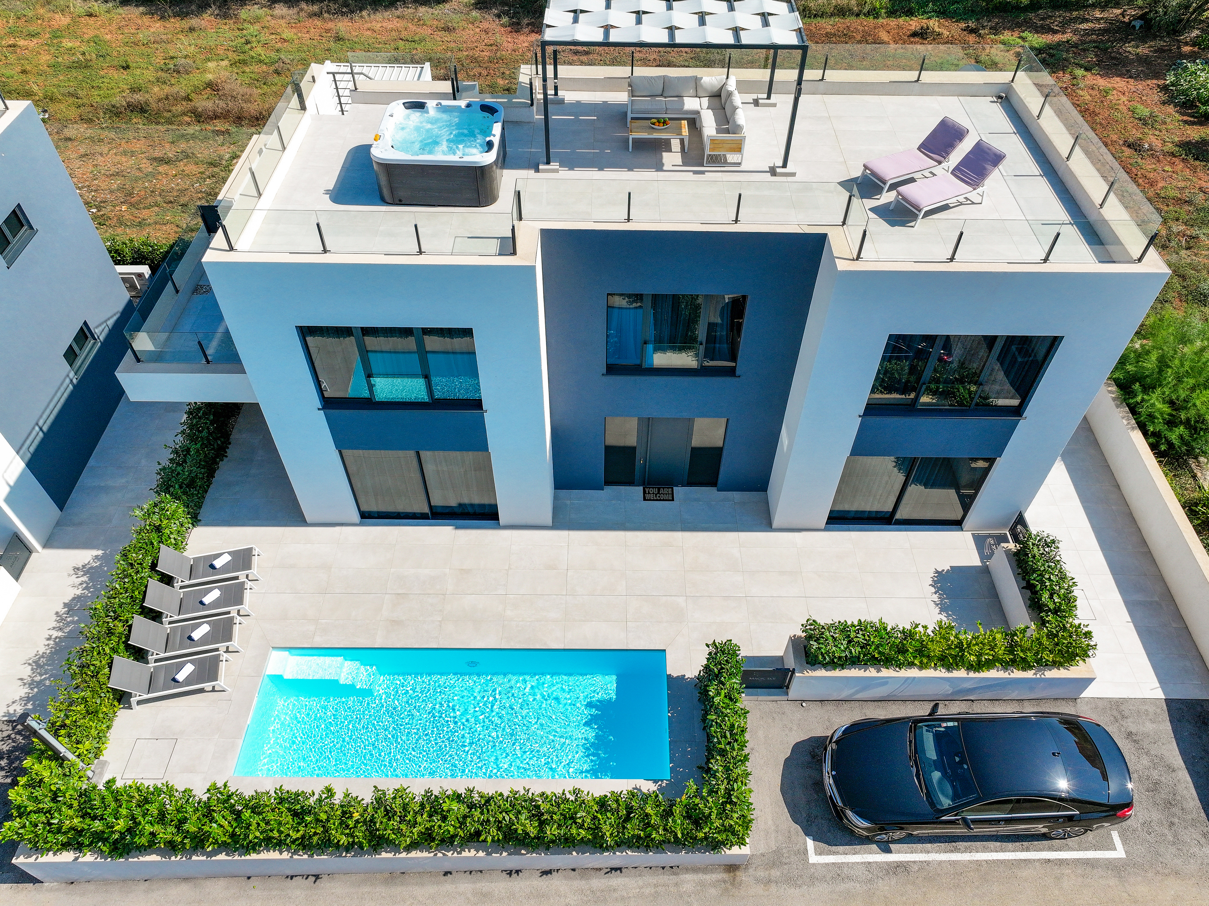 Villa Magic Sky 2 prostire se na 180 m² unutarnjeg prostora unutar privatne, ograđene parcele površine 360 m². Dizajnirana za obitelji i grupe prijatelja, vila može ugostiti do 8 osoba u 4 prekrasno namještene spavaće sobe, svaka s vlastitom kupaonicom. Vila nudi grijani privatni bazen, krovnu terasu s jacuzzijem te zajedničku teretanu i dječje igralište koje dijeli sa susjednom vilom, Villa Magic Sky 1.