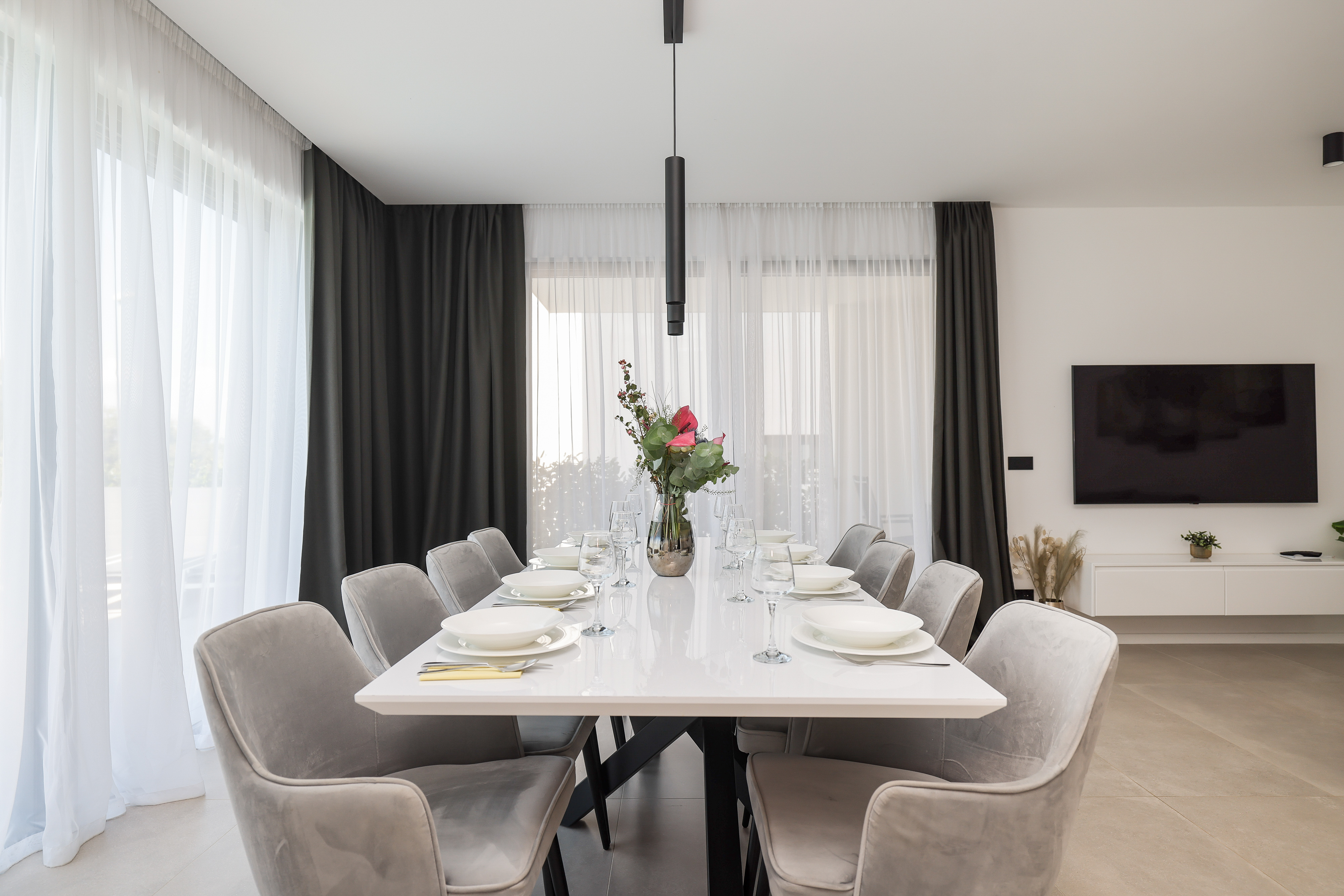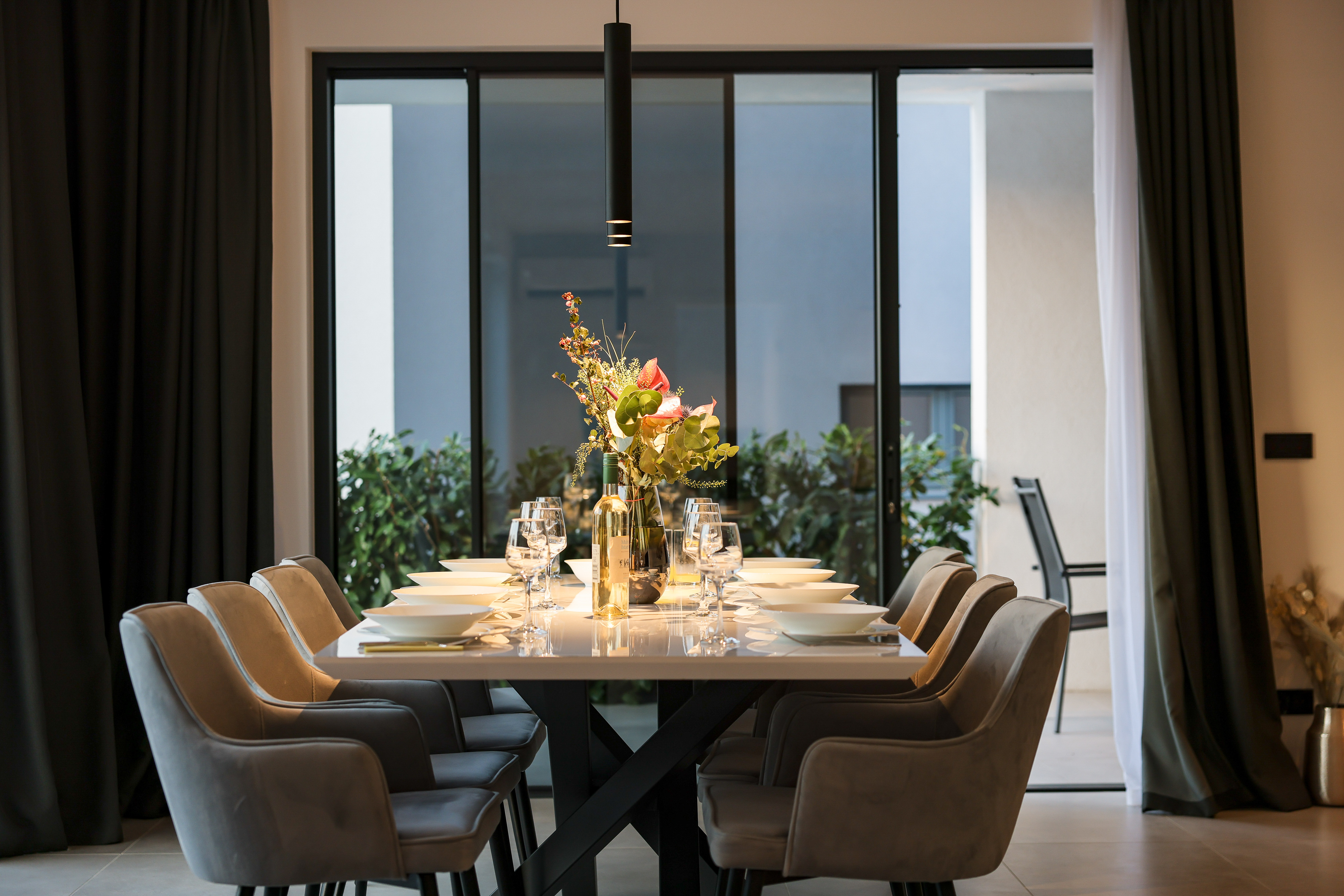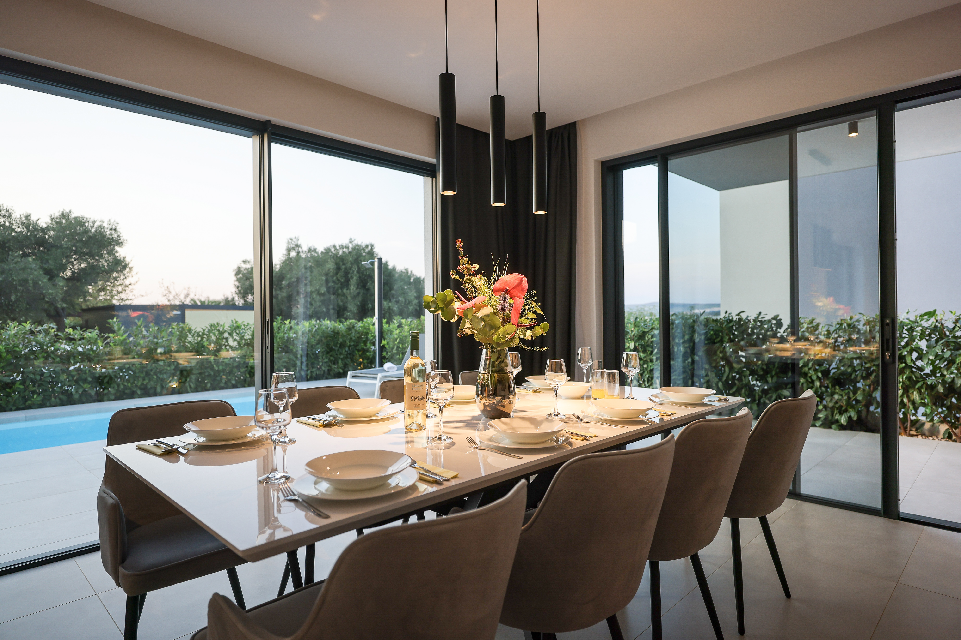 Unutrašnjost vile odiše modernim stilom i udobnošću. Prostrani dnevni boravak s pametnim TV-om izravno se otvara na terasu s bazenom te je povezan s potpuno opremljenom kuhinjom i blagovaonicom. Kuhinja uključuje perilicu posuđa, mikrovalnu pećnicu, kuhalo za vodu, toster, mikser, blender i aparat za kavu. Gostima su također na raspolaganju perilica i sušilica rublja, glačalo i daska za glačanje. Sve četiri spavaće sobe opremljene su bračnim krevetima (tri 180x200 cm i jedan 160x200 cm), pametnim TV-ima i klima-uređajima, a svaka ima vlastitu kupaonicu. Gostima su osigurani ručnici, posteljina i sušila za kosu. Obitelji s malom djecom mogu koristiti dječji krevetić i hranilicu.