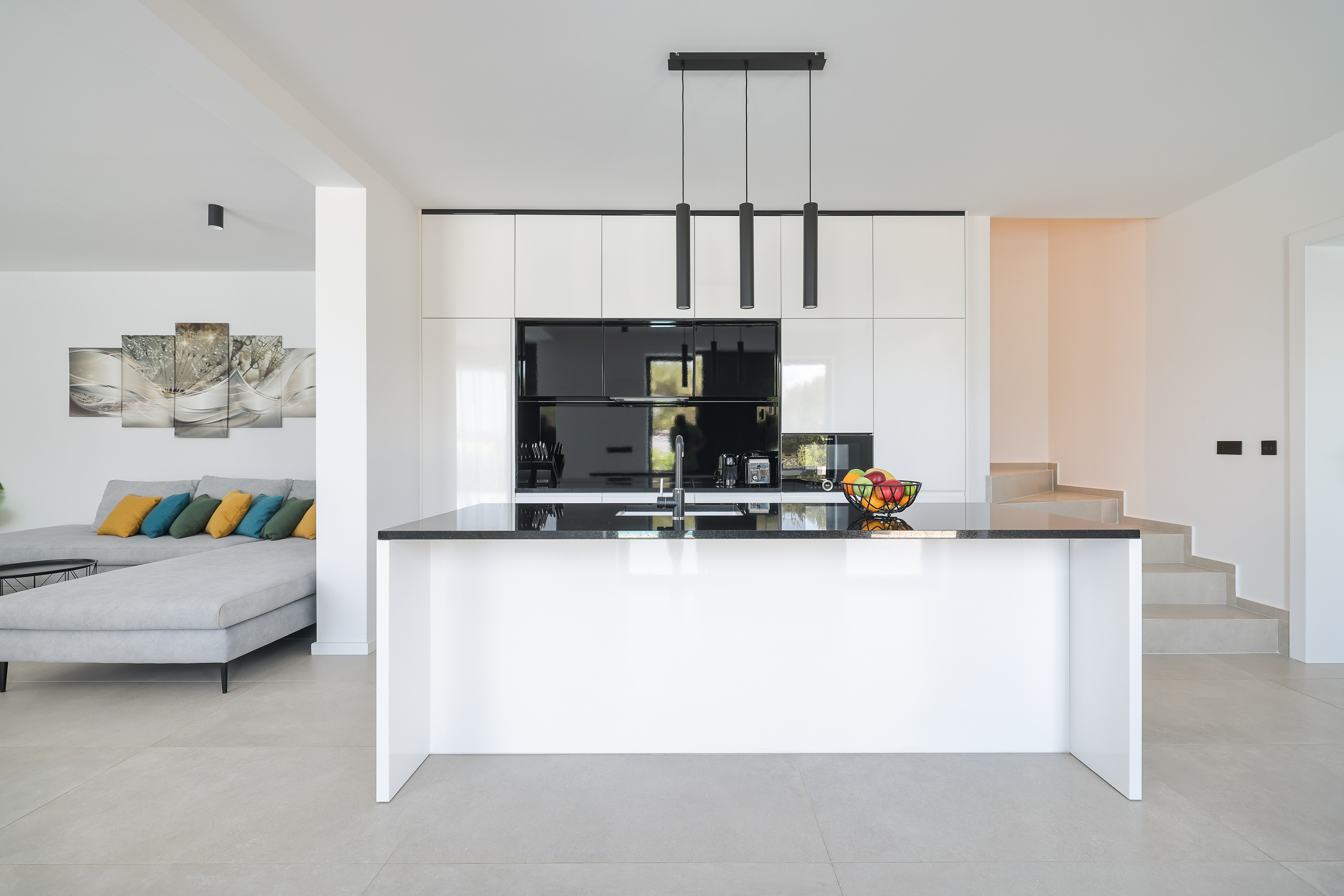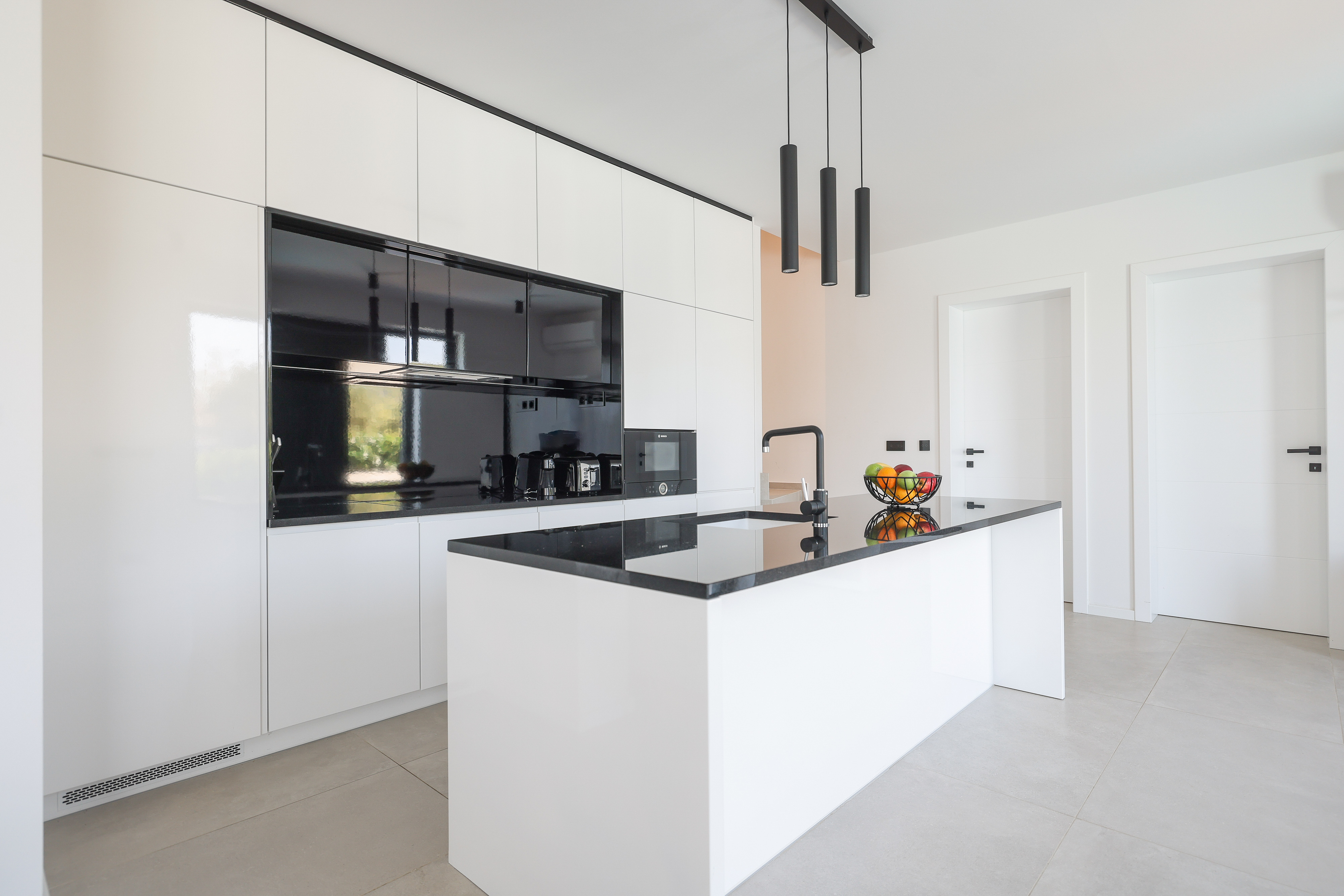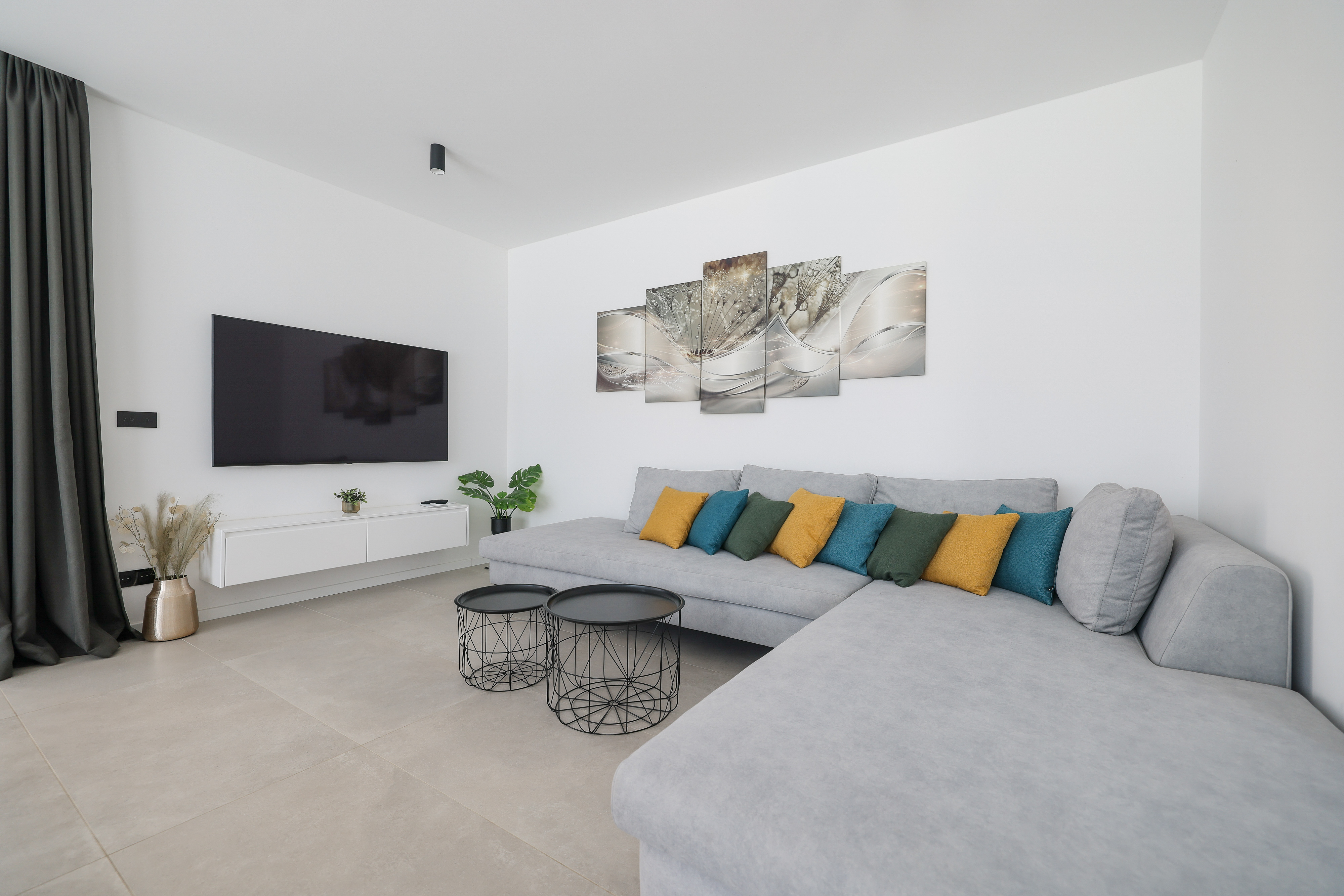Unutrašnjost vile odiše modernim stilom i udobnošću. Prostrani dnevni boravak s pametnim TV-om izravno se otvara na terasu s bazenom te je povezan s potpuno opremljenom kuhinjom i blagovaonicom. Kuhinja uključuje perilicu posuđa, mikrovalnu pećnicu, kuhalo za vodu, toster, mikser, blender i aparat za kavu. Gostima su također na raspolaganju perilica i sušilica rublja, glačalo i daska za glačanje. Sve četiri spavaće sobe opremljene su bračnim krevetima (tri 180x200 cm i jedan 160x200 cm), pametnim TV-ima i klima-uređajima, a svaka ima vlastitu kupaonicu. Gostima su osigurani ručnici, posteljina i sušila za kosu. Obitelji s malom djecom mogu koristiti dječji krevetić i hranilicu.
