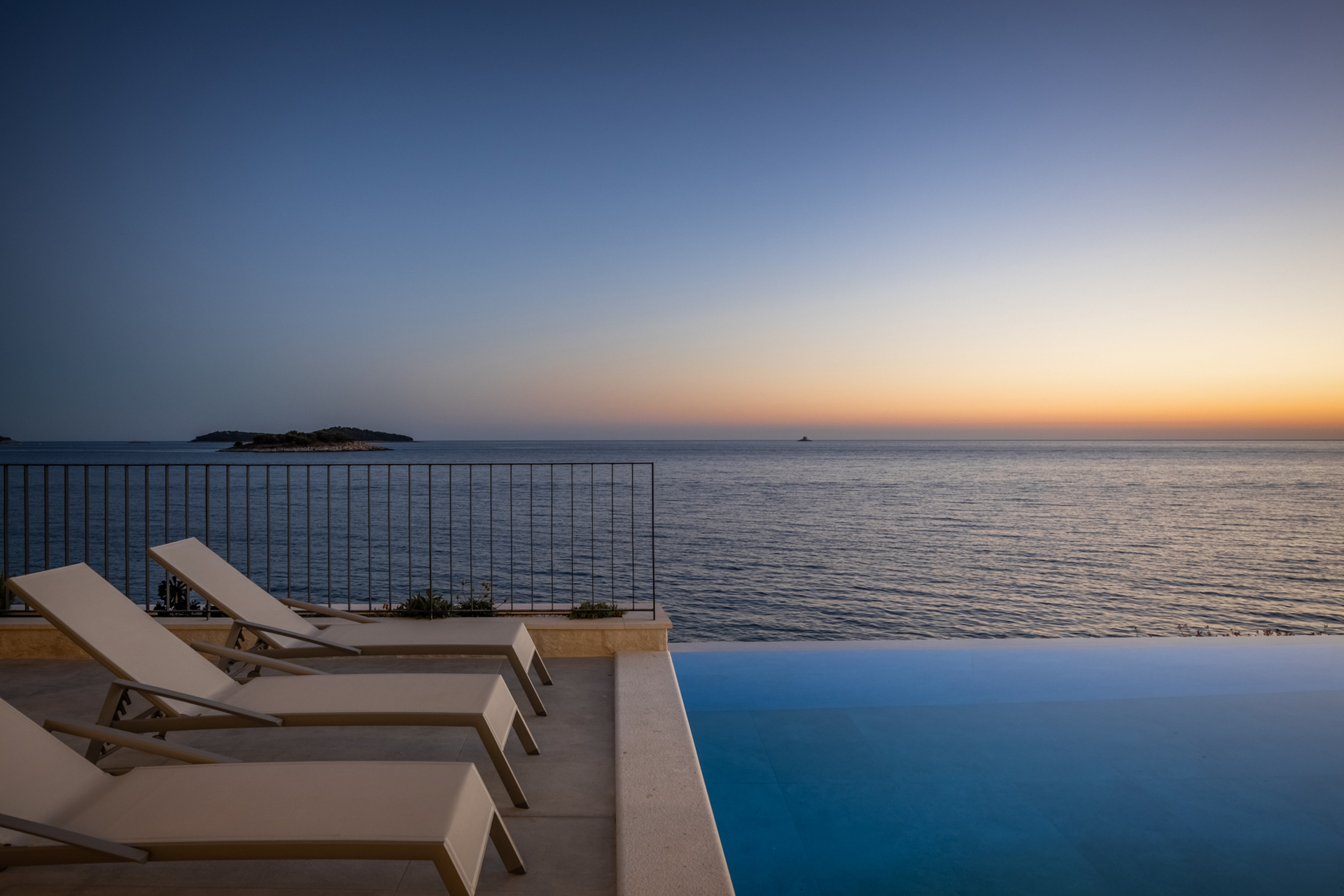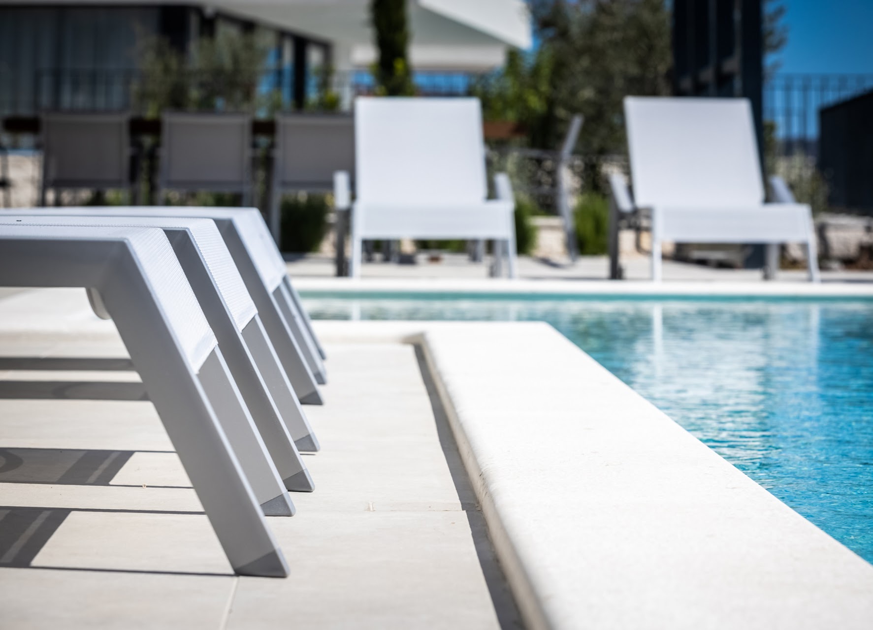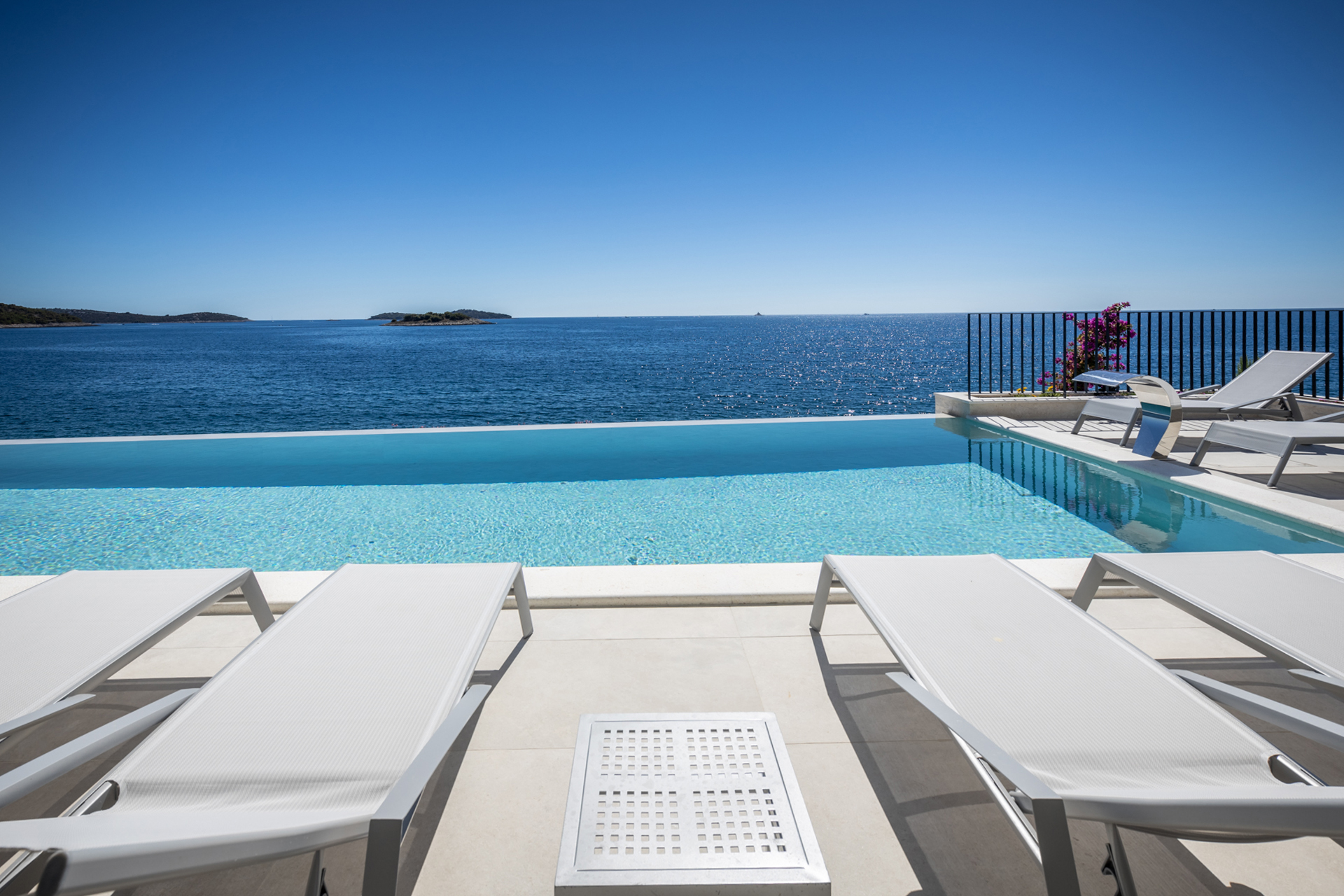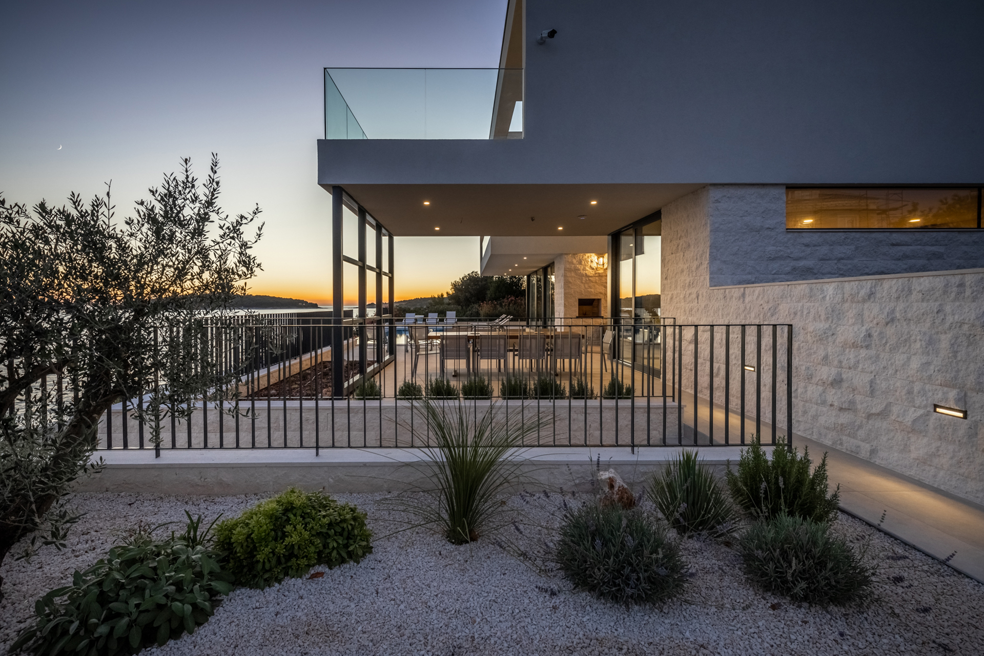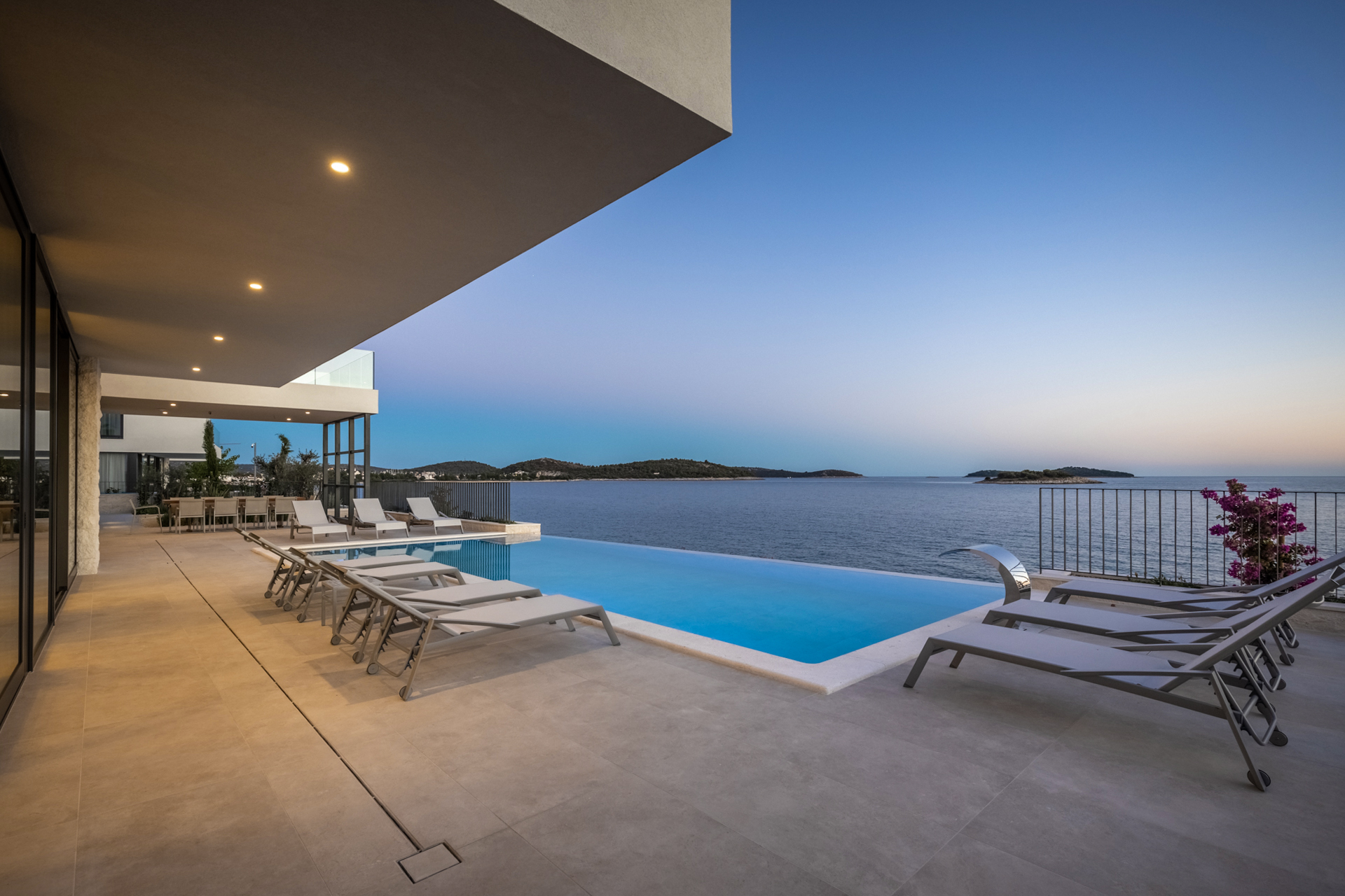 Vanjski prostor vile osmišljen je za potpunu relaksaciju i druženje. Infinity bazen sa slanom vodom površine 50 m² s integriranim masažnim mlaznicama, vodopadom i grijanjem bazena poziva goste na opuštanje uz panoramski pogled na more. Ležaljke i udoban vanjski namještaj stvaraju savršeno okruženje za sunčanje ili popodnevni odmor. Potpuno opremljena zona za roštilj i veliki vanjski stol za blagovanje omogućuju uživanje u obrocima na otvorenom s obitelji i prijateljima.