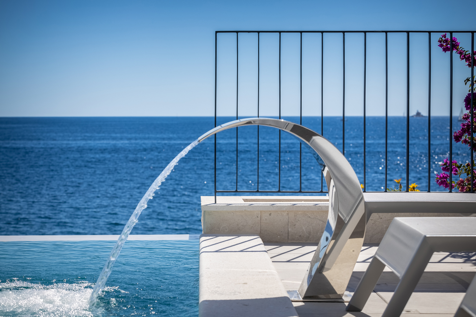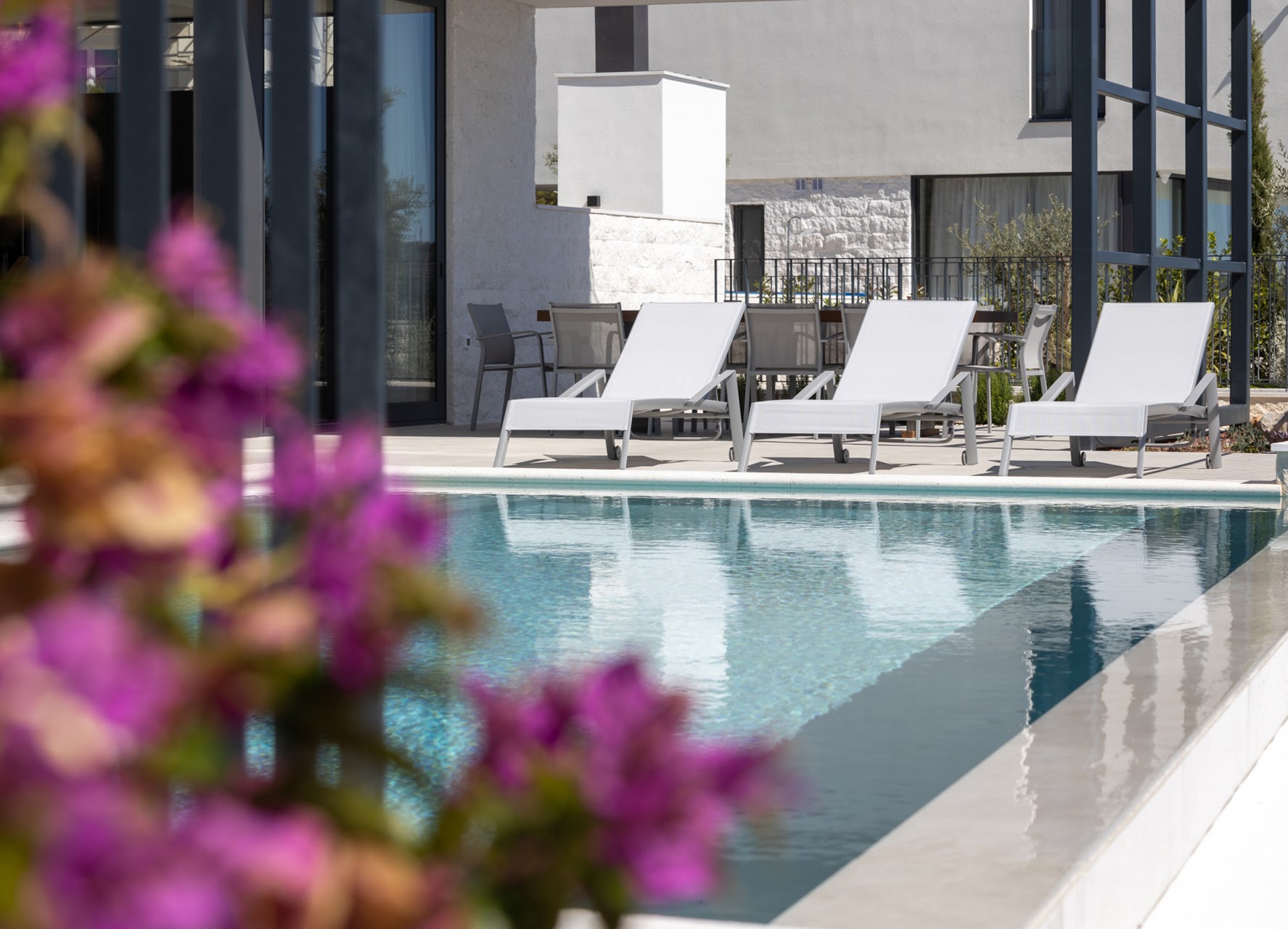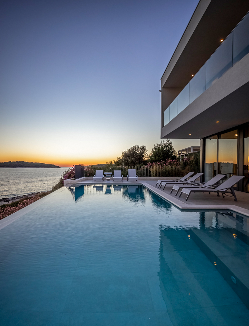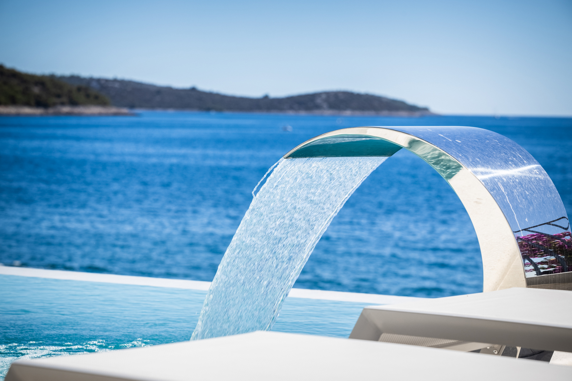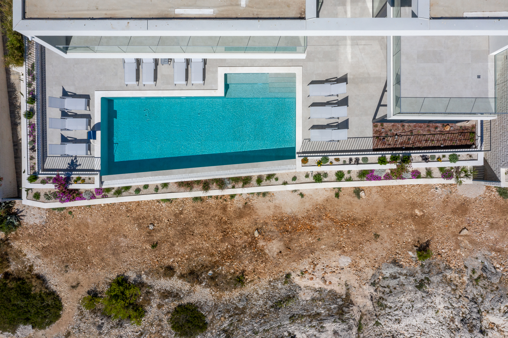 Vanjski prostor vile osmišljen je za potpunu relaksaciju i druženje. Infinity bazen sa slanom vodom površine 50 m² s integriranim masažnim mlaznicama, vodopadom i grijanjem bazena poziva goste na opuštanje uz panoramski pogled na more. Ležaljke i udoban vanjski namještaj stvaraju savršeno okruženje za sunčanje ili popodnevni odmor. Potpuno opremljena zona za roštilj i veliki vanjski stol za blagovanje omogućuju uživanje u obrocima na otvorenom s obitelji i prijateljima.