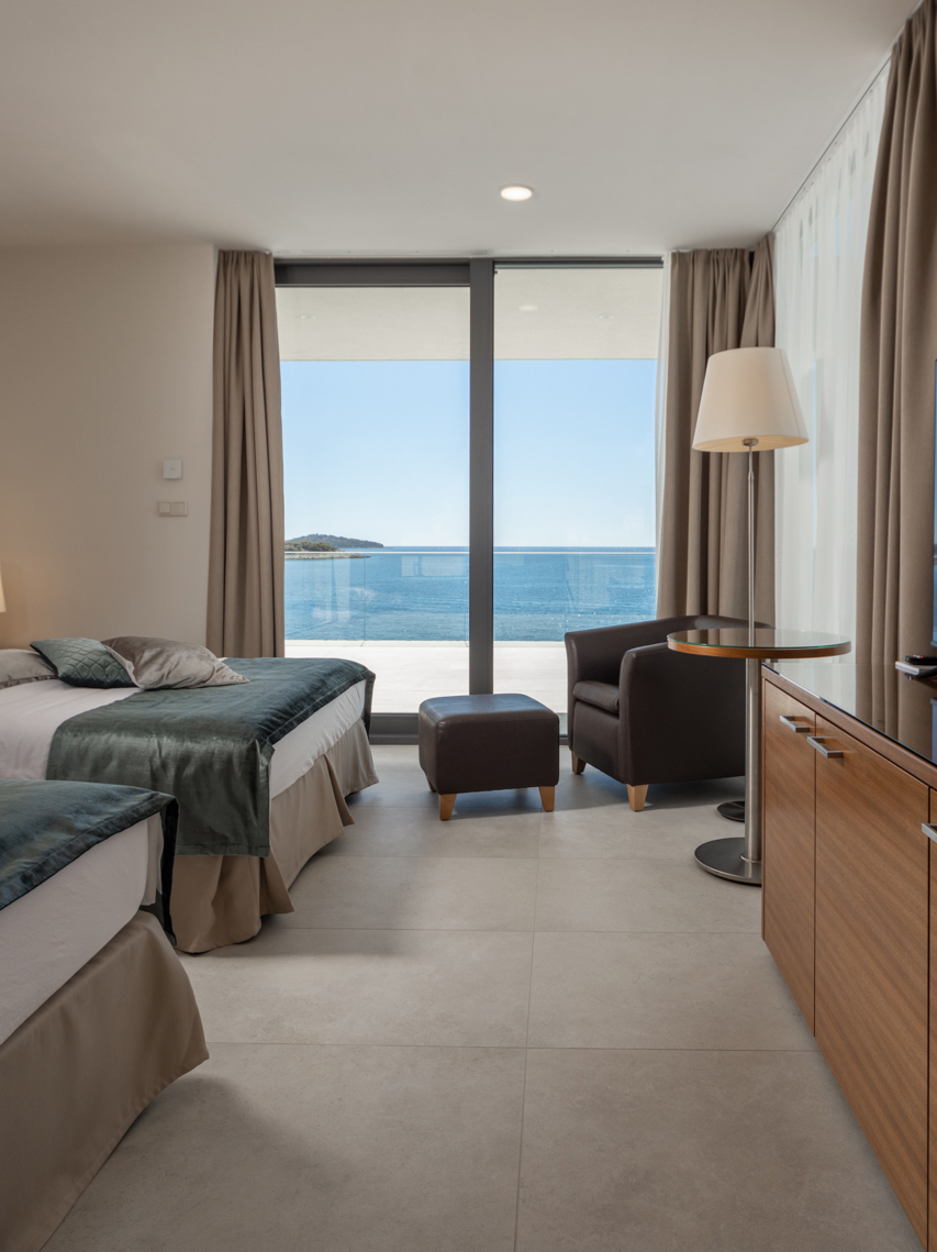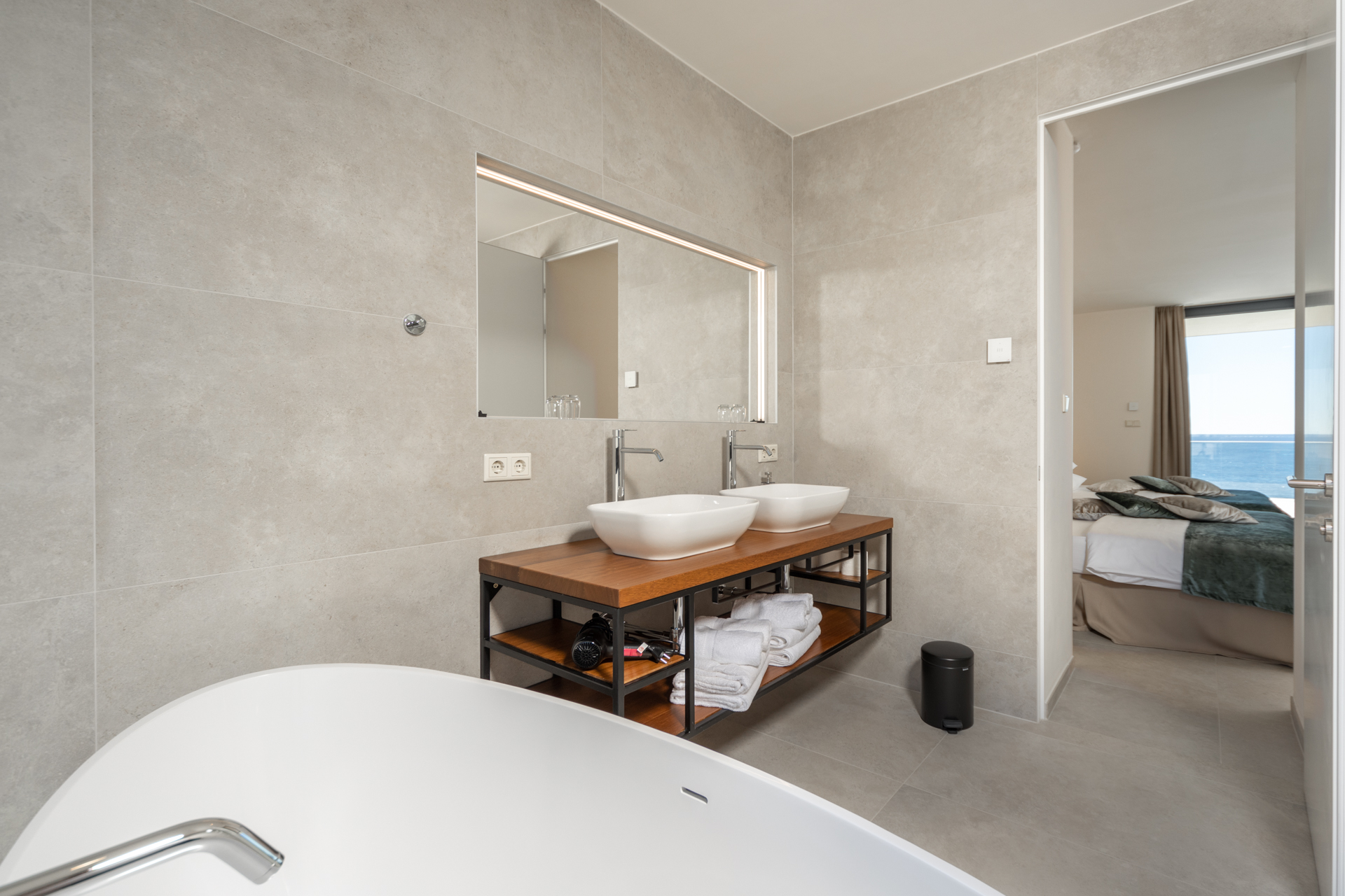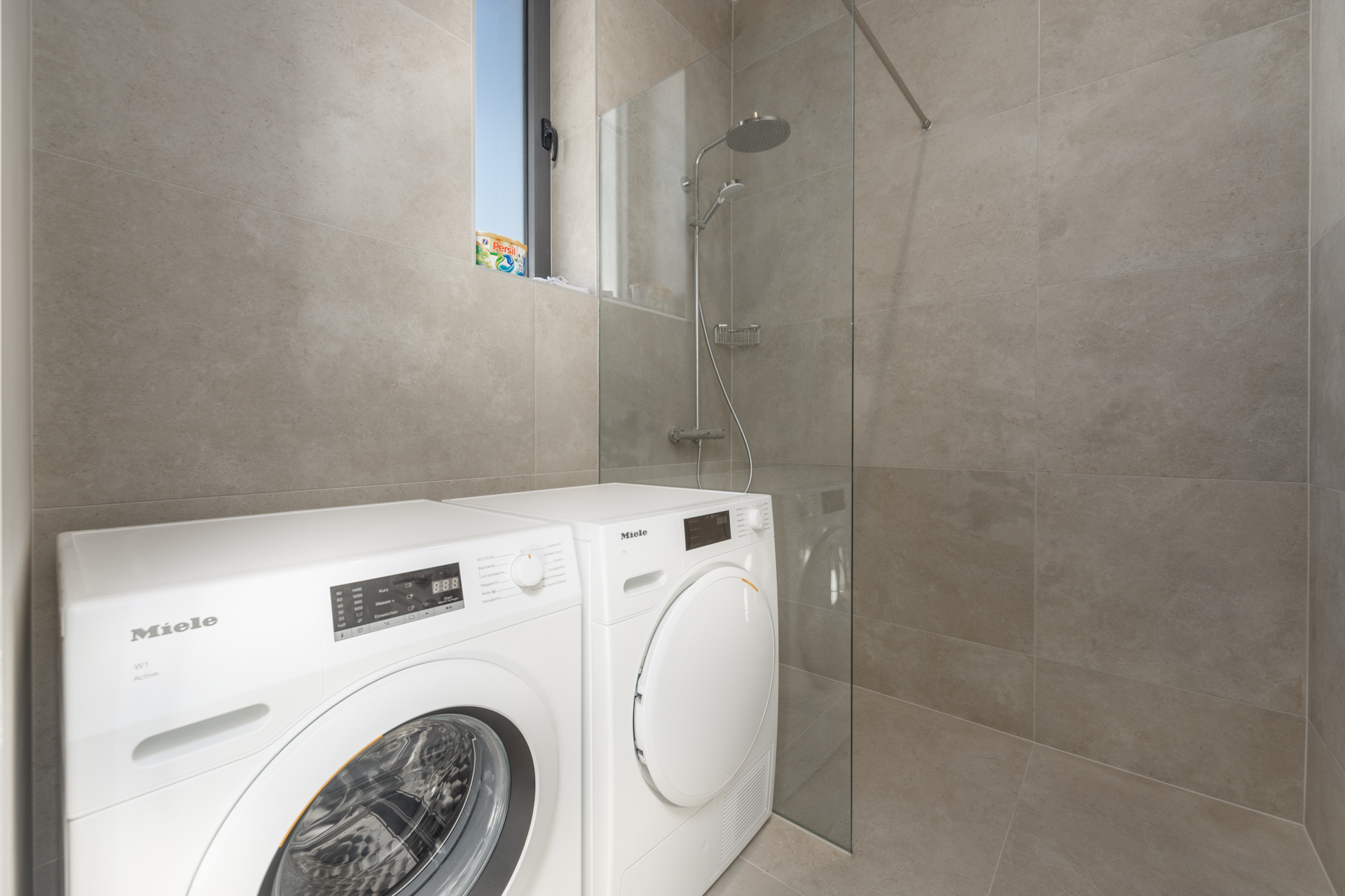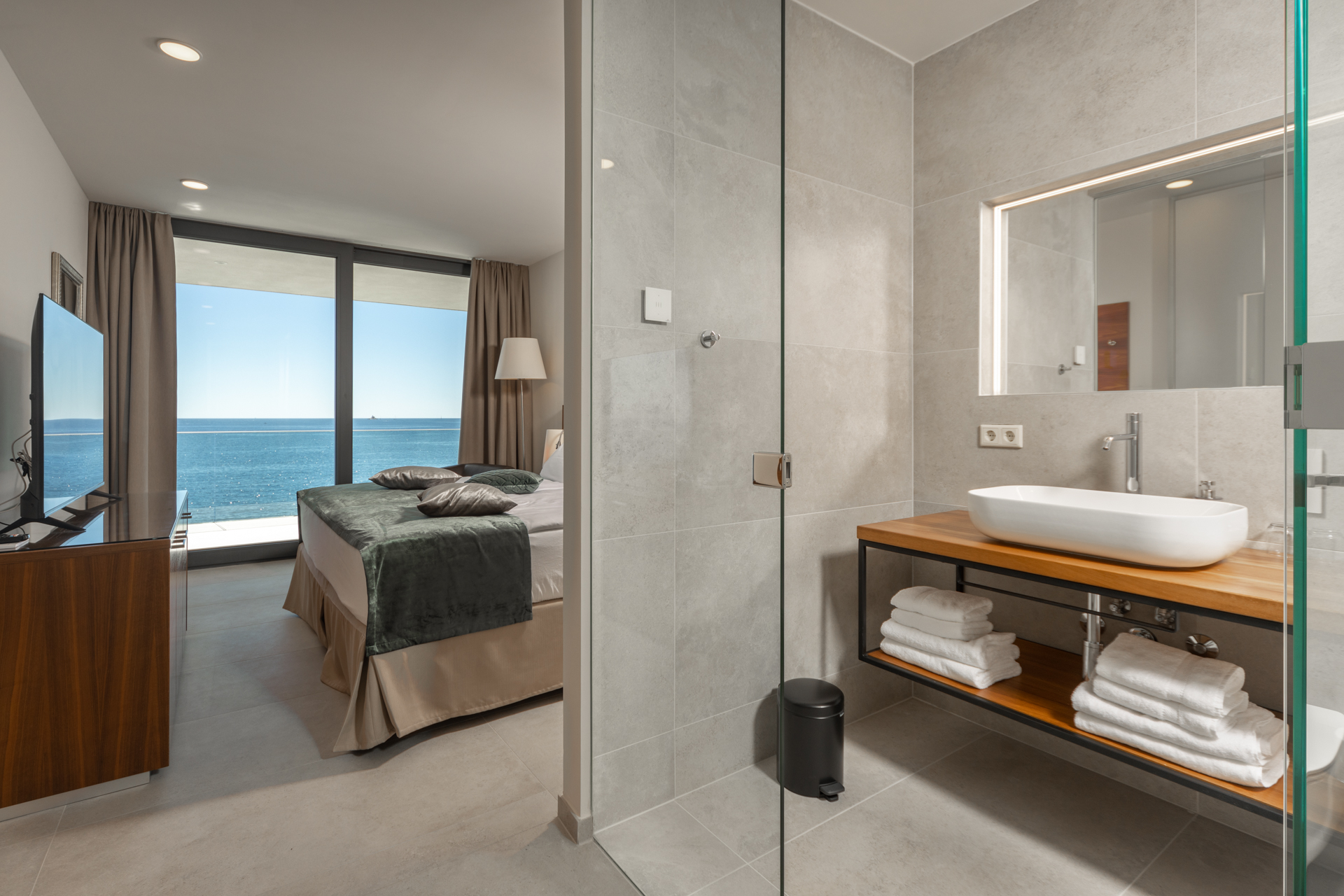 Otvoreni tlocrt prizemlja Vile Marvella dizajniran je za udobnost i jednostavan pristup. Sastoji se od svijetlog dnevnog boravka s prekrasnim pogledom na more, potpuno opremljene moderne kuhinje i unutarnje blagovaonice elegantnog dizajna. Na ovoj etaži nalazi se i garderoba te gostinjski toalet. Prizemlje uključuje i sobu prilagođenu osobama s invaliditetom s privatnom kupaonicom i pogledom na more, čime se osigurava udobnost i pristupačnost za sve goste. Za dodatnu praktičnost, gostima je na raspolaganju praonica rublja opremljena perilicom, sušilicom i dodatnim tušem — idealno za duži boravak ili nakon dana provedenog na plaži.