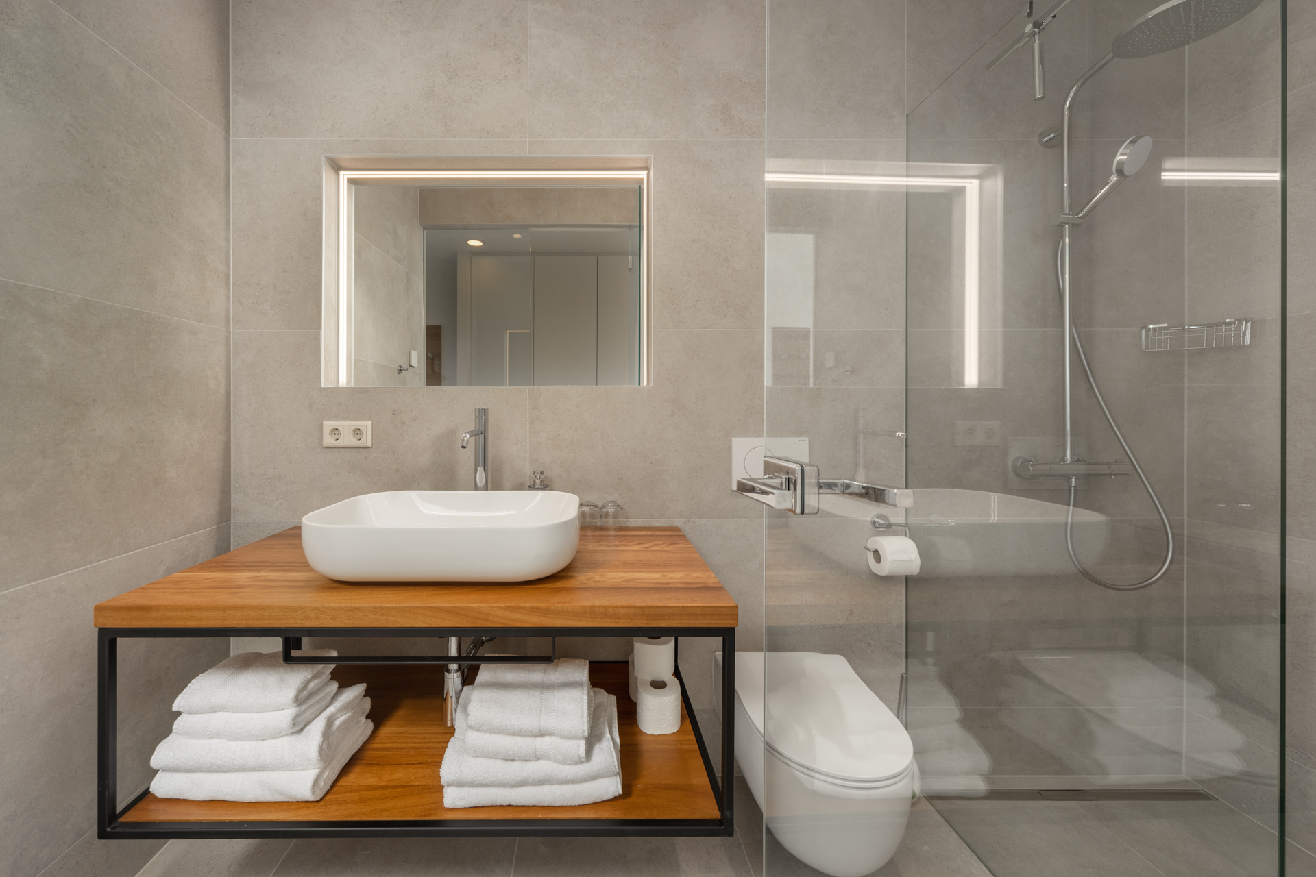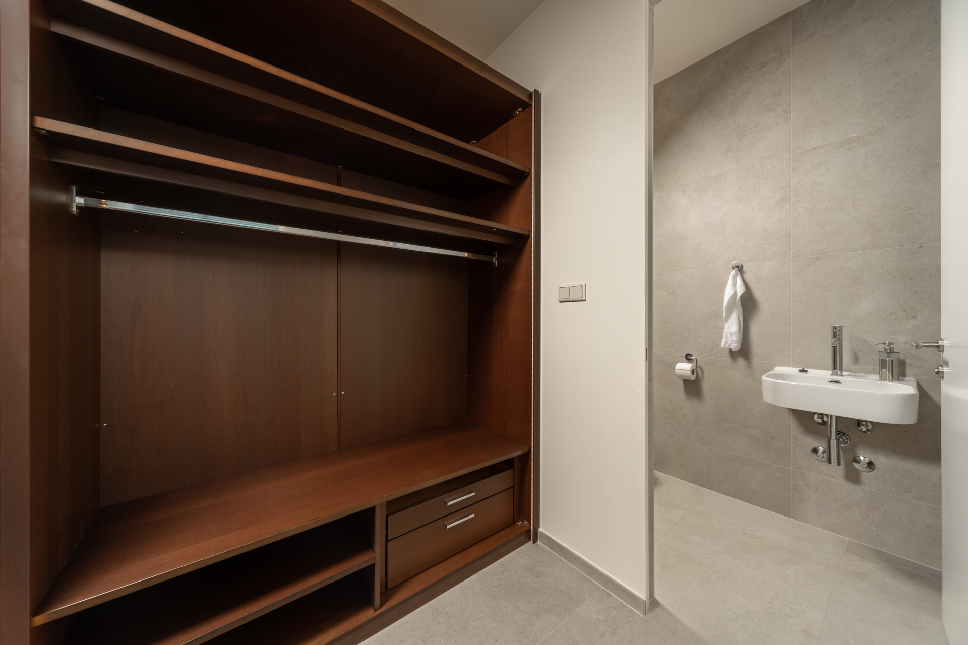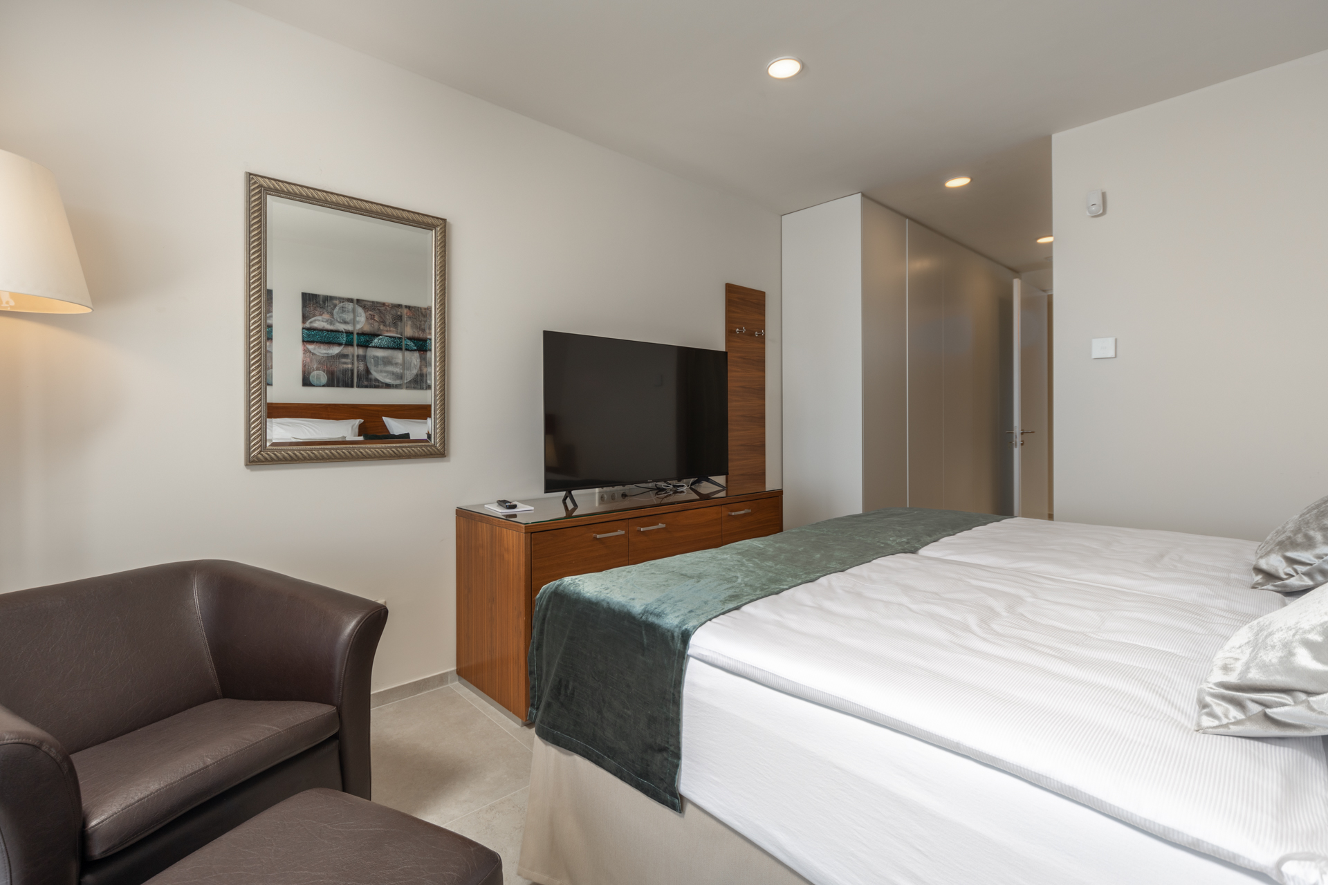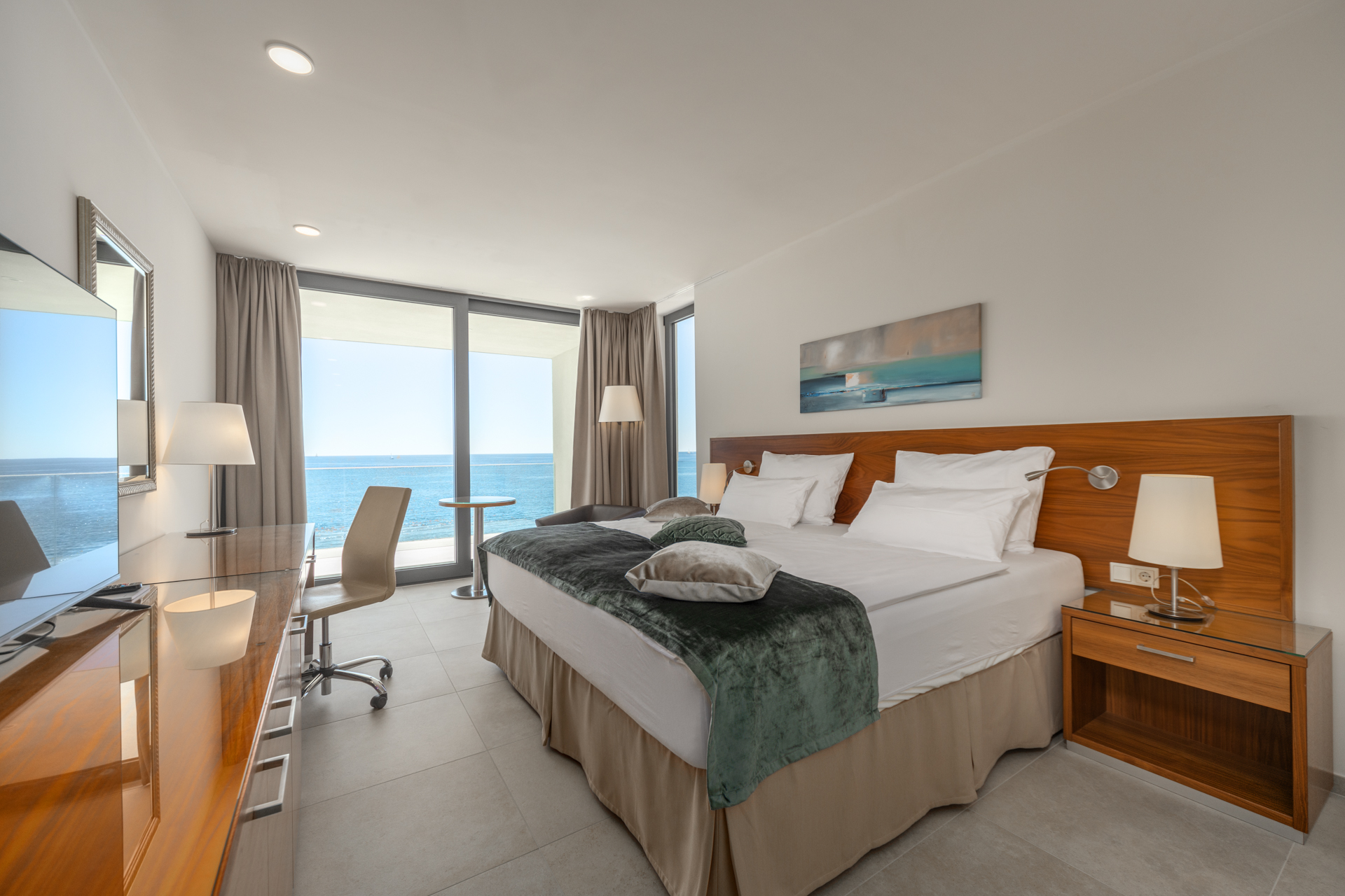 Otvoreni tlocrt prizemlja Vile Marvella dizajniran je za udobnost i jednostavan pristup. Sastoji se od svijetlog dnevnog boravka s prekrasnim pogledom na more, potpuno opremljene moderne kuhinje i unutarnje blagovaonice elegantnog dizajna. Na ovoj etaži nalazi se i garderoba te gostinjski toalet. Prizemlje uključuje i sobu prilagođenu osobama s invaliditetom s privatnom kupaonicom i pogledom na more, čime se osigurava udobnost i pristupačnost za sve goste. Za dodatnu praktičnost, gostima je na raspolaganju praonica rublja opremljena perilicom, sušilicom i dodatnim tušem — idealno za duži boravak ili nakon dana provedenog na plaži.